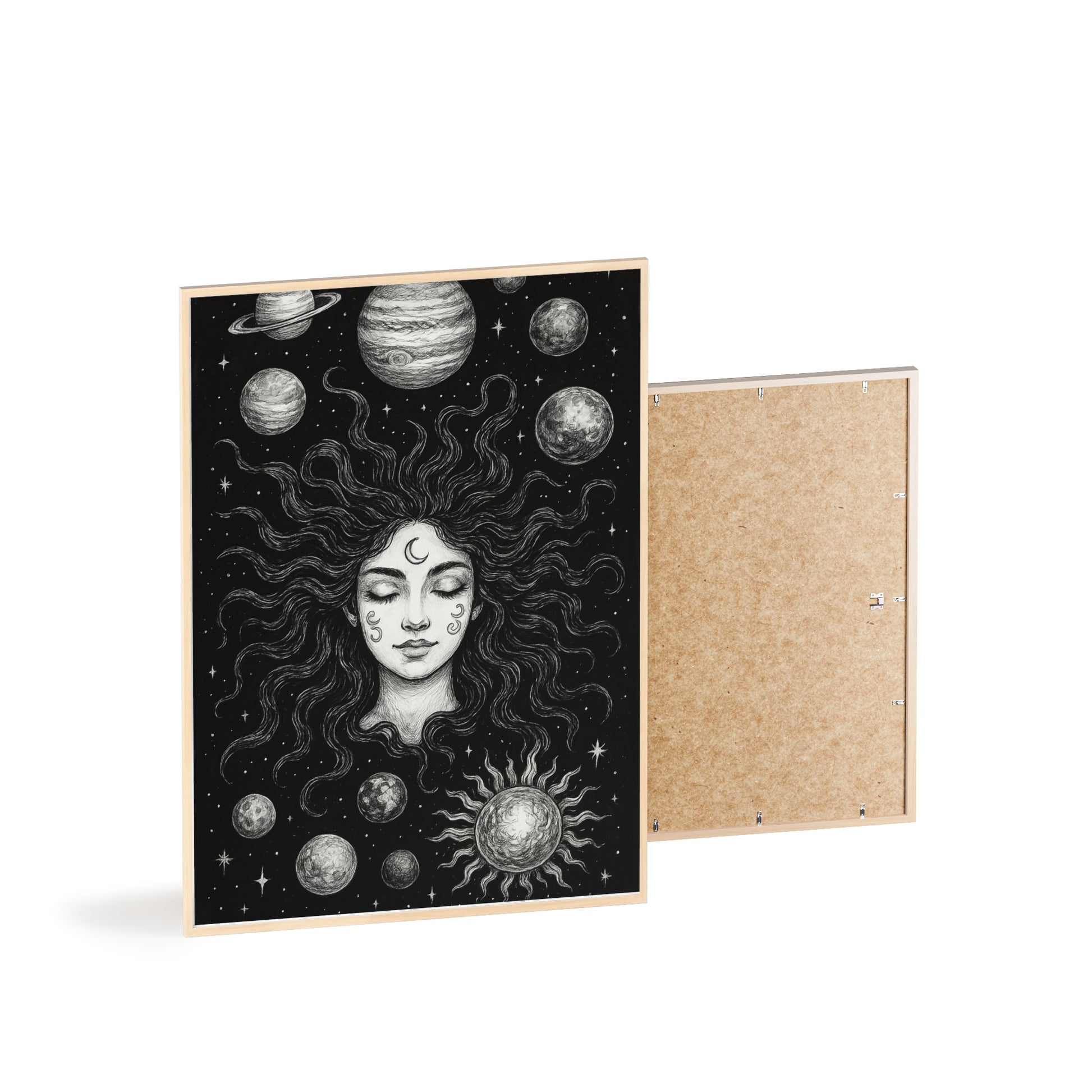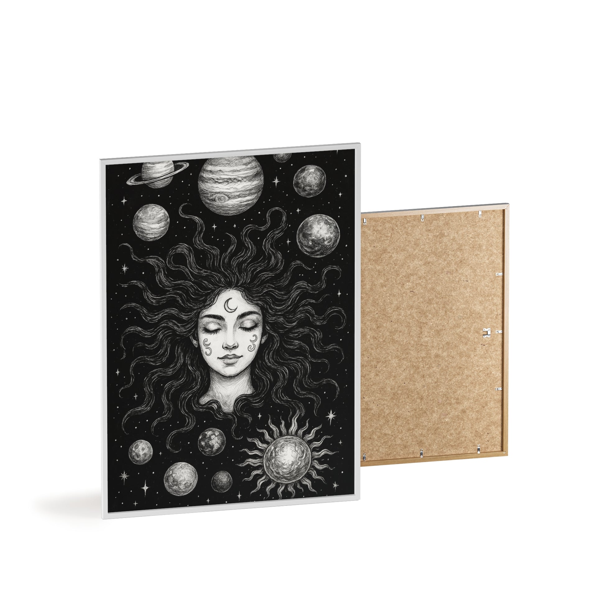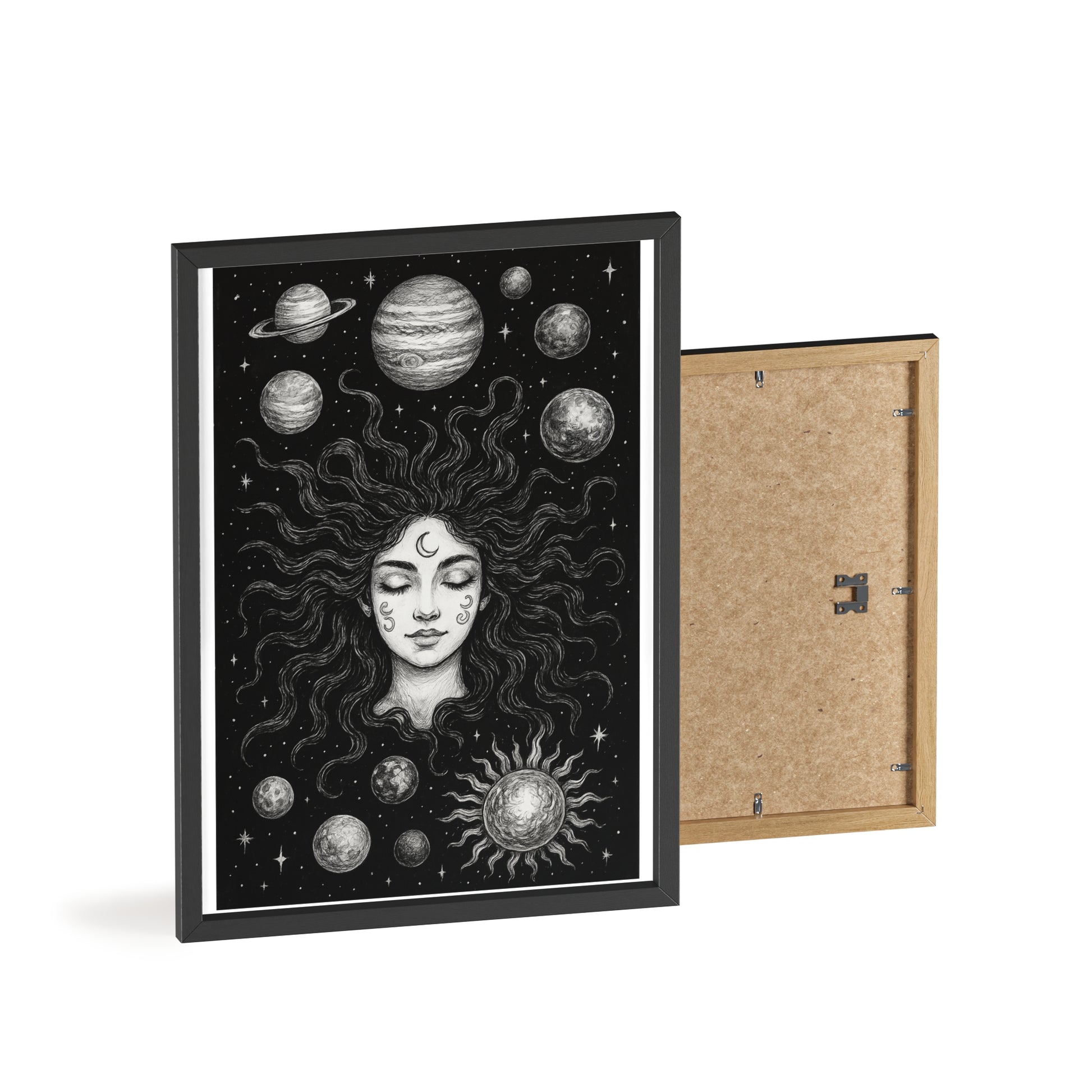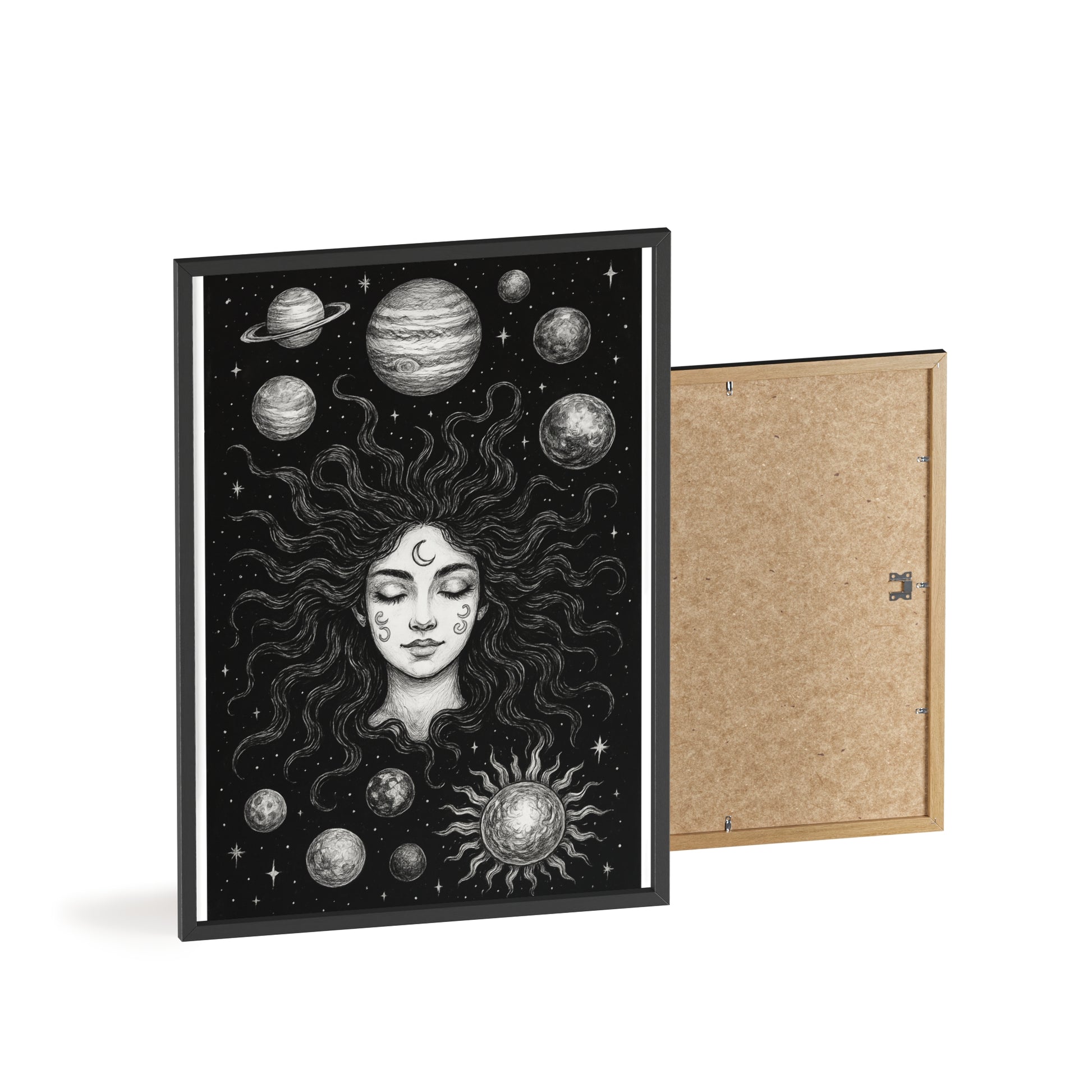 Tauche ein in die Magie des Universums – dieses detailverliebte Poster zeigt eine träumerische Frau mit geschlossenen Augen, deren Haare sich wie kosmische Wellen durchs Sternenmeer bewegen. Um sie herum schweben Planeten, Monde und eine strahlende Sonne, während ein sanfter Halbmond auf ihrer Stirn den Zauber der Nacht symbolisiert.