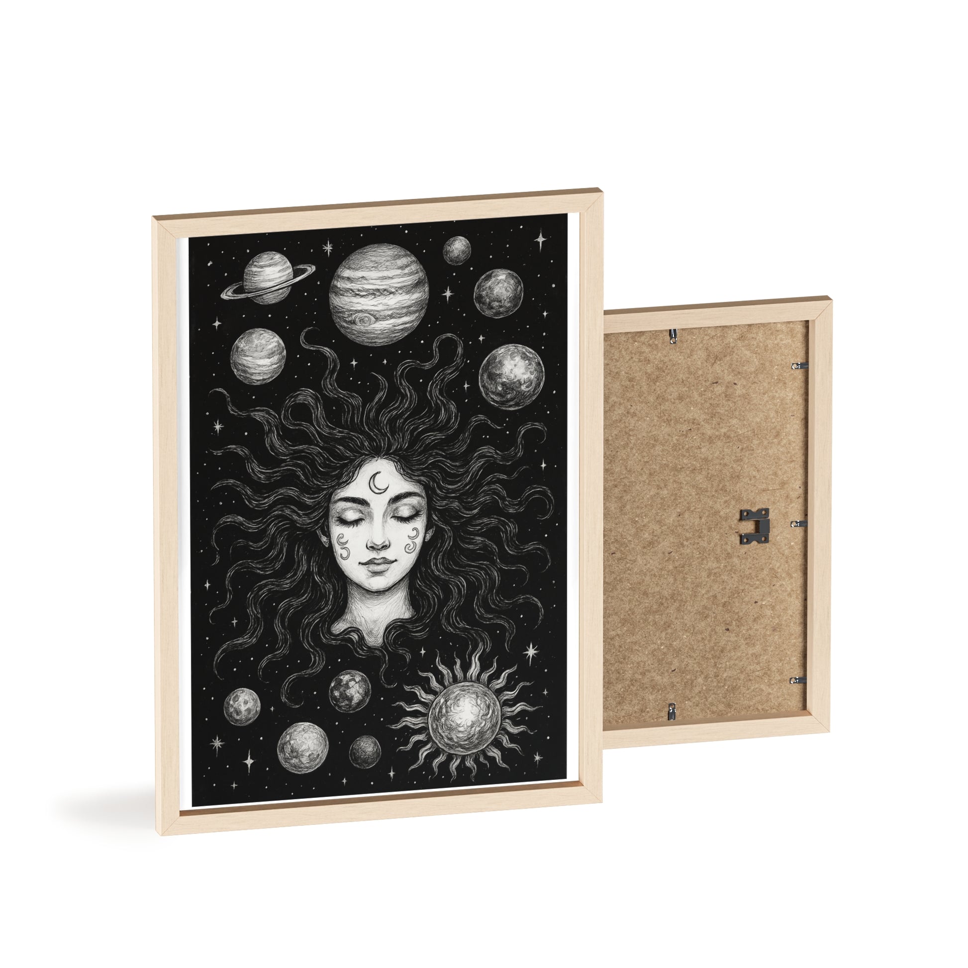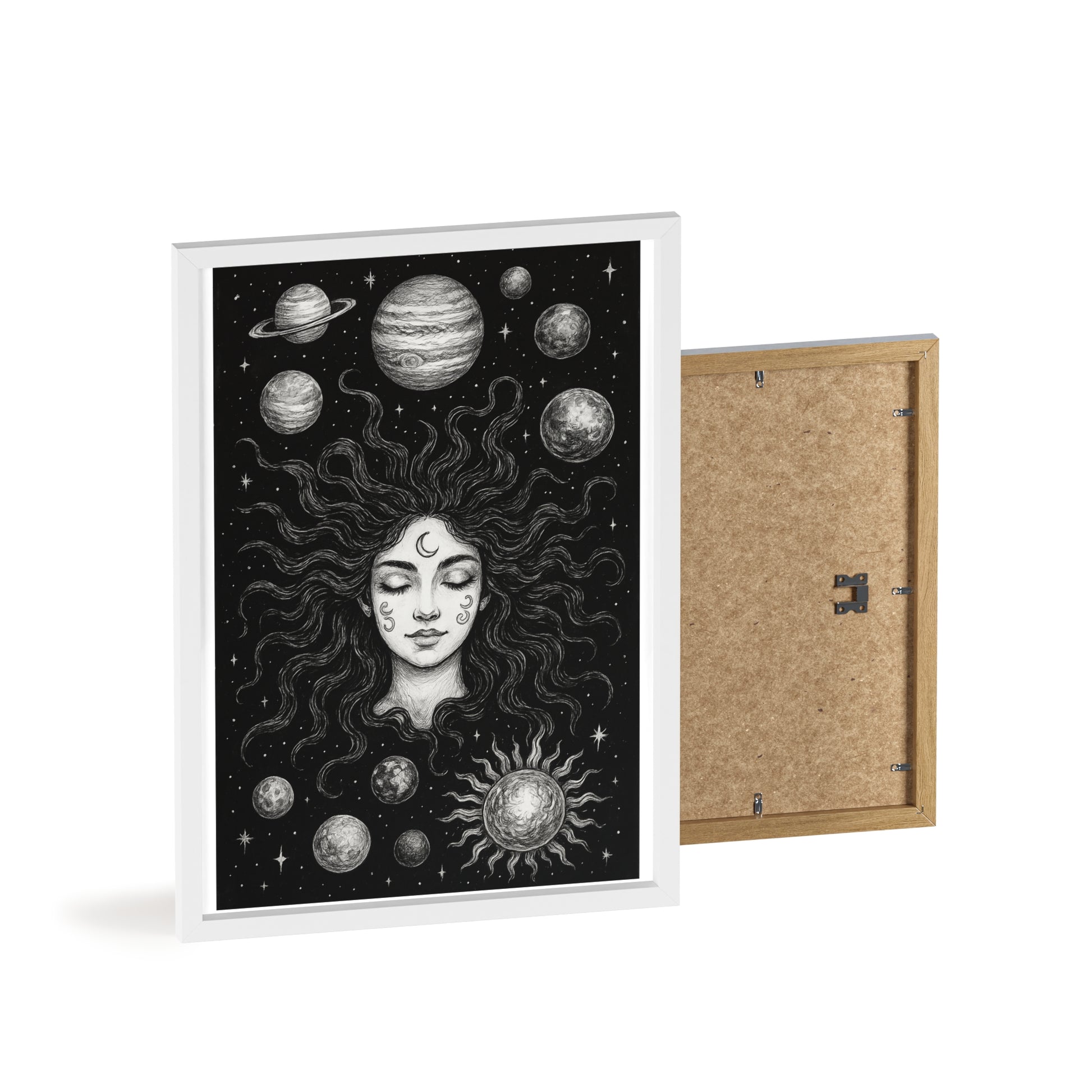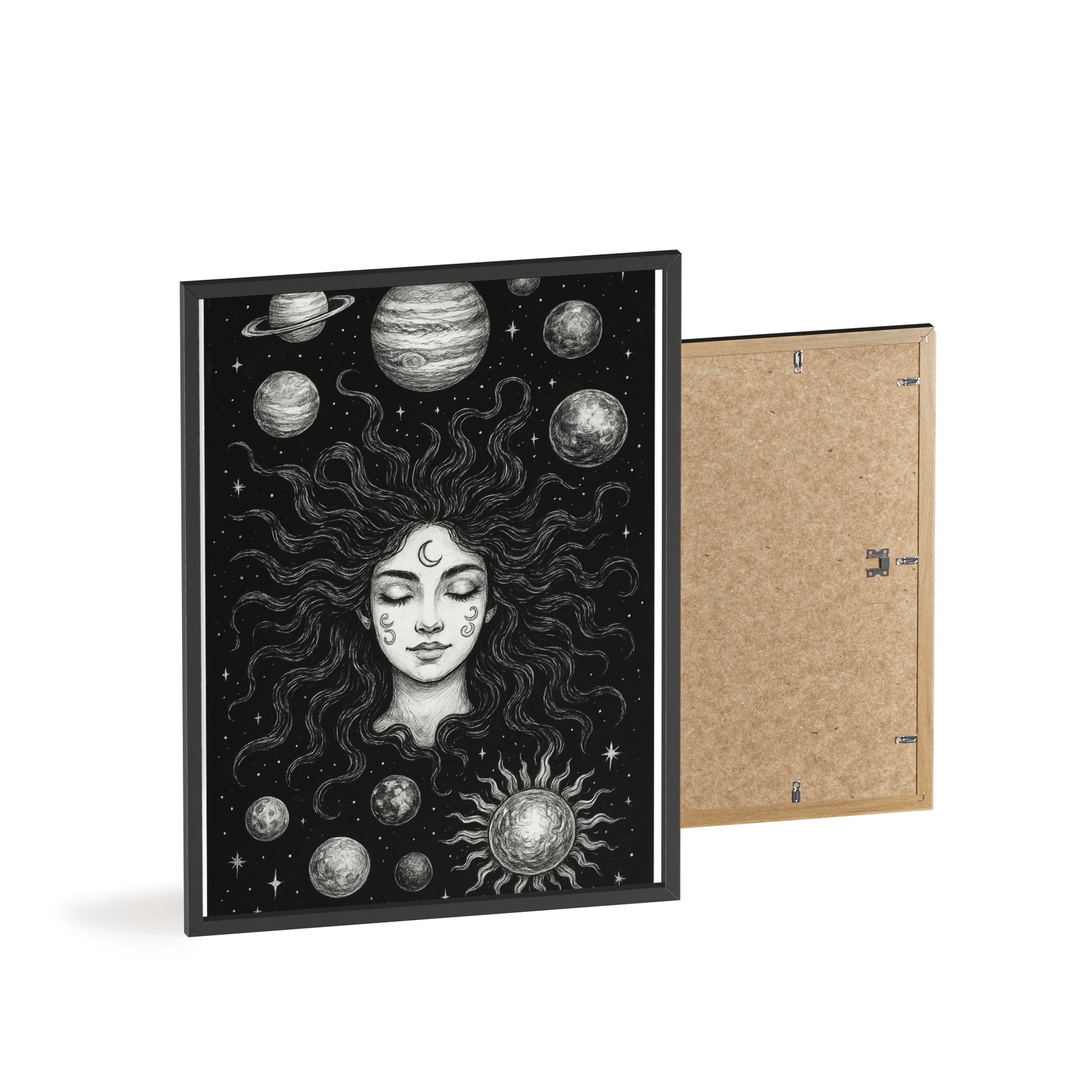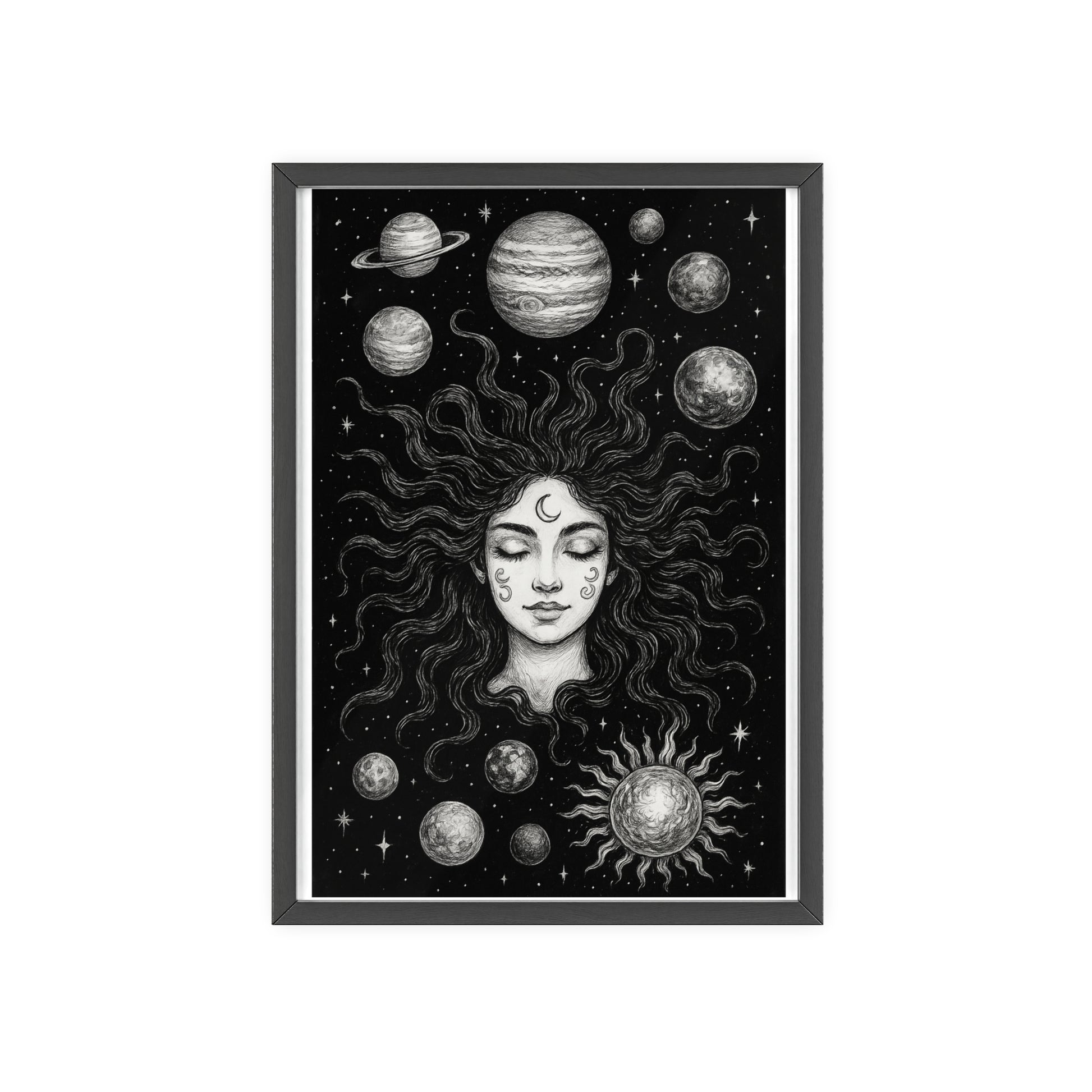 Tauche ein in die Magie des Universums – dieses detailverliebte Poster zeigt eine träumerische Frau mit geschlossenen Augen, deren Haare sich wie kosmische Wellen durchs Sternenmeer bewegen. Um sie herum schweben Planeten, Monde und eine strahlende Sonne, während ein sanfter Halbmond auf ihrer Stirn den Zauber der Nacht symbolisiert.