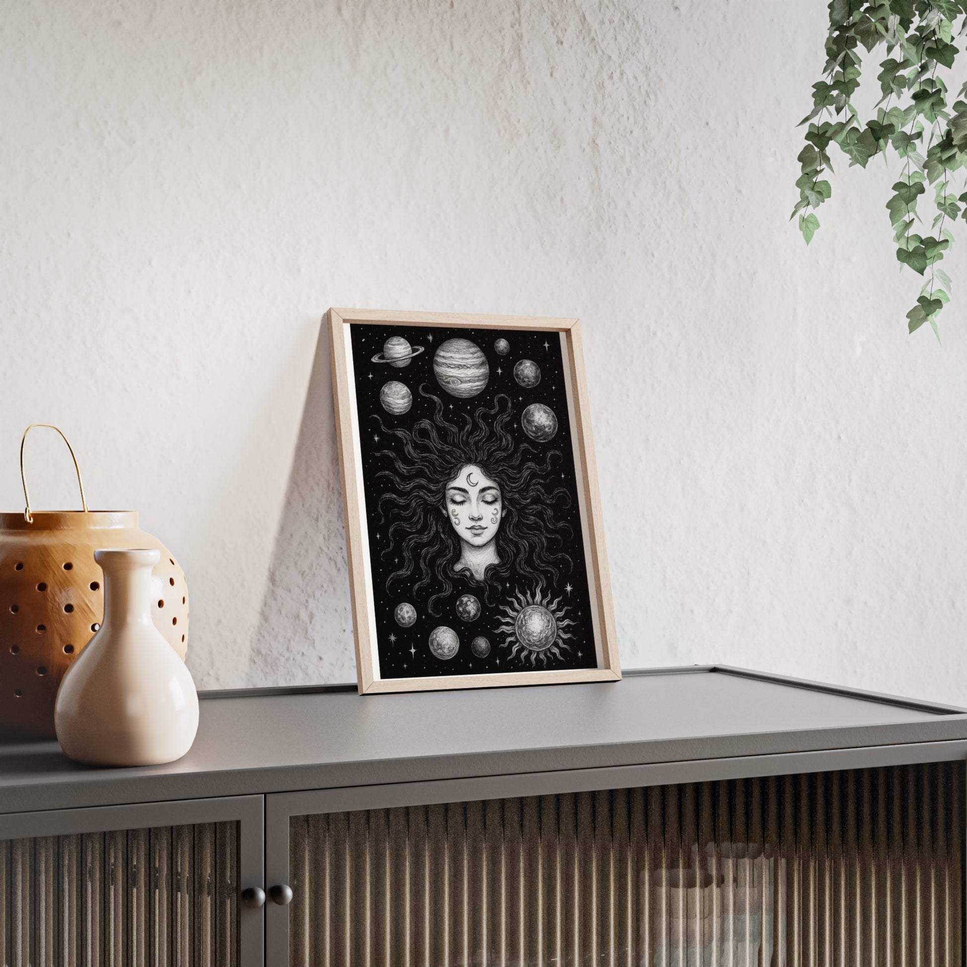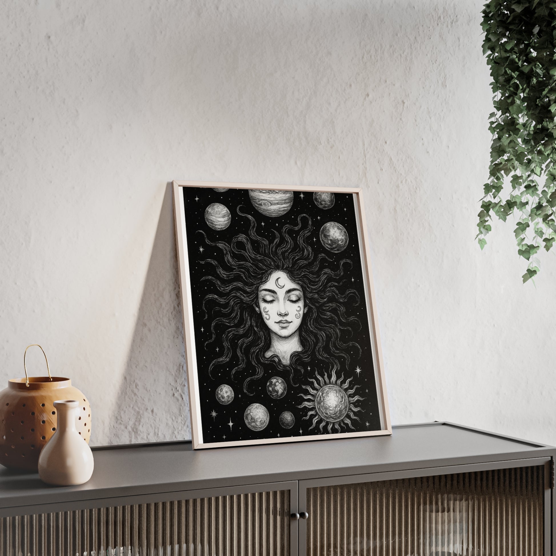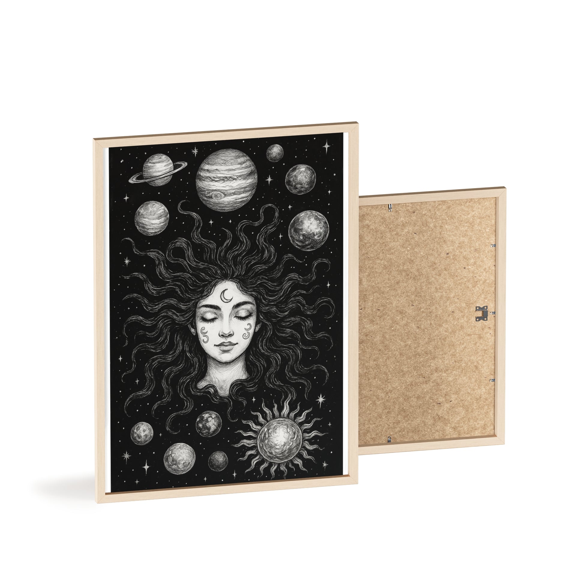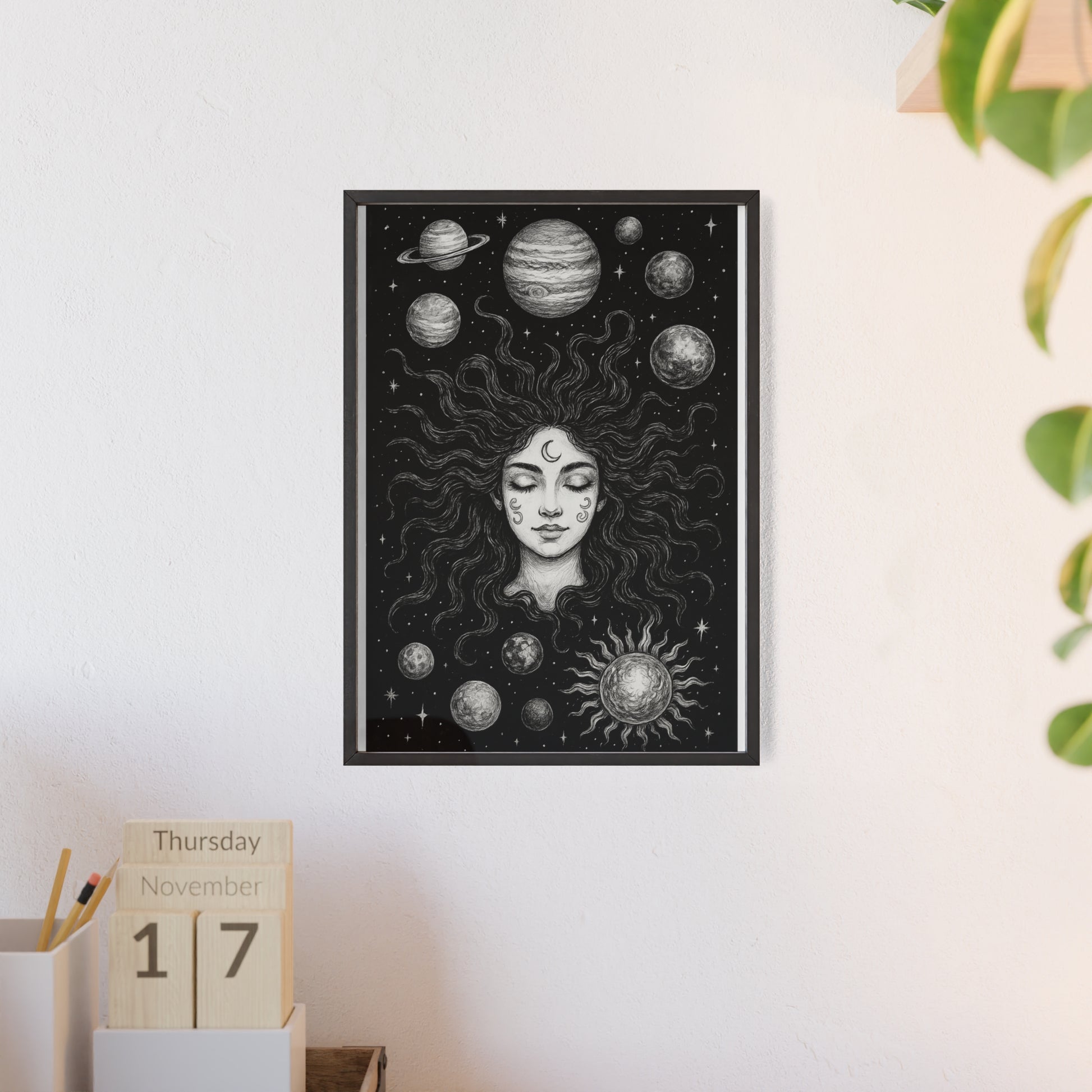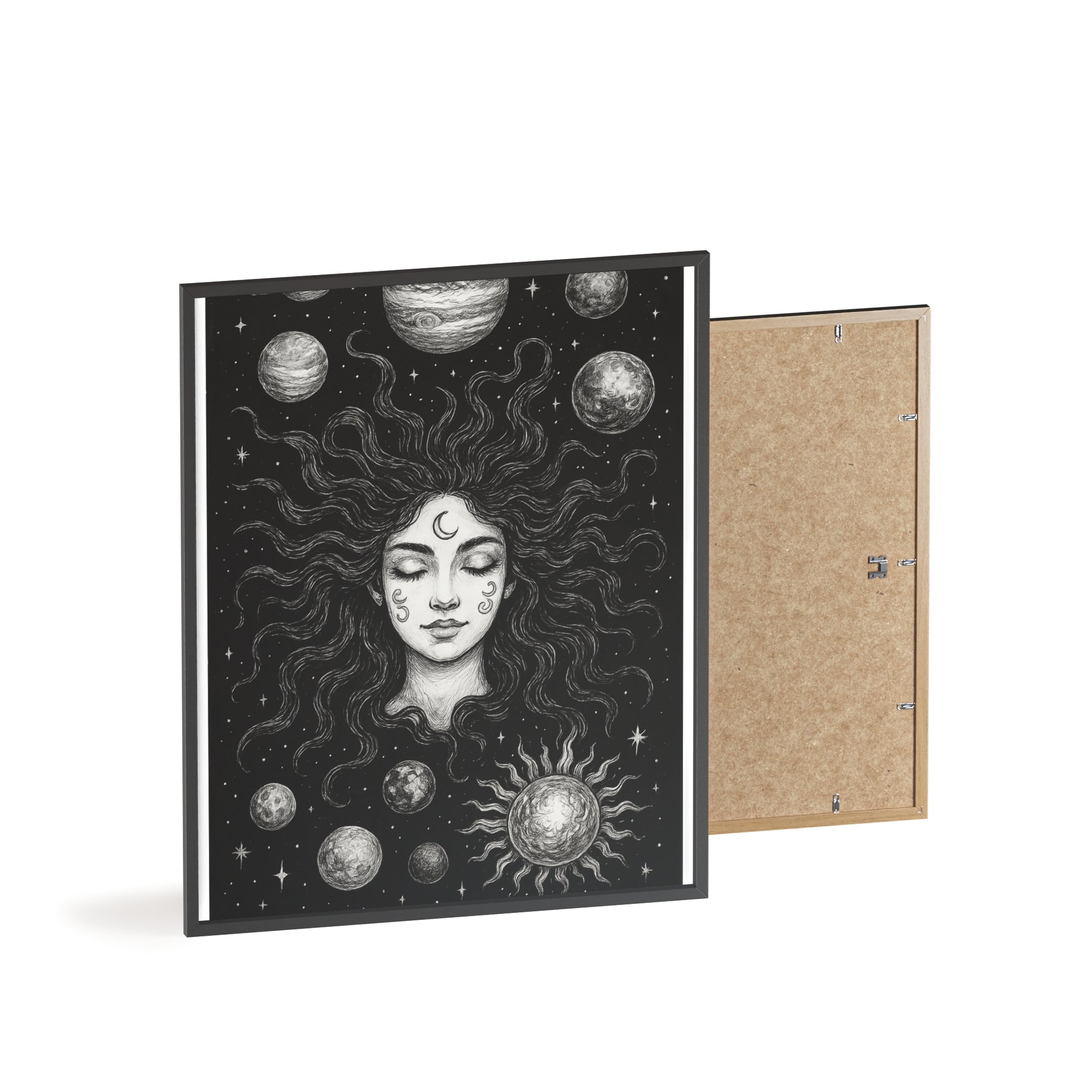 Tauche ein in die Magie des Universums – dieses detailverliebte Poster zeigt eine träumerische Frau mit geschlossenen Augen, deren Haare sich wie kosmische Wellen durchs Sternenmeer bewegen. Um sie herum schweben Planeten, Monde und eine strahlende Sonne, während ein sanfter Halbmond auf ihrer Stirn den Zauber der Nacht symbolisiert.