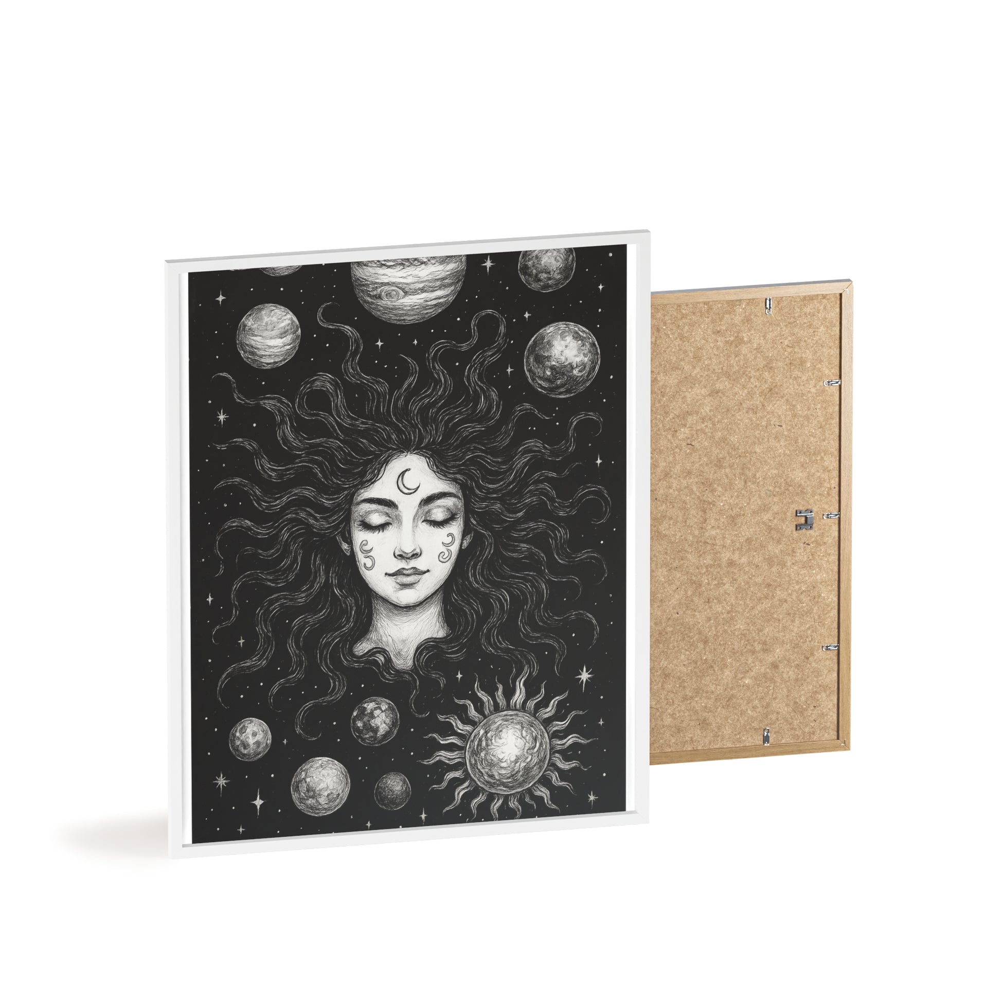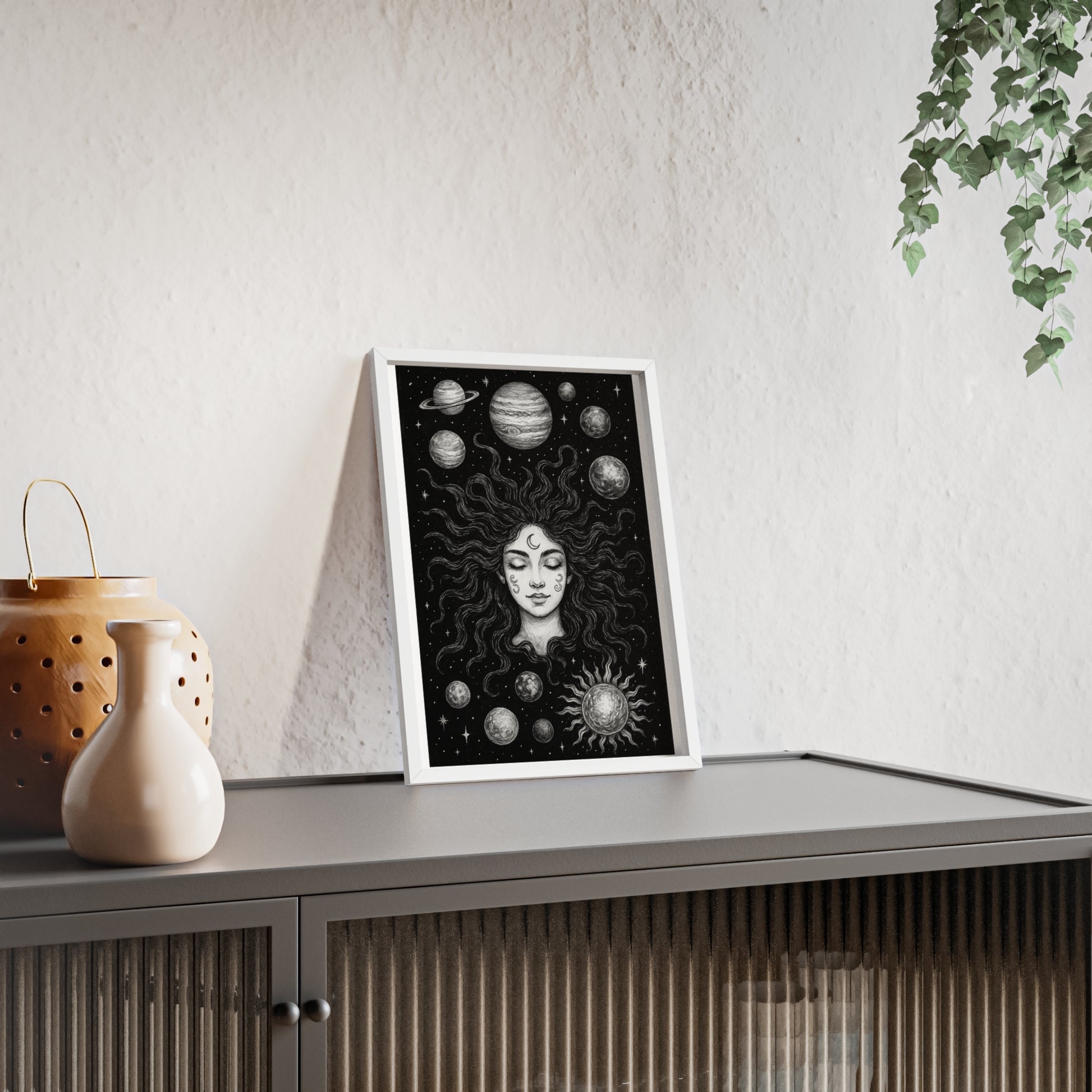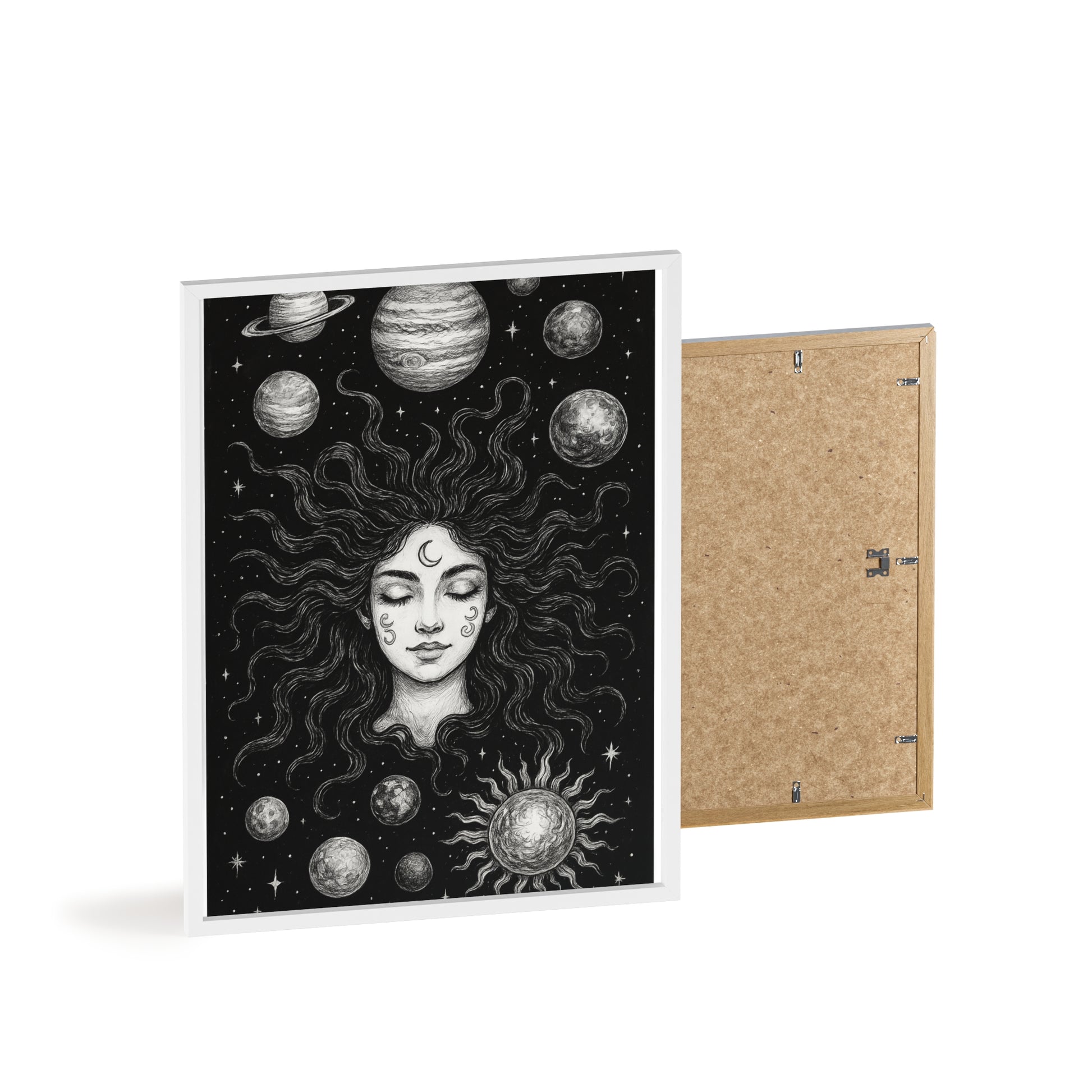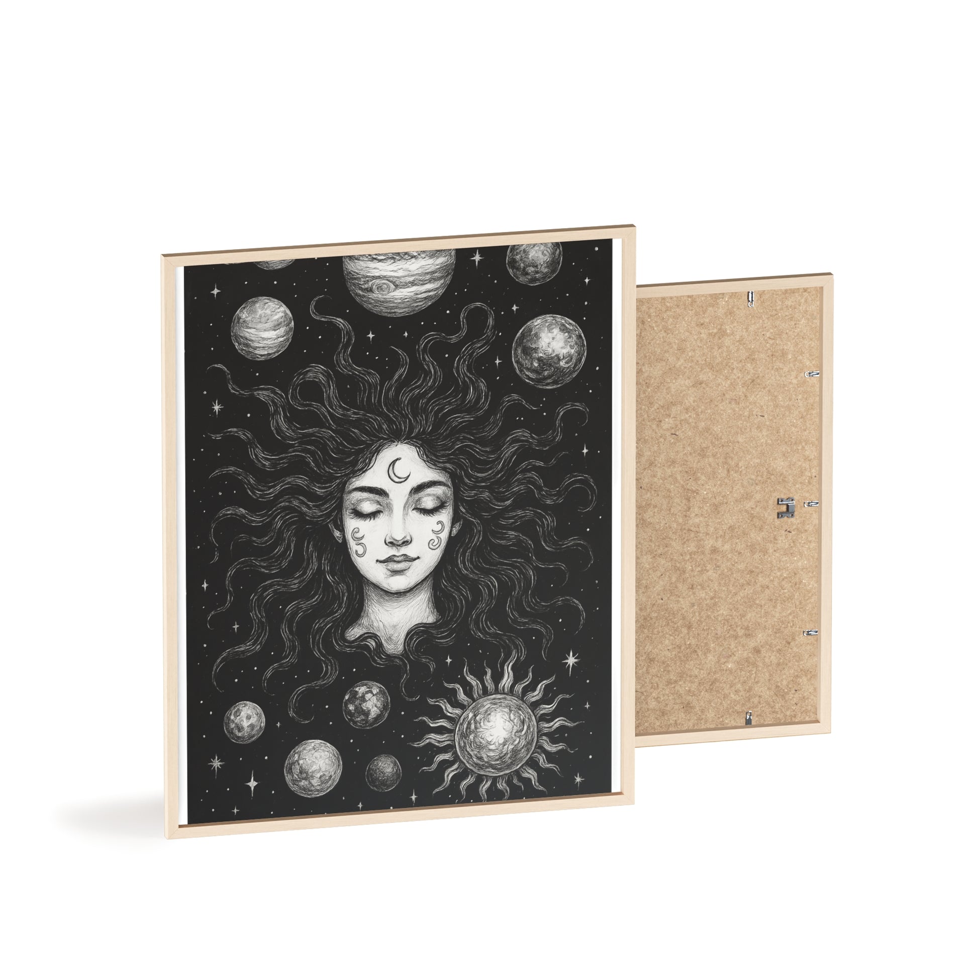 Tauche ein in die Magie des Universums – dieses detailverliebte Poster zeigt eine träumerische Frau mit geschlossenen Augen, deren Haare sich wie kosmische Wellen durchs Sternenmeer bewegen. Um sie herum schweben Planeten, Monde und eine strahlende Sonne, während ein sanfter Halbmond auf ihrer Stirn den Zauber der Nacht symbolisiert.