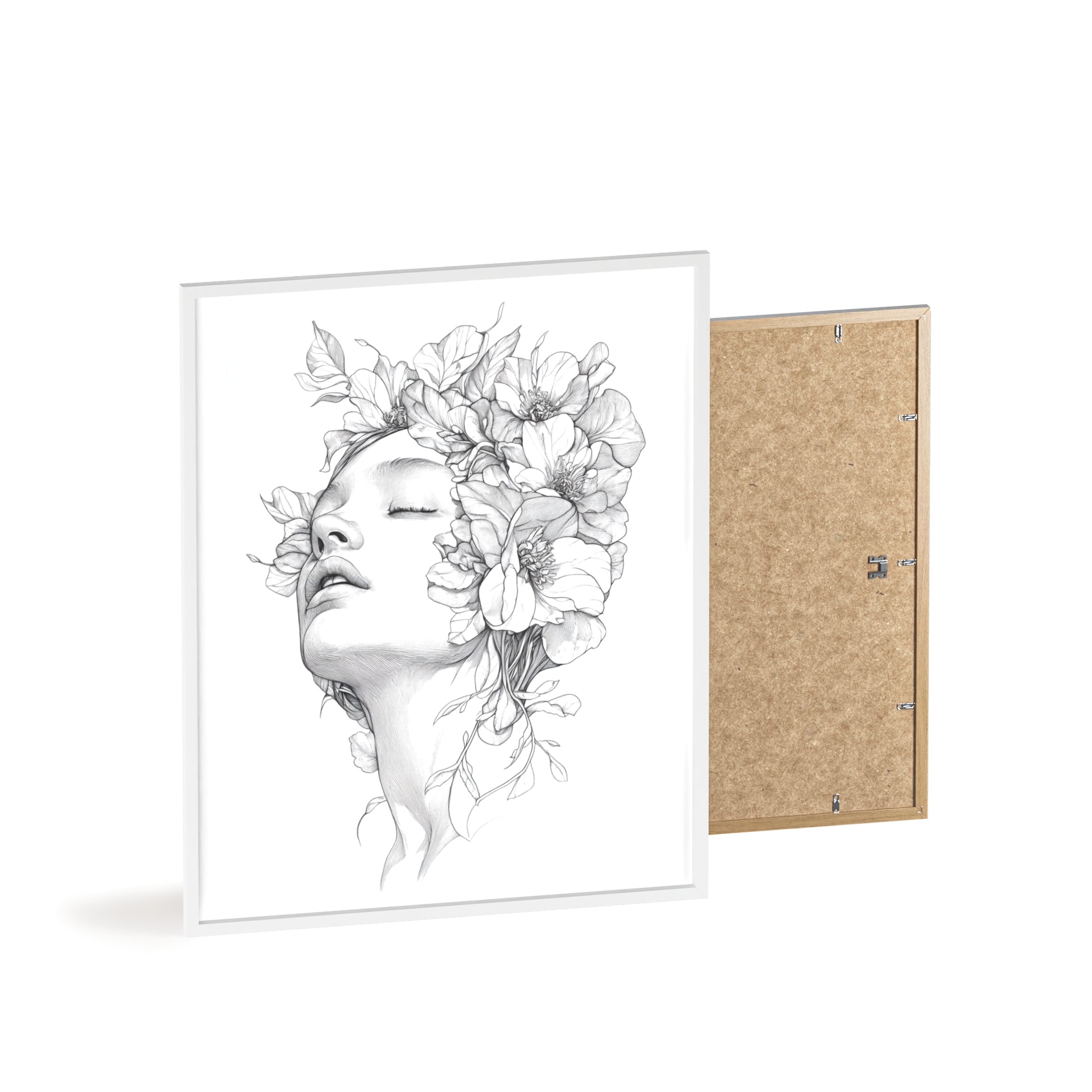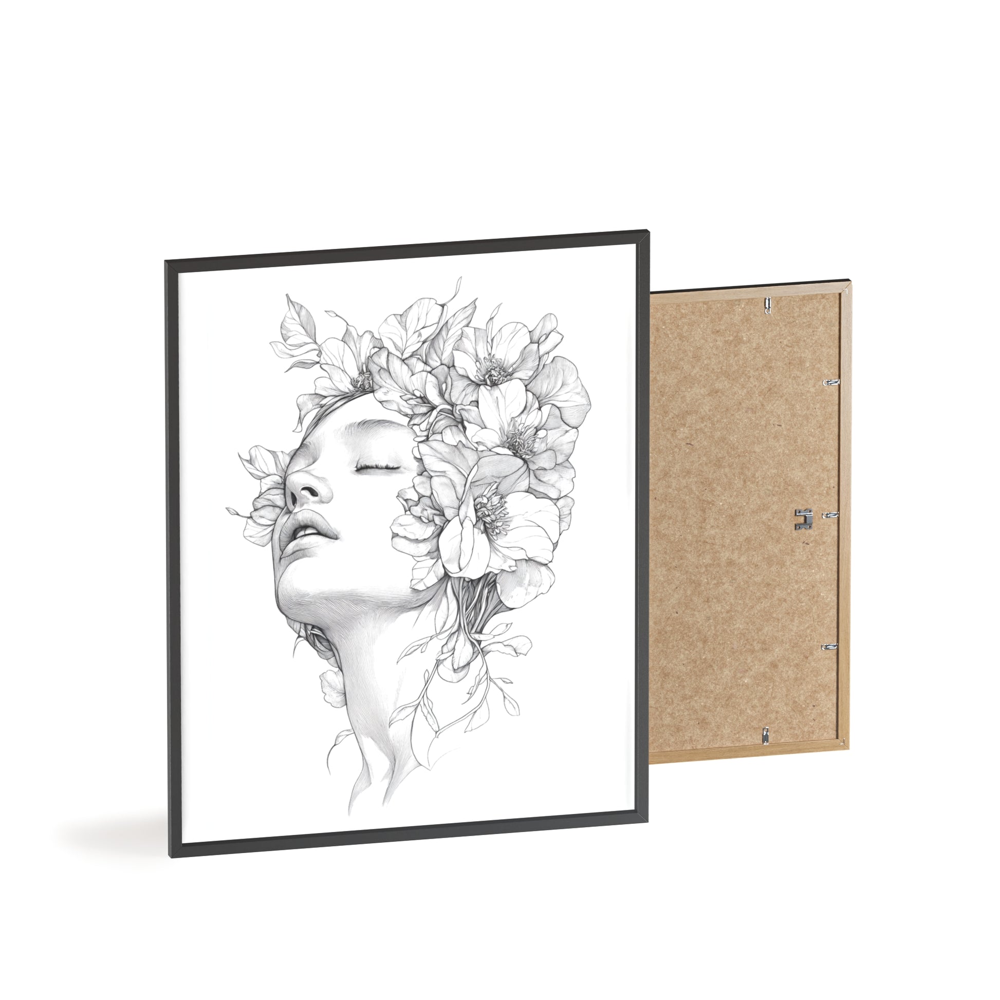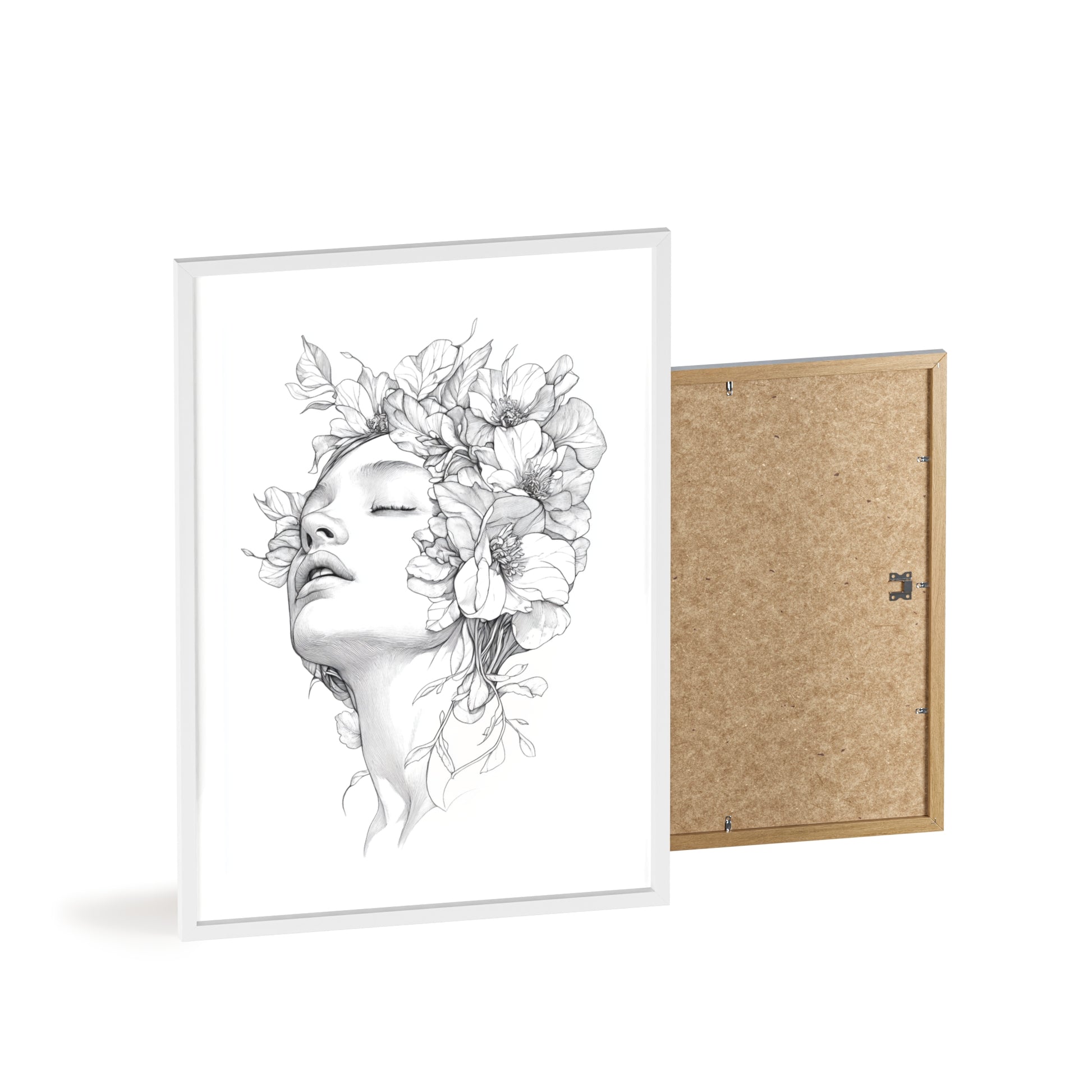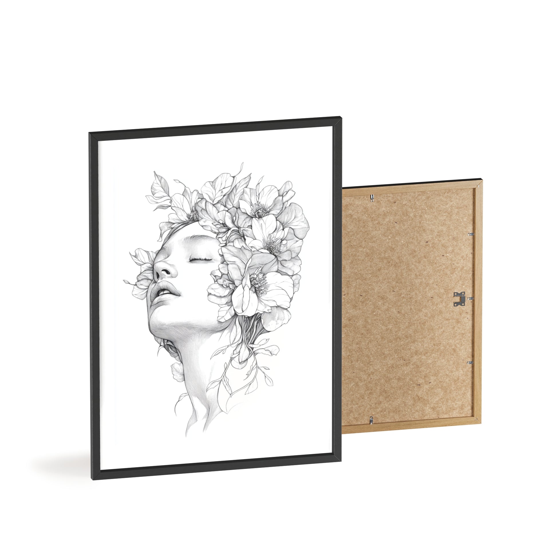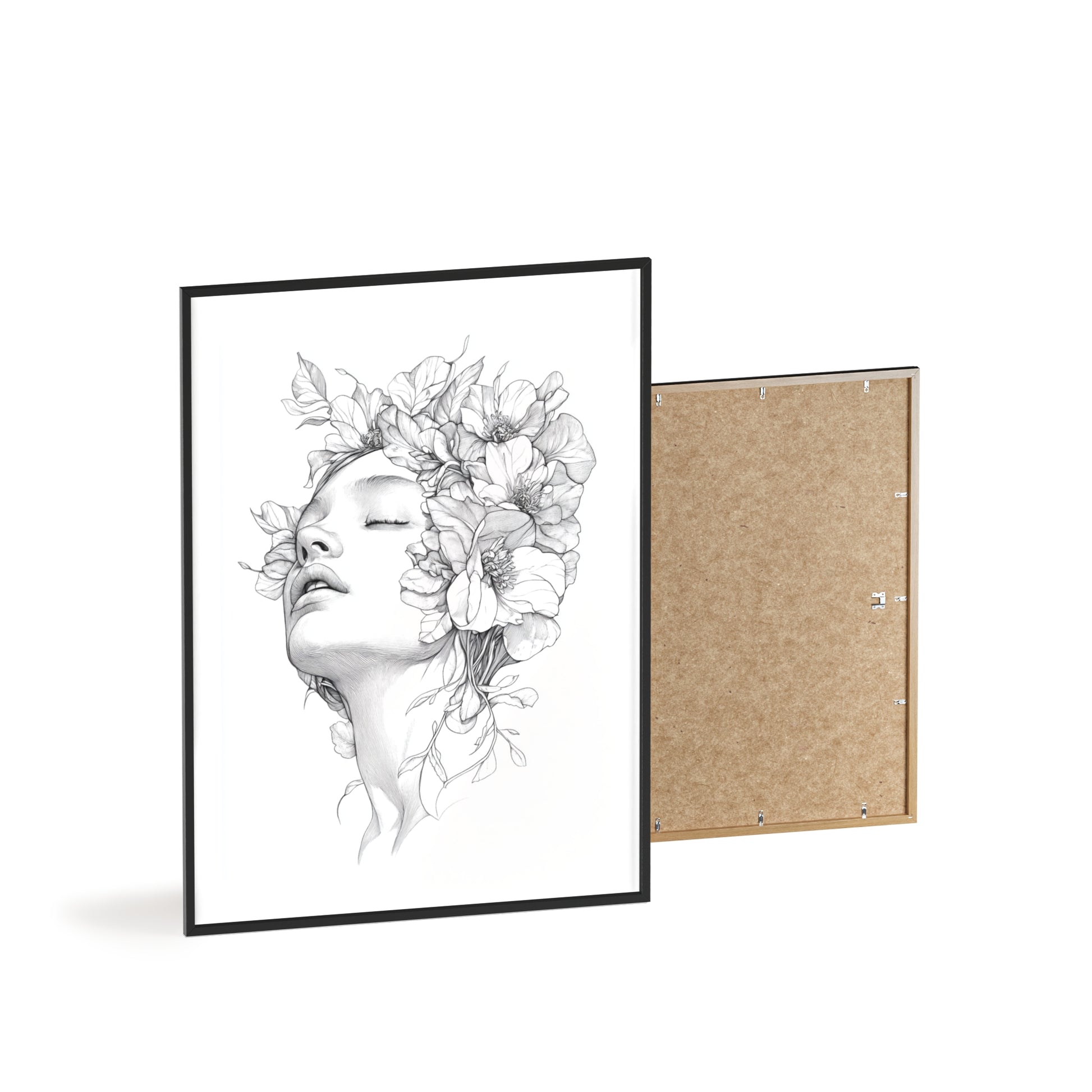 Dieses kunstvolle Poster zeigt das fein gezeichnete Portrait einer Frau, deren Gesicht von zarten Blüten umrahmt wird. Die Kombination aus klaren Linien und weichen floralen Formen verleiht dem Motiv eine einzigartige Balance zwischen Stärke und Zerbrechlichkeit – pure Eleganz in Schwarz-Weiß.