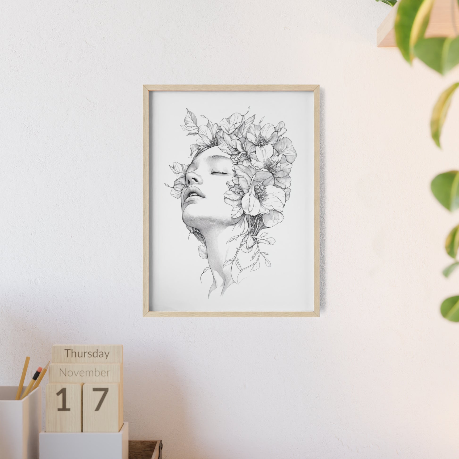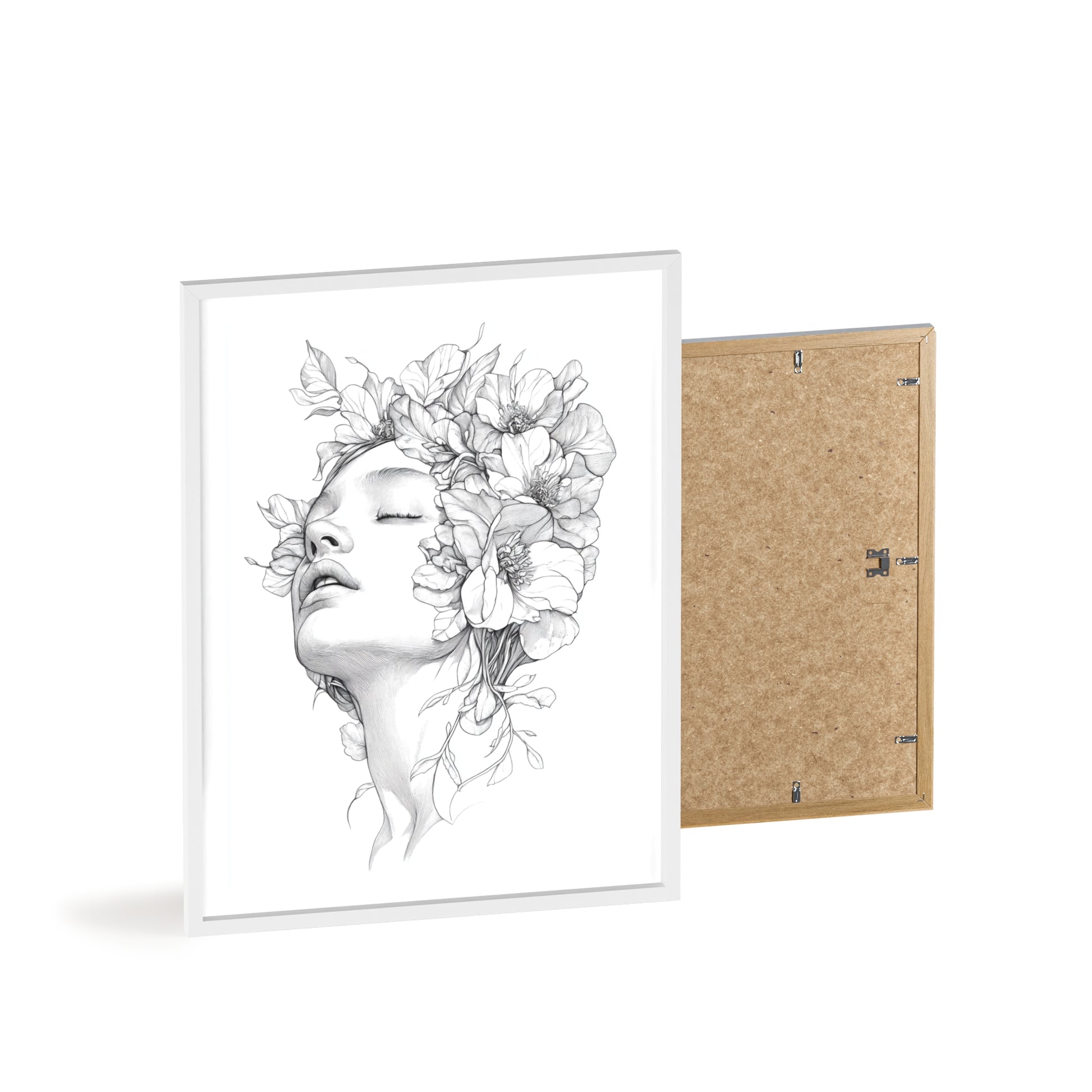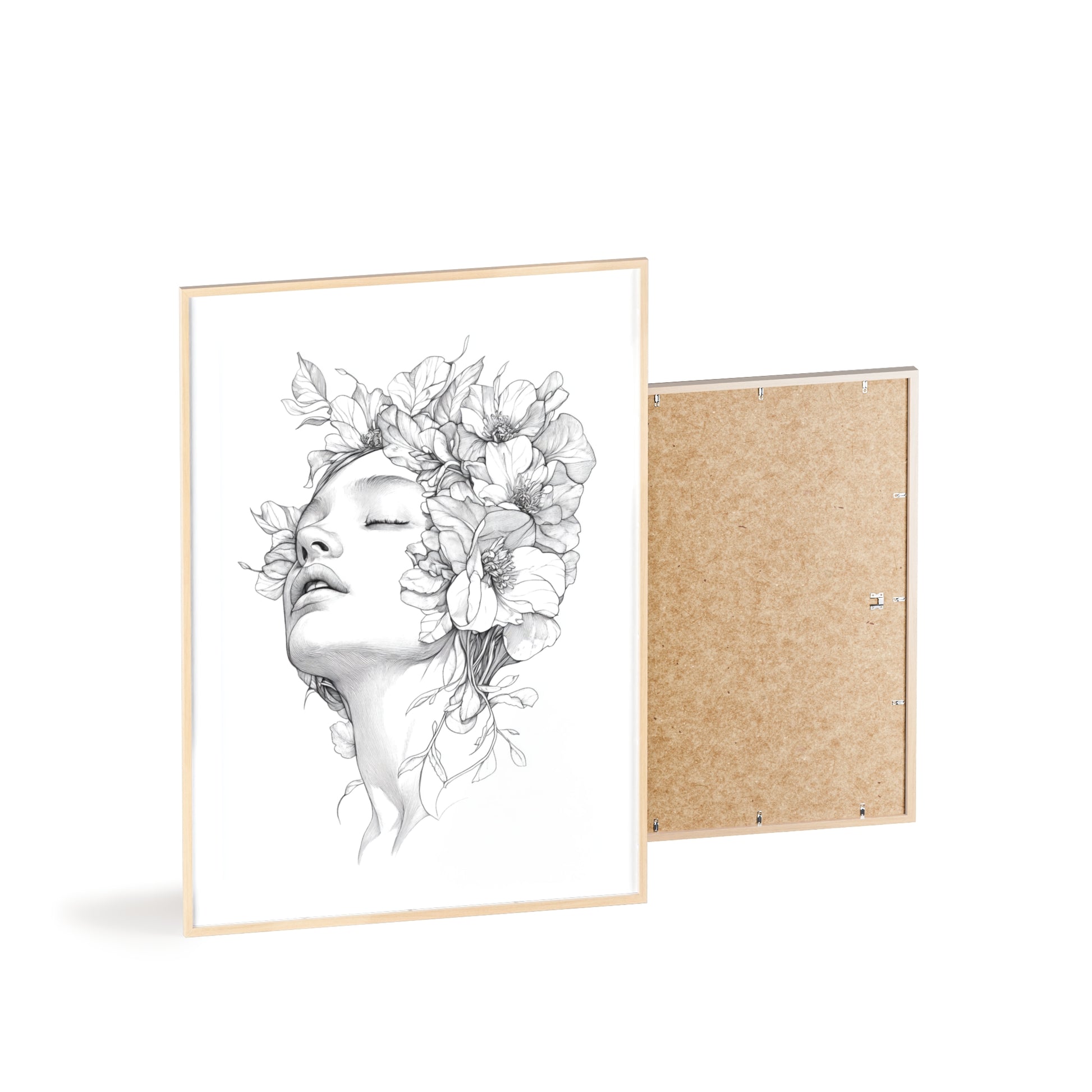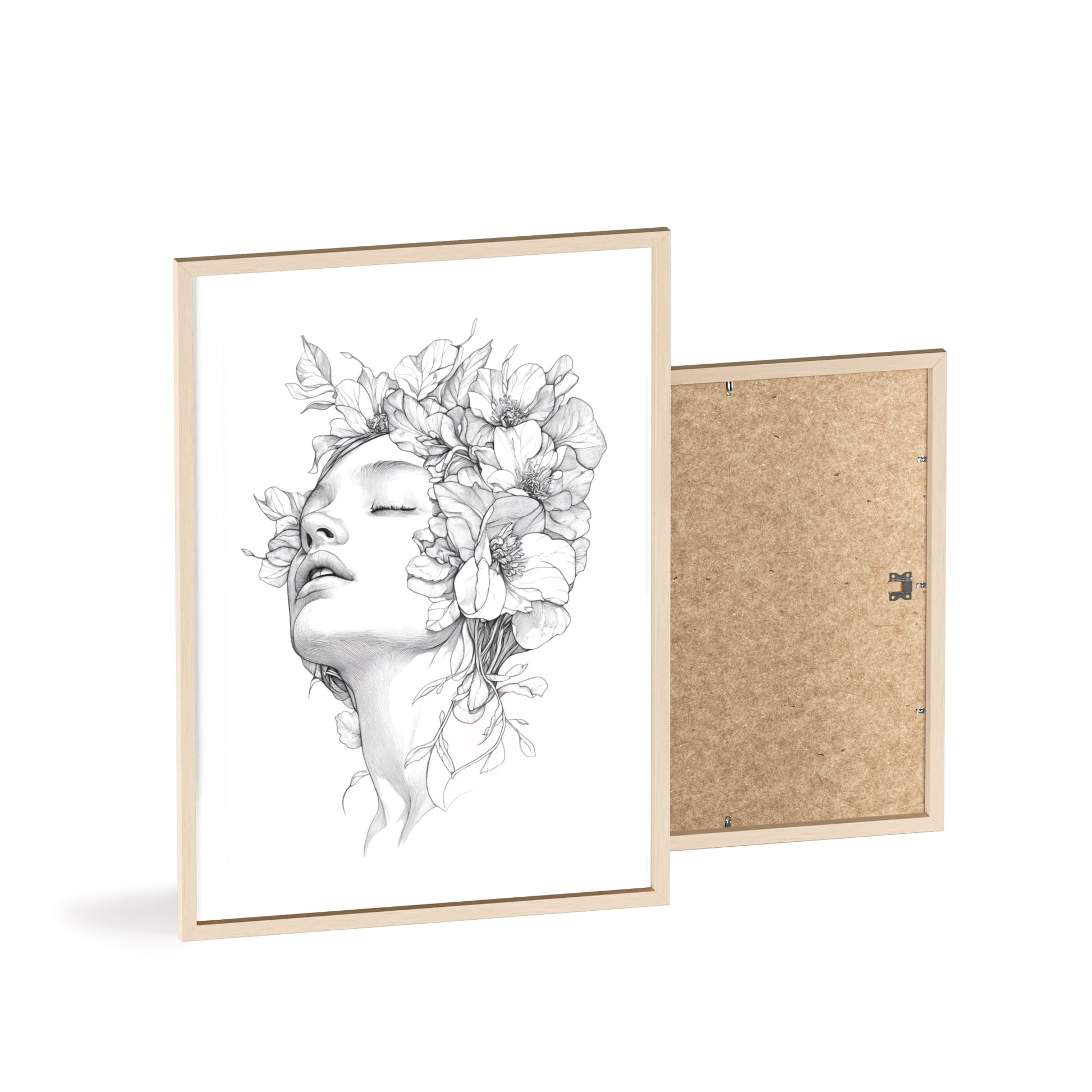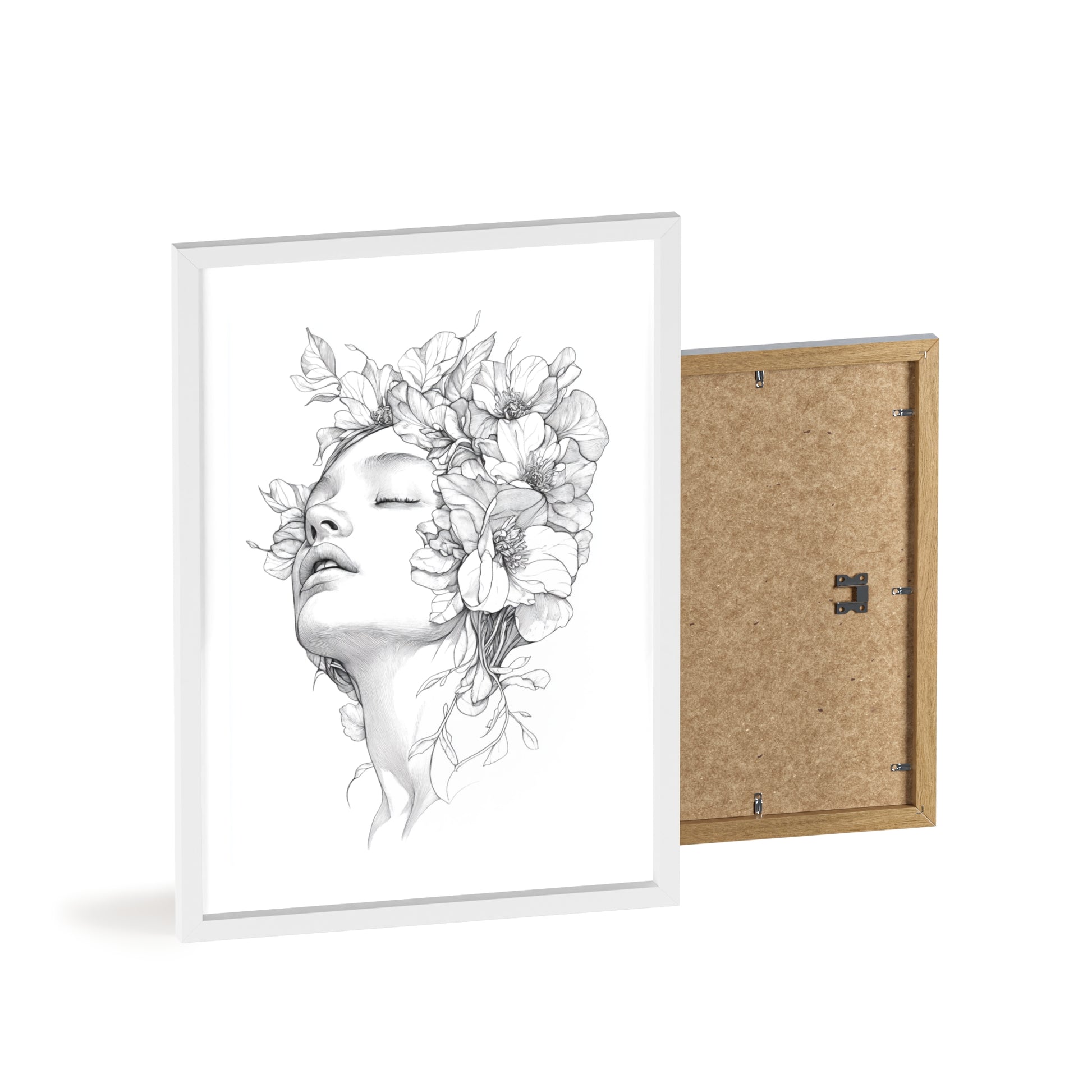 Dieses kunstvolle Poster zeigt das fein gezeichnete Portrait einer Frau, deren Gesicht von zarten Blüten umrahmt wird. Die Kombination aus klaren Linien und weichen floralen Formen verleiht dem Motiv eine einzigartige Balance zwischen Stärke und Zerbrechlichkeit – pure Eleganz in Schwarz-Weiß.