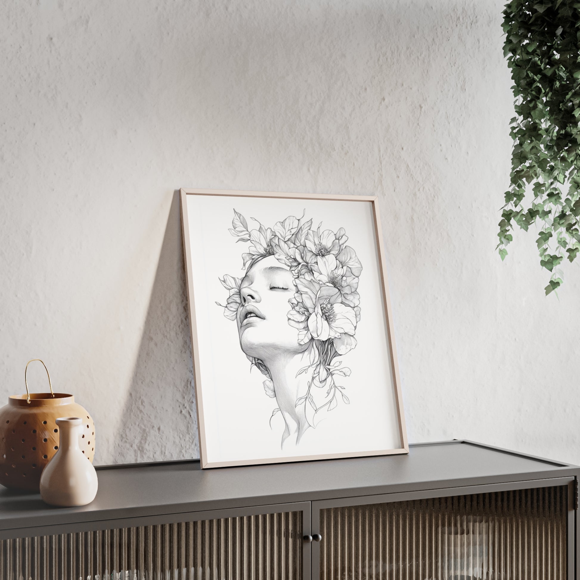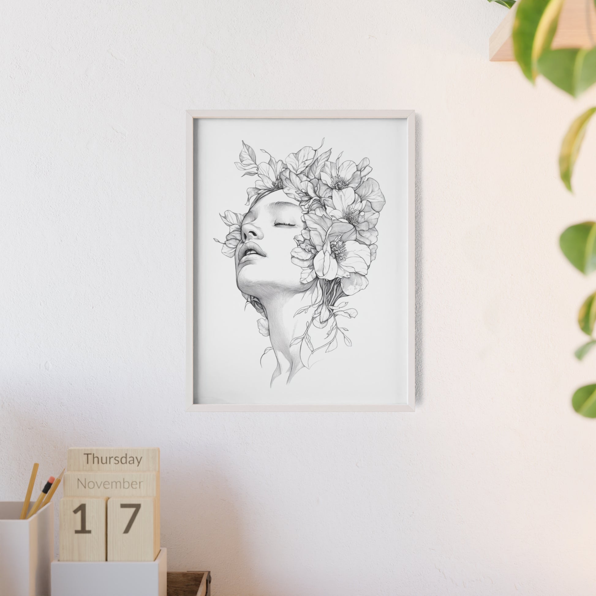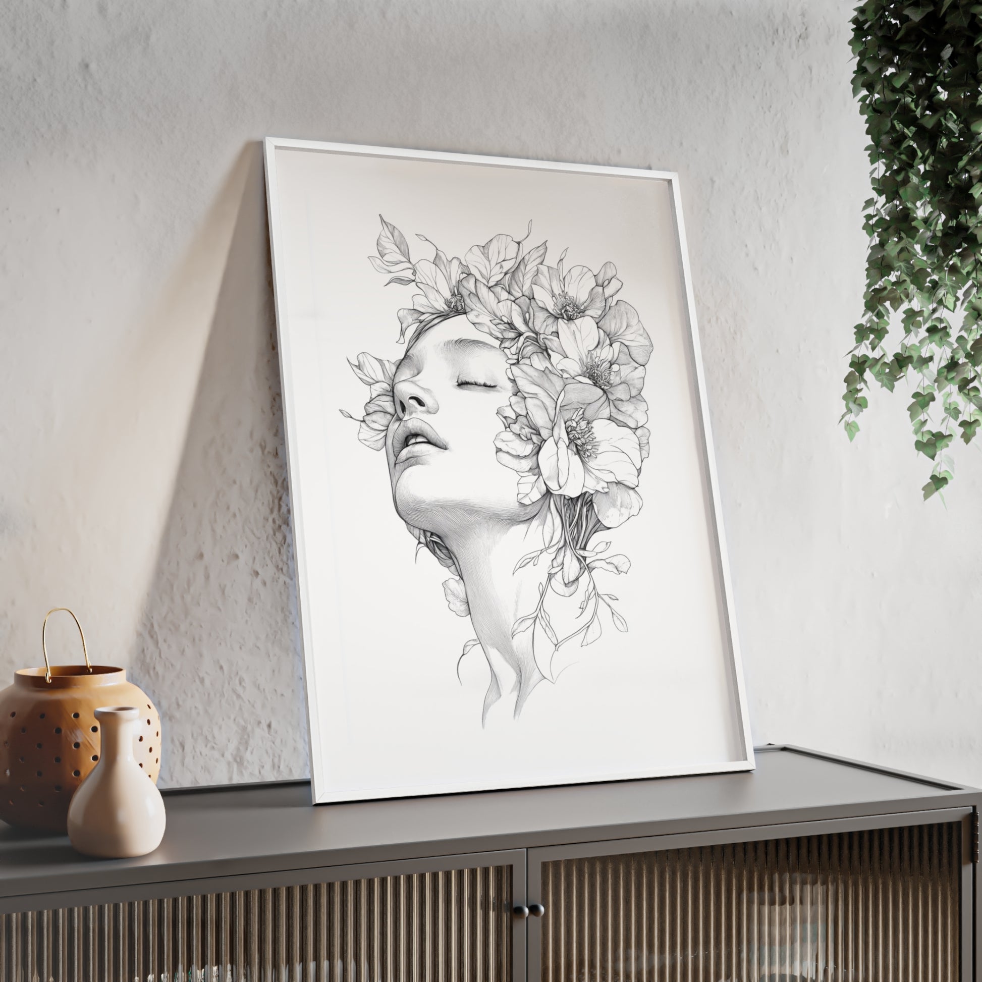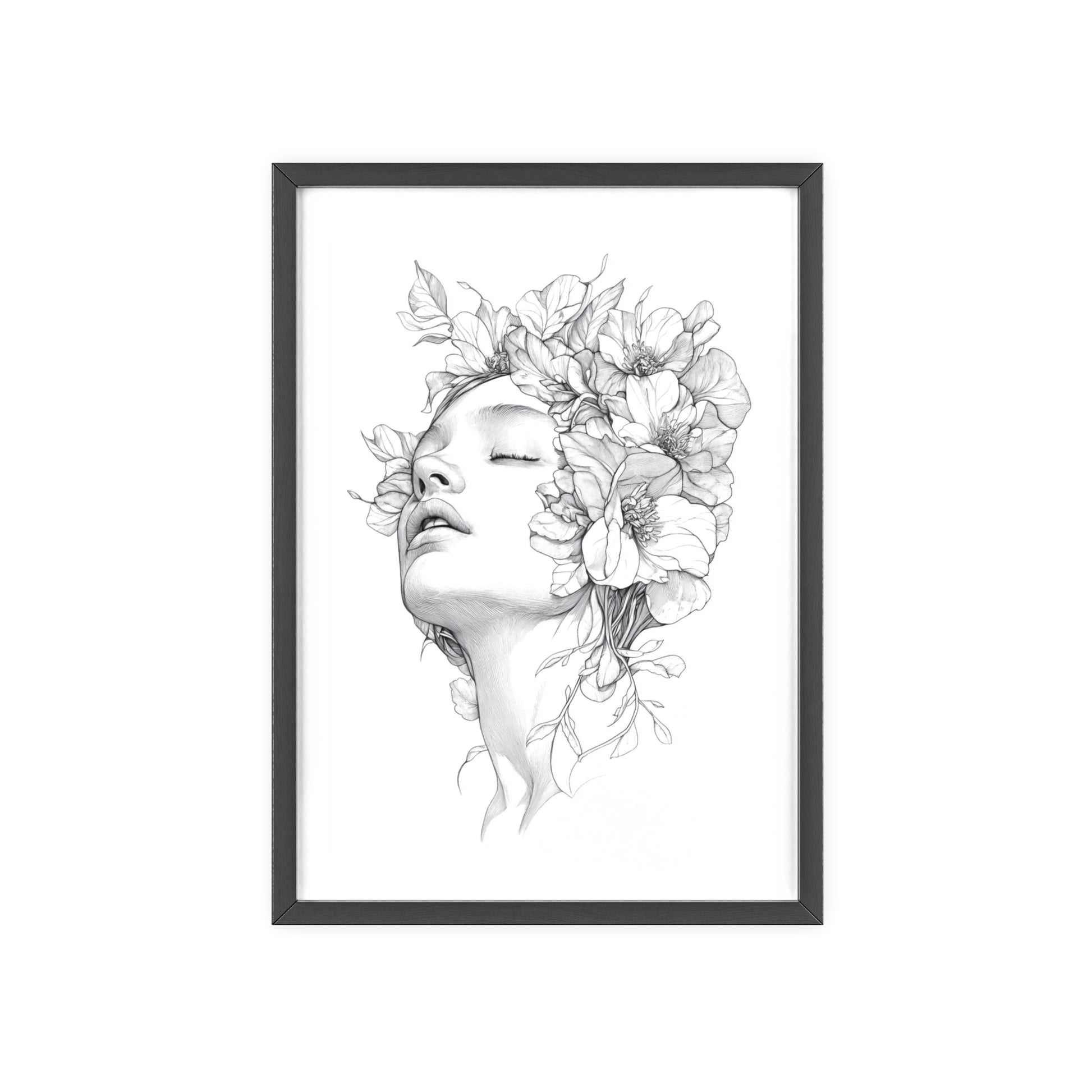 Dieses kunstvolle Poster zeigt das fein gezeichnete Portrait einer Frau, deren Gesicht von zarten Blüten umrahmt wird. Die Kombination aus klaren Linien und weichen floralen Formen verleiht dem Motiv eine einzigartige Balance zwischen Stärke und Zerbrechlichkeit – pure Eleganz in Schwarz-Weiß.