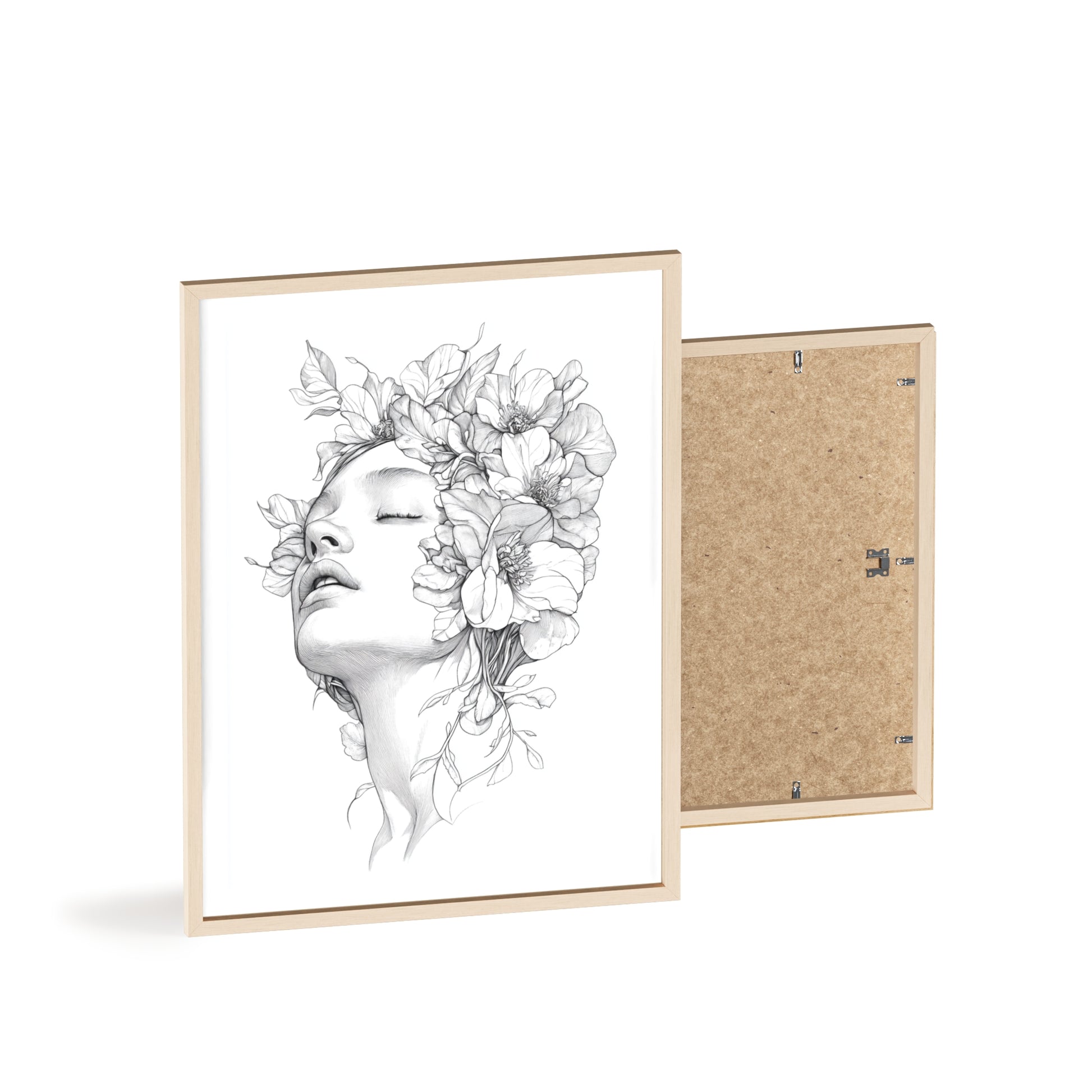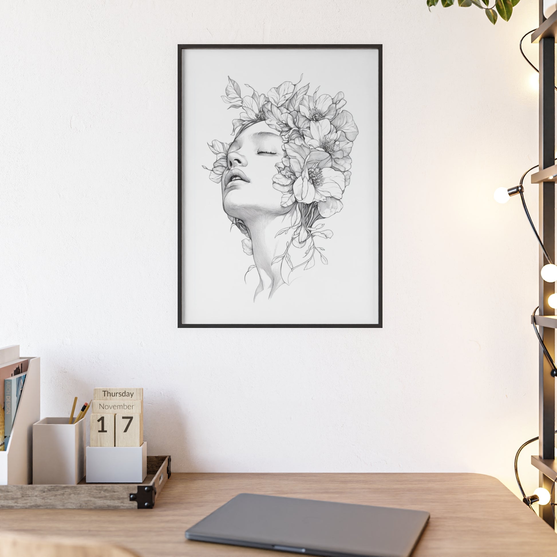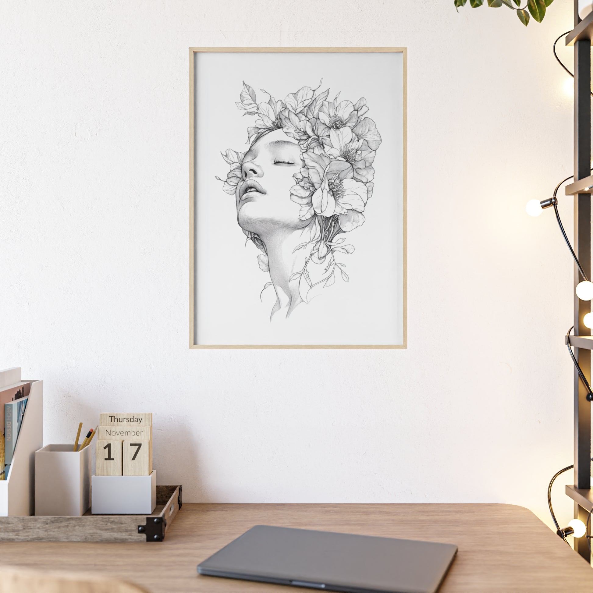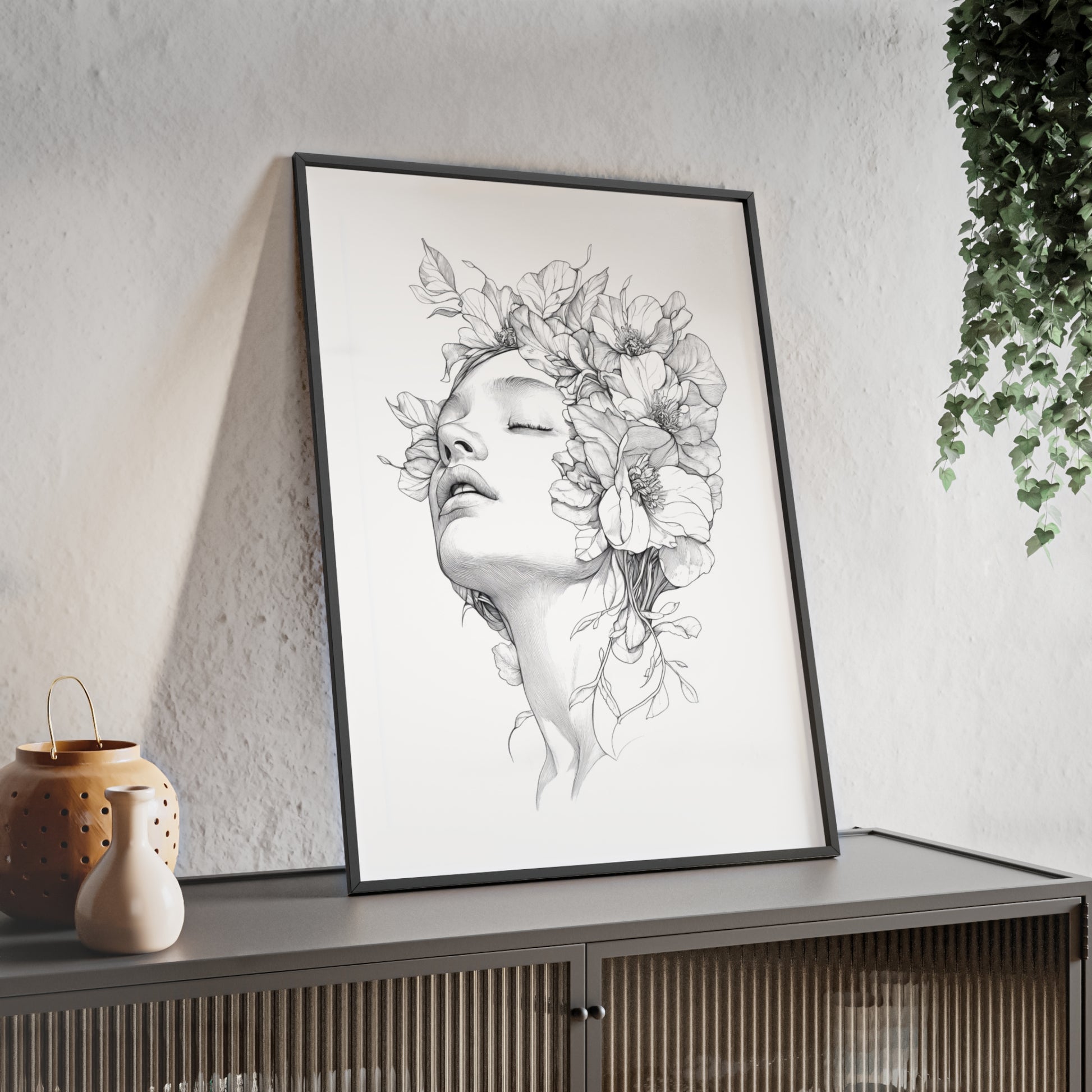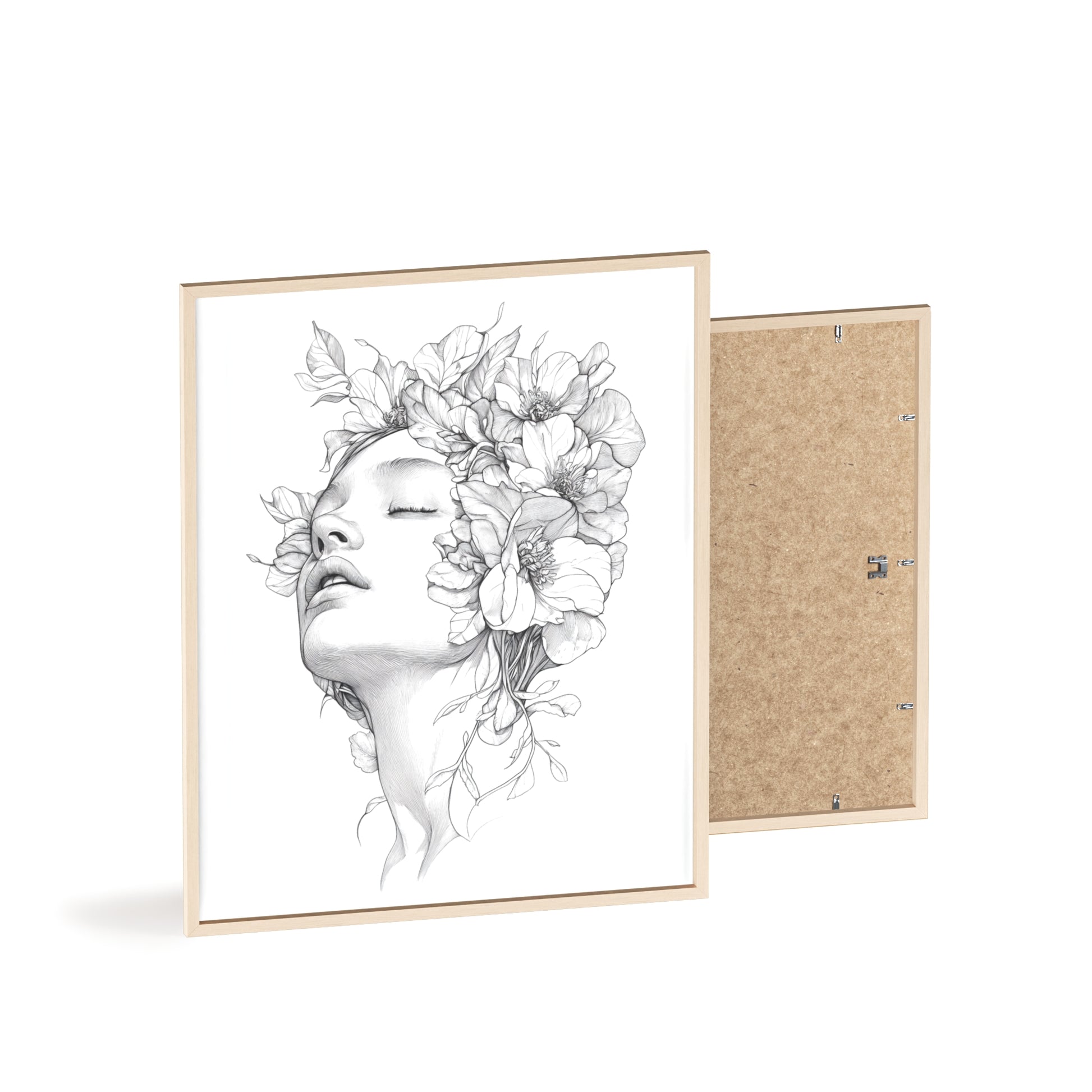 Dieses kunstvolle Poster zeigt das fein gezeichnete Portrait einer Frau, deren Gesicht von zarten Blüten umrahmt wird. Die Kombination aus klaren Linien und weichen floralen Formen verleiht dem Motiv eine einzigartige Balance zwischen Stärke und Zerbrechlichkeit – pure Eleganz in Schwarz-Weiß.