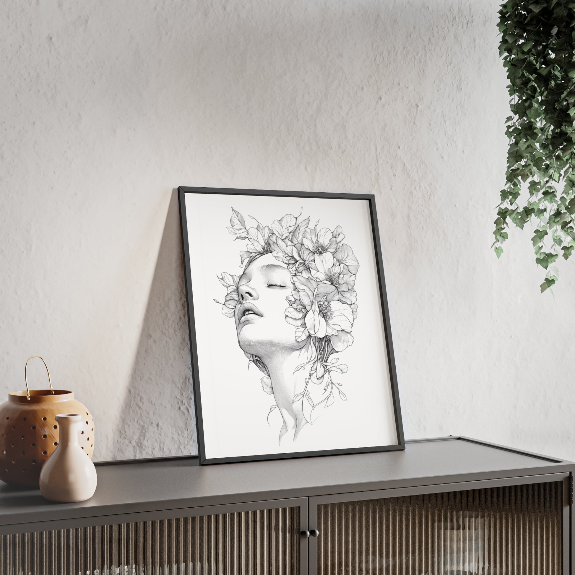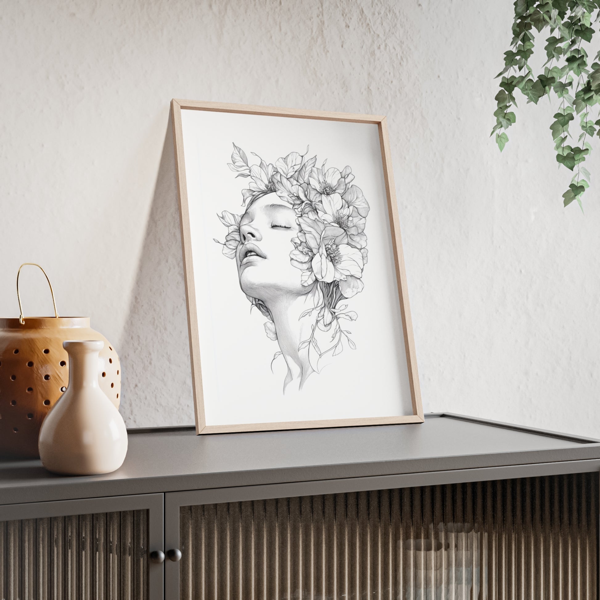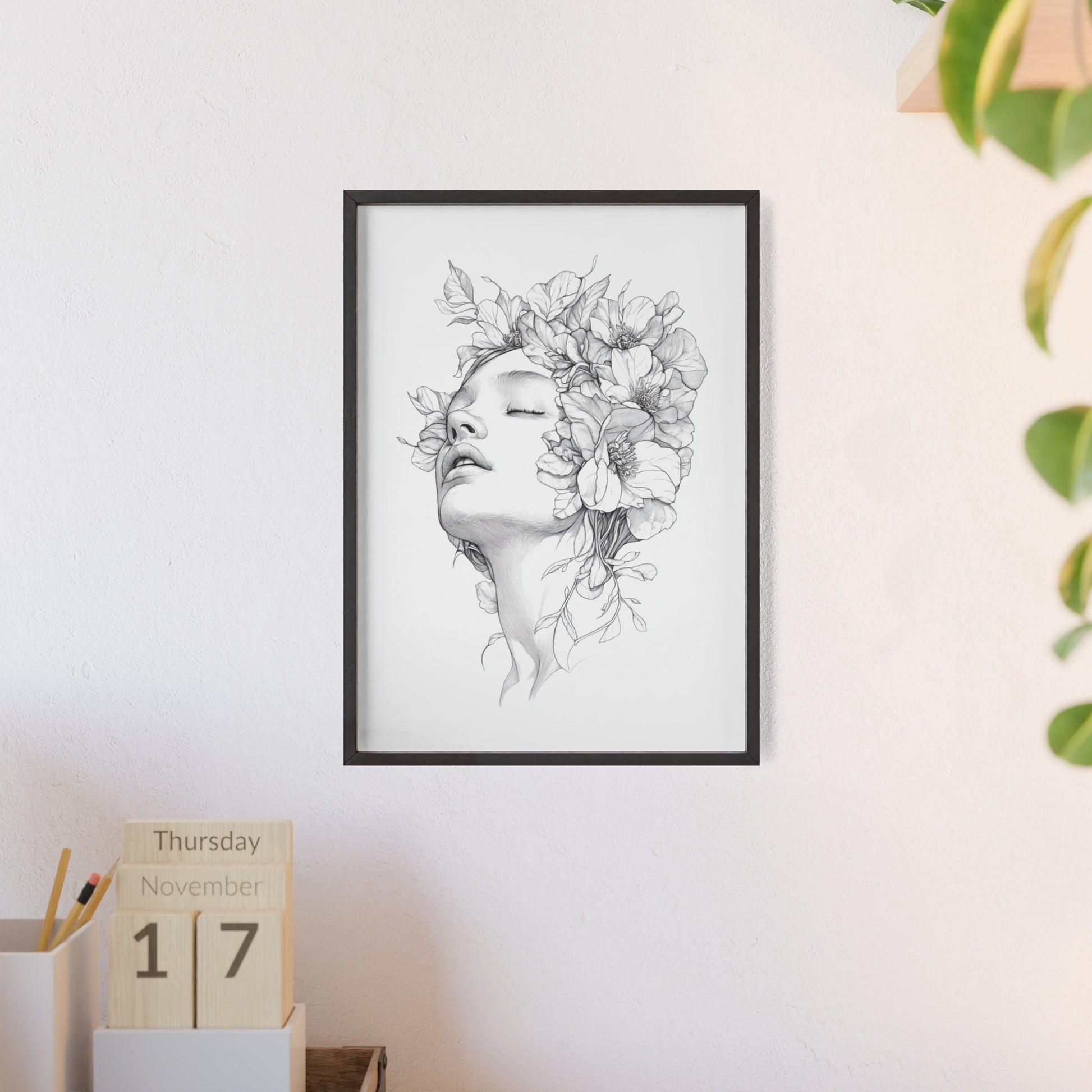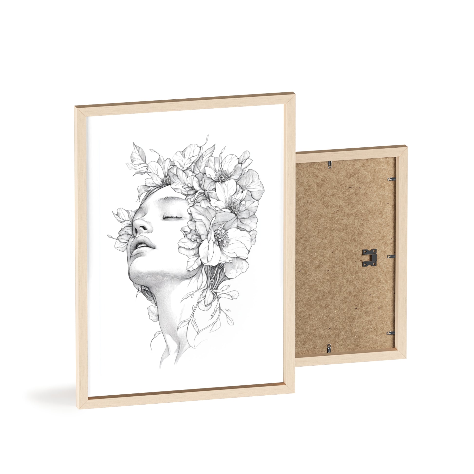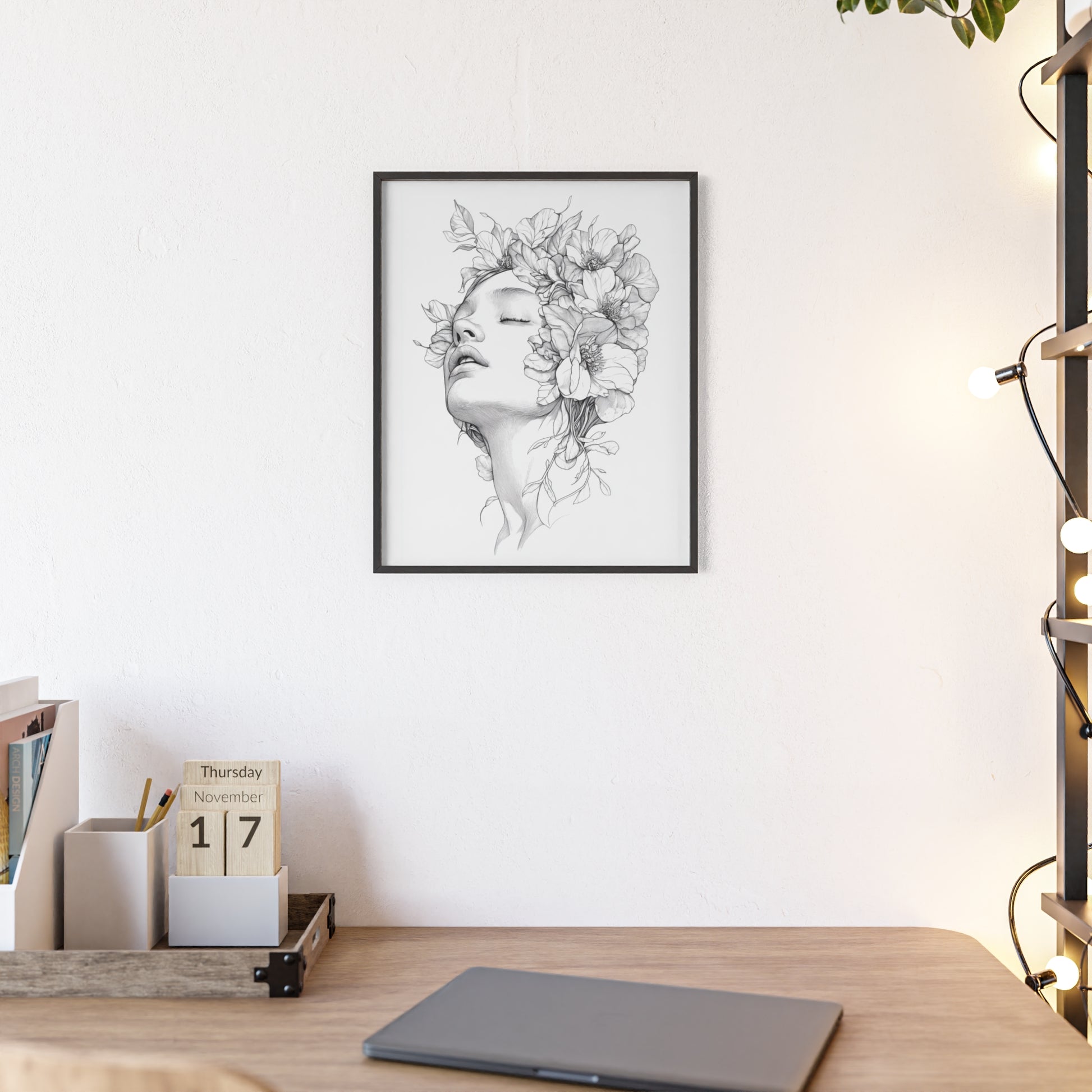 Dieses kunstvolle Poster zeigt das fein gezeichnete Portrait einer Frau, deren Gesicht von zarten Blüten umrahmt wird. Die Kombination aus klaren Linien und weichen floralen Formen verleiht dem Motiv eine einzigartige Balance zwischen Stärke und Zerbrechlichkeit – pure Eleganz in Schwarz-Weiß.