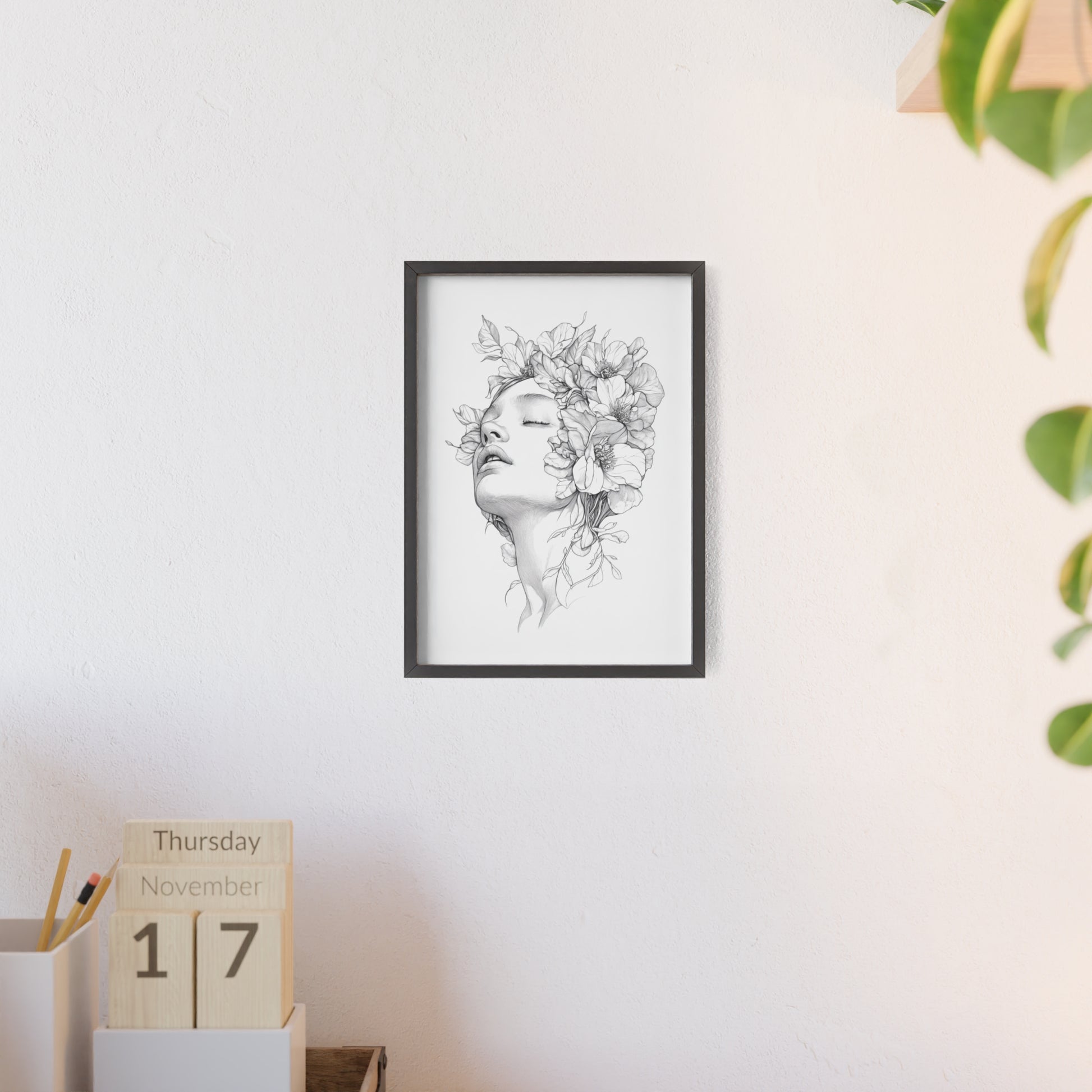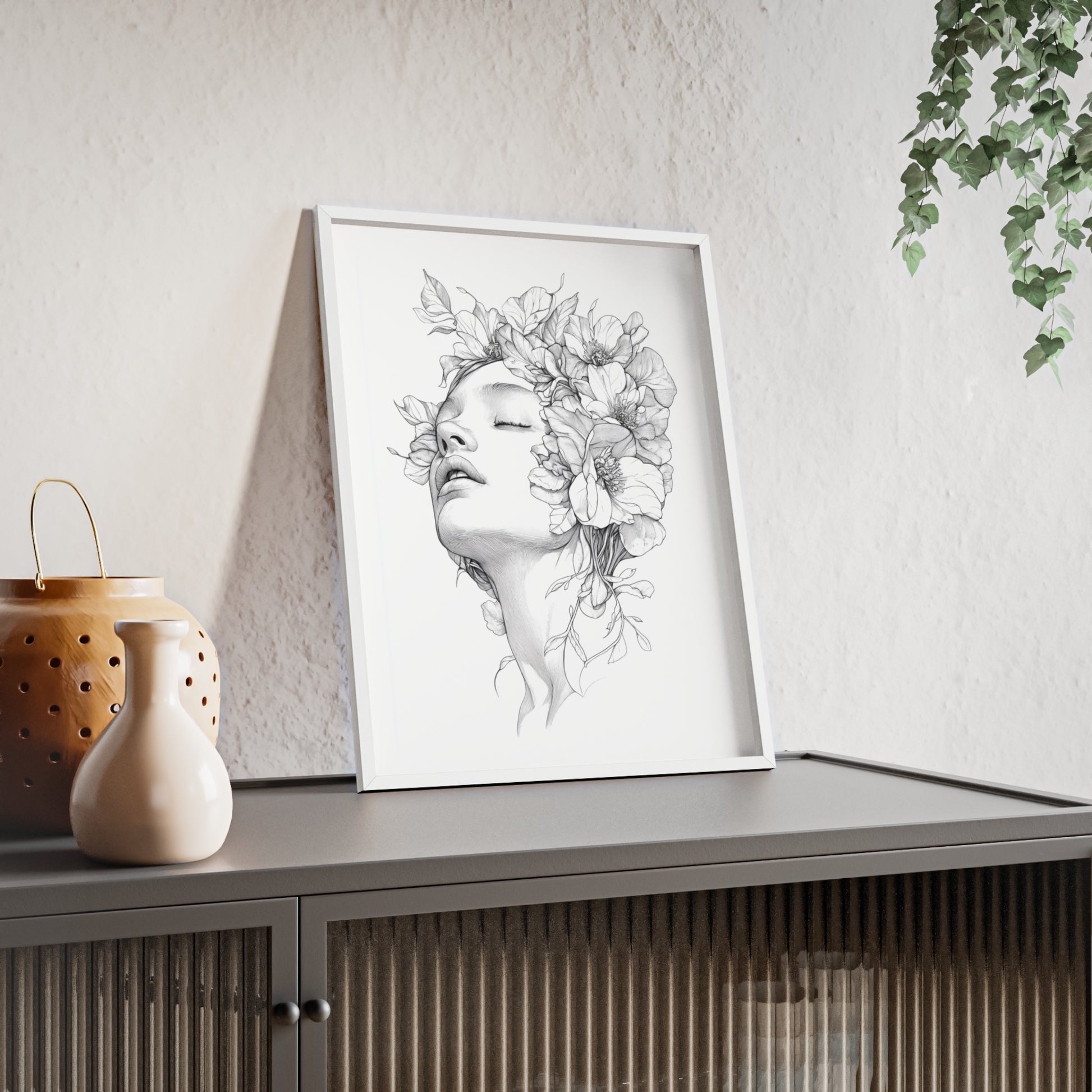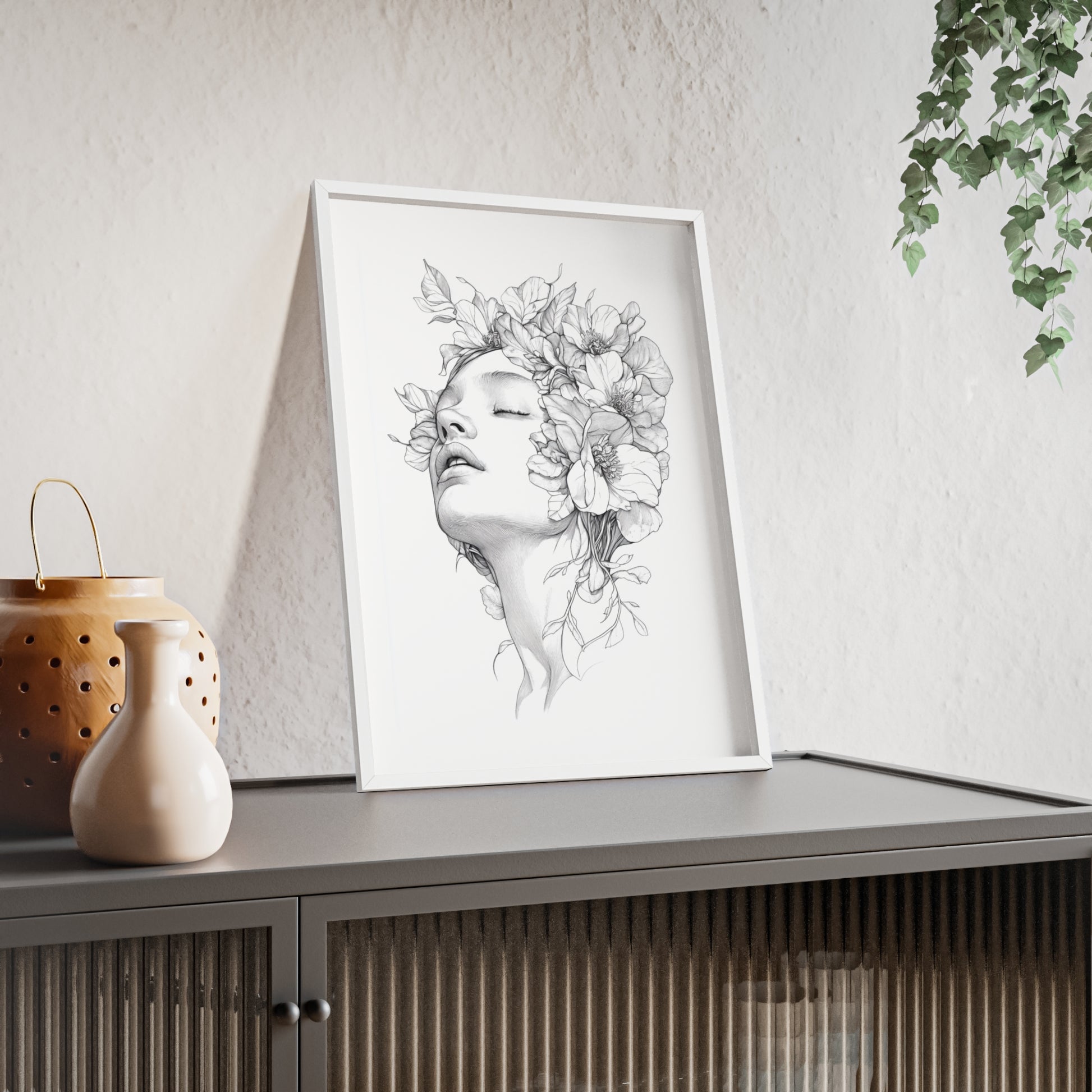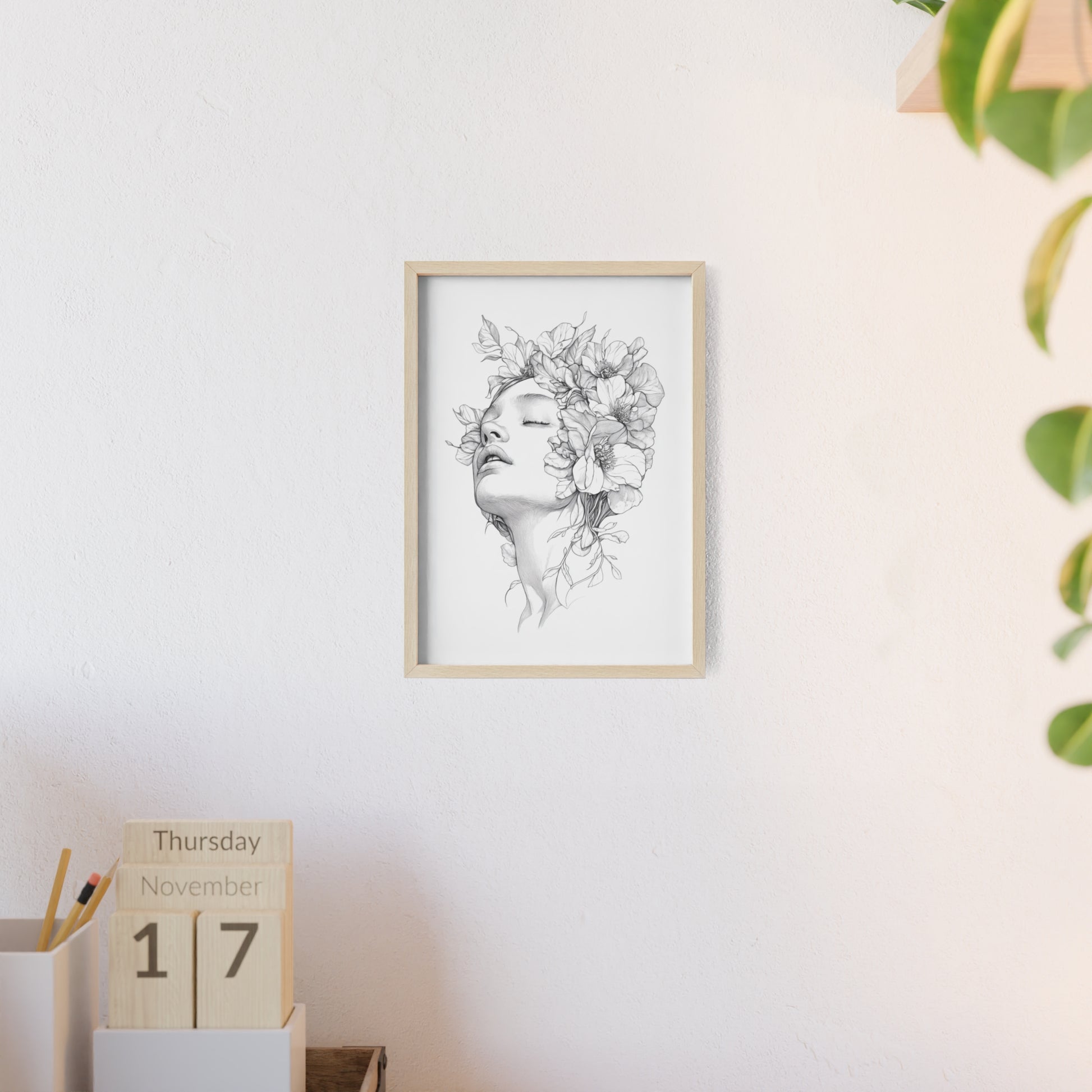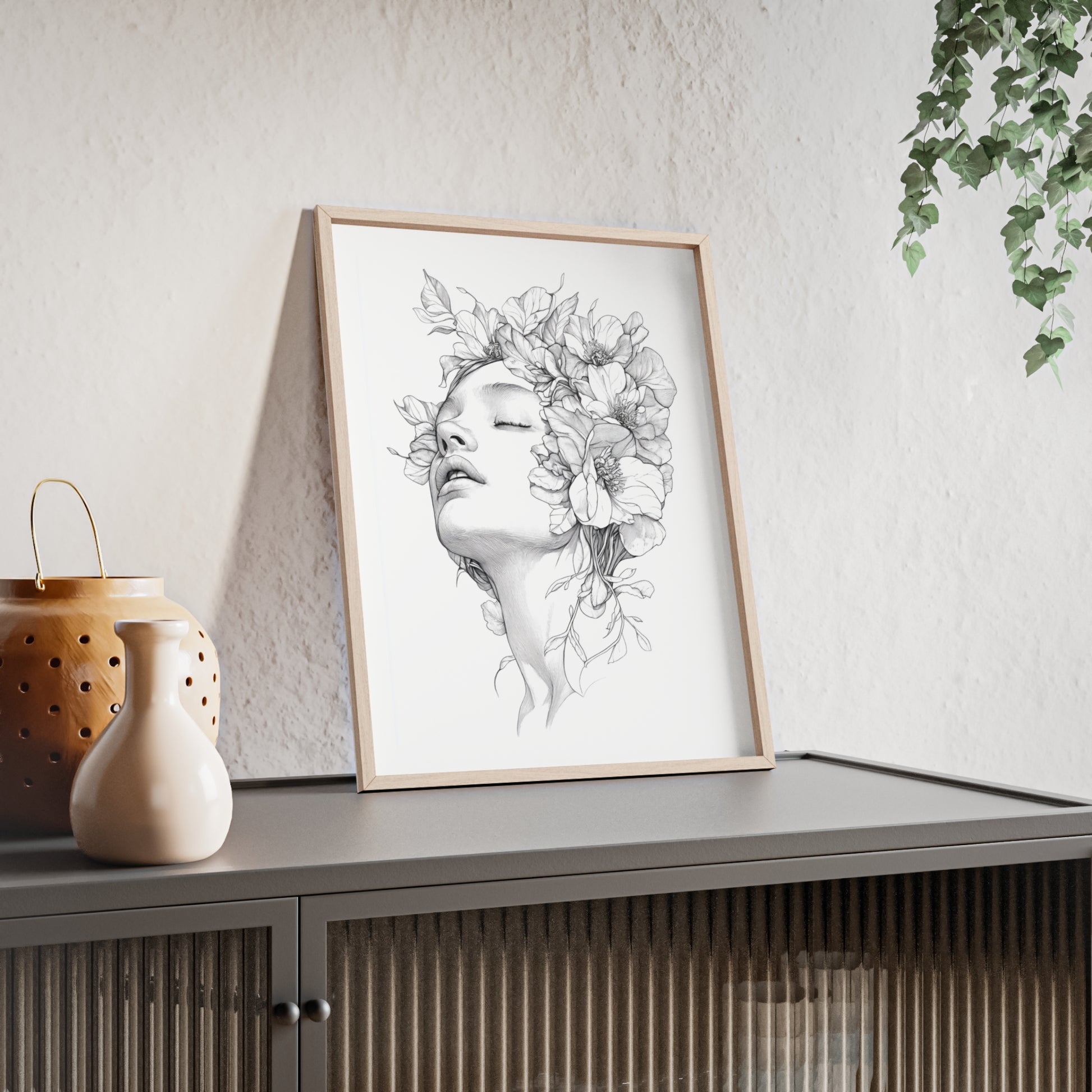 Dieses kunstvolle Poster zeigt das fein gezeichnete Portrait einer Frau, deren Gesicht von zarten Blüten umrahmt wird. Die Kombination aus klaren Linien und weichen floralen Formen verleiht dem Motiv eine einzigartige Balance zwischen Stärke und Zerbrechlichkeit – pure Eleganz in Schwarz-Weiß.