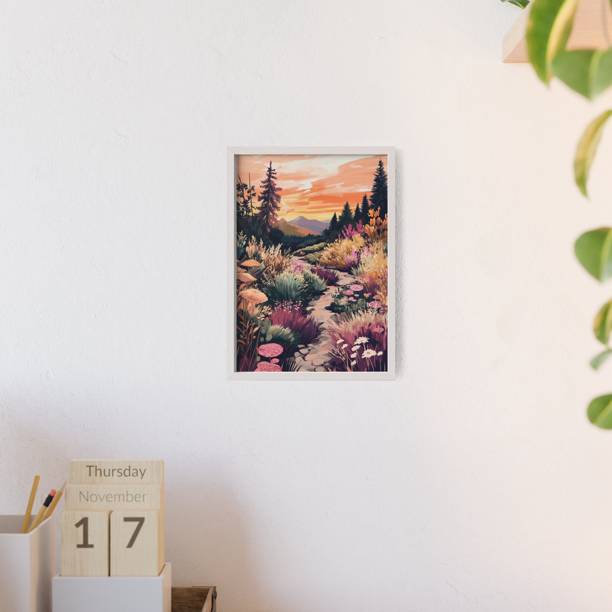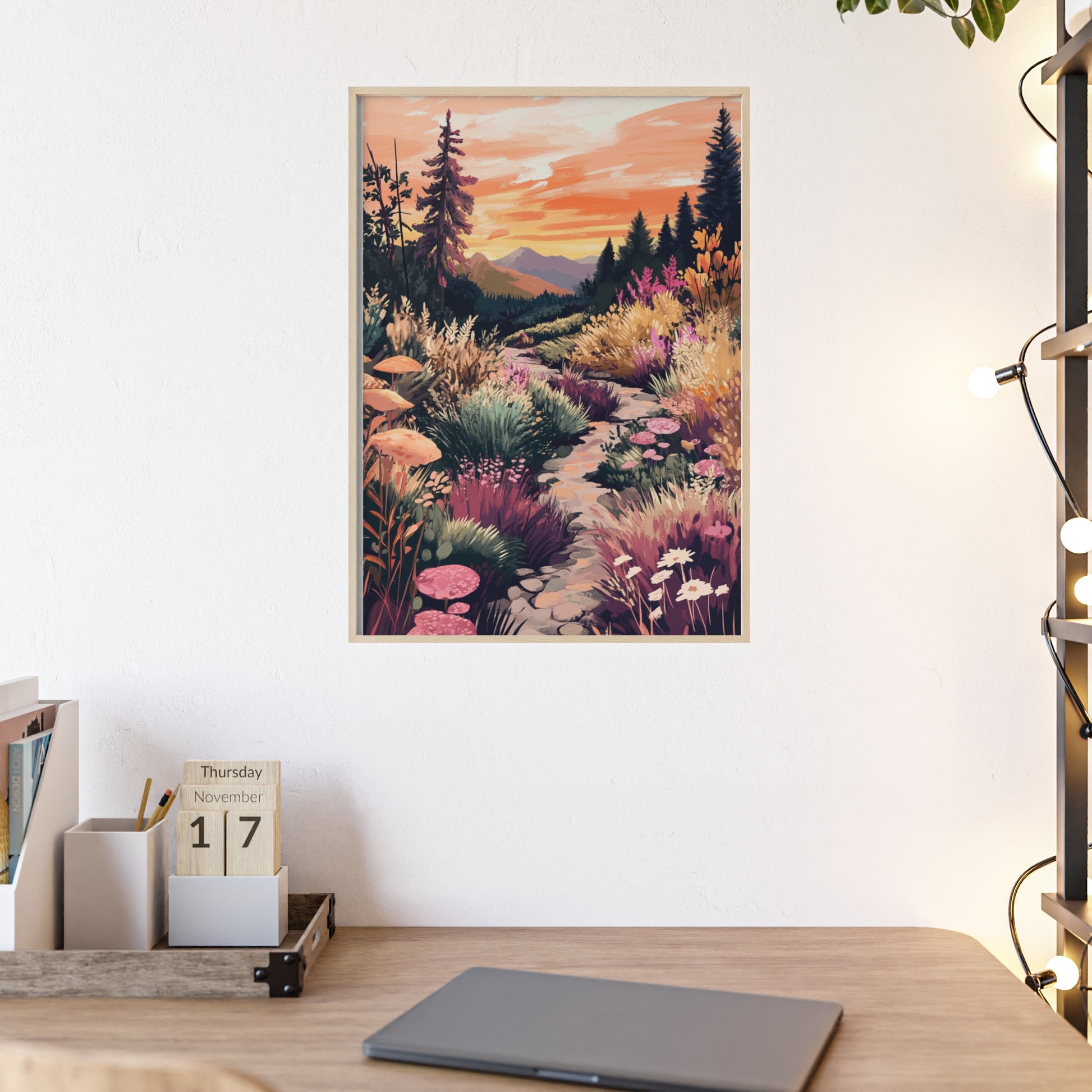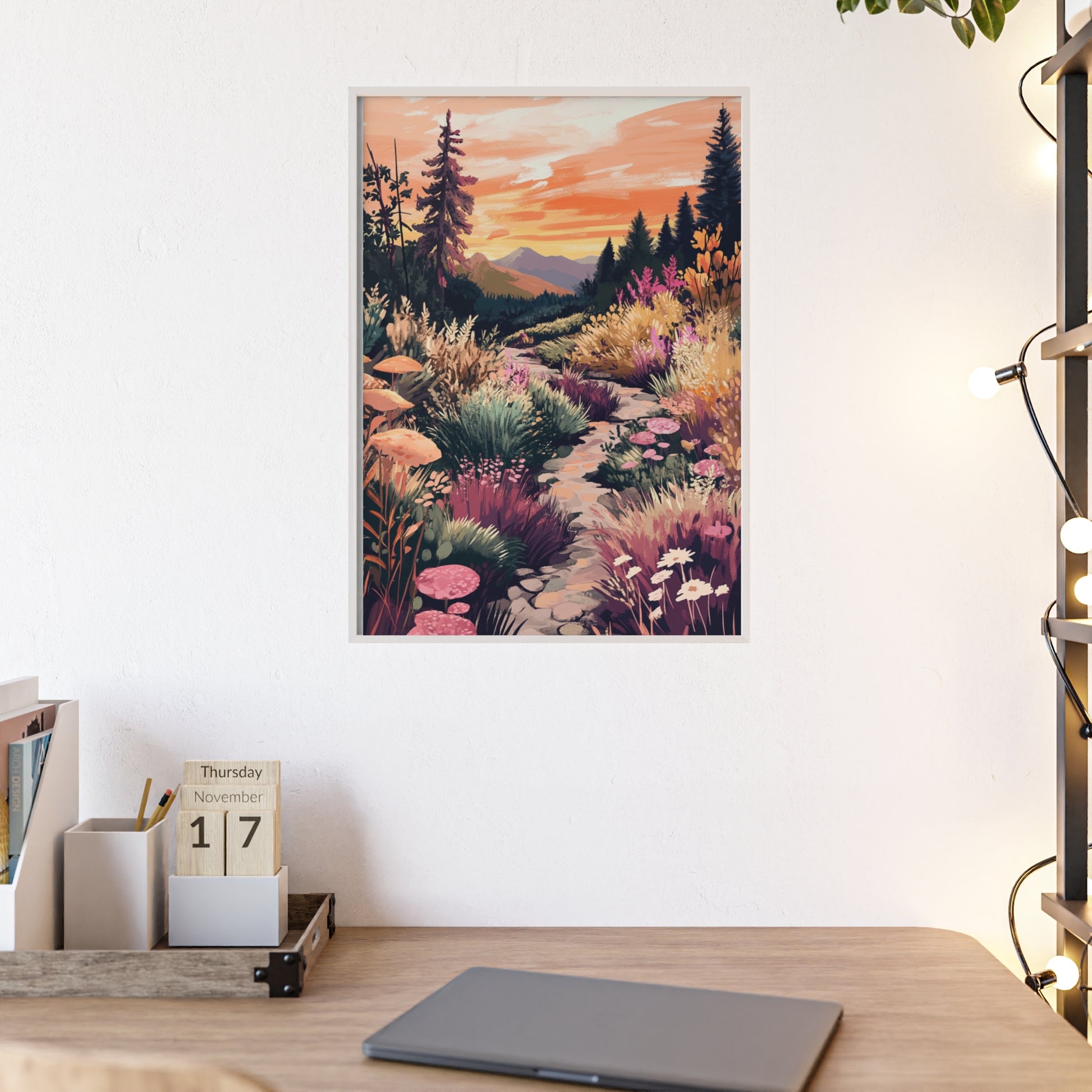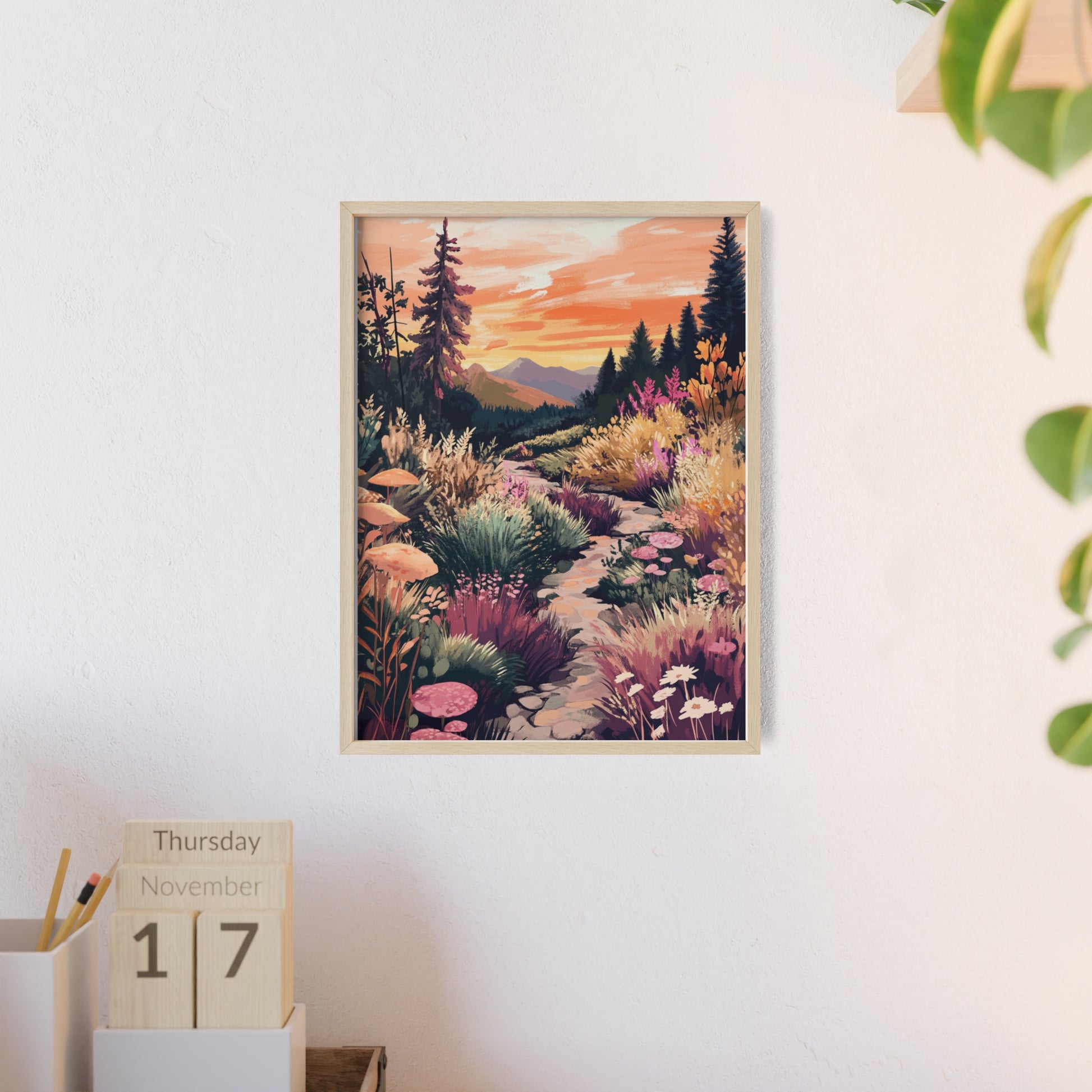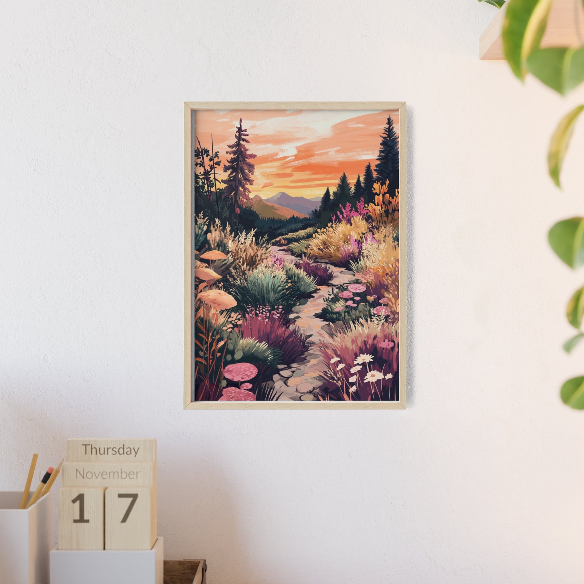 Dieses stimmungsvolle Poster zeigt einen malerischen Pfad, der sich durch eine farbenfrohe Landschaft schlängelt – umgeben von wilden Blumen, sanftem Licht und einer goldenen Abendsonne.