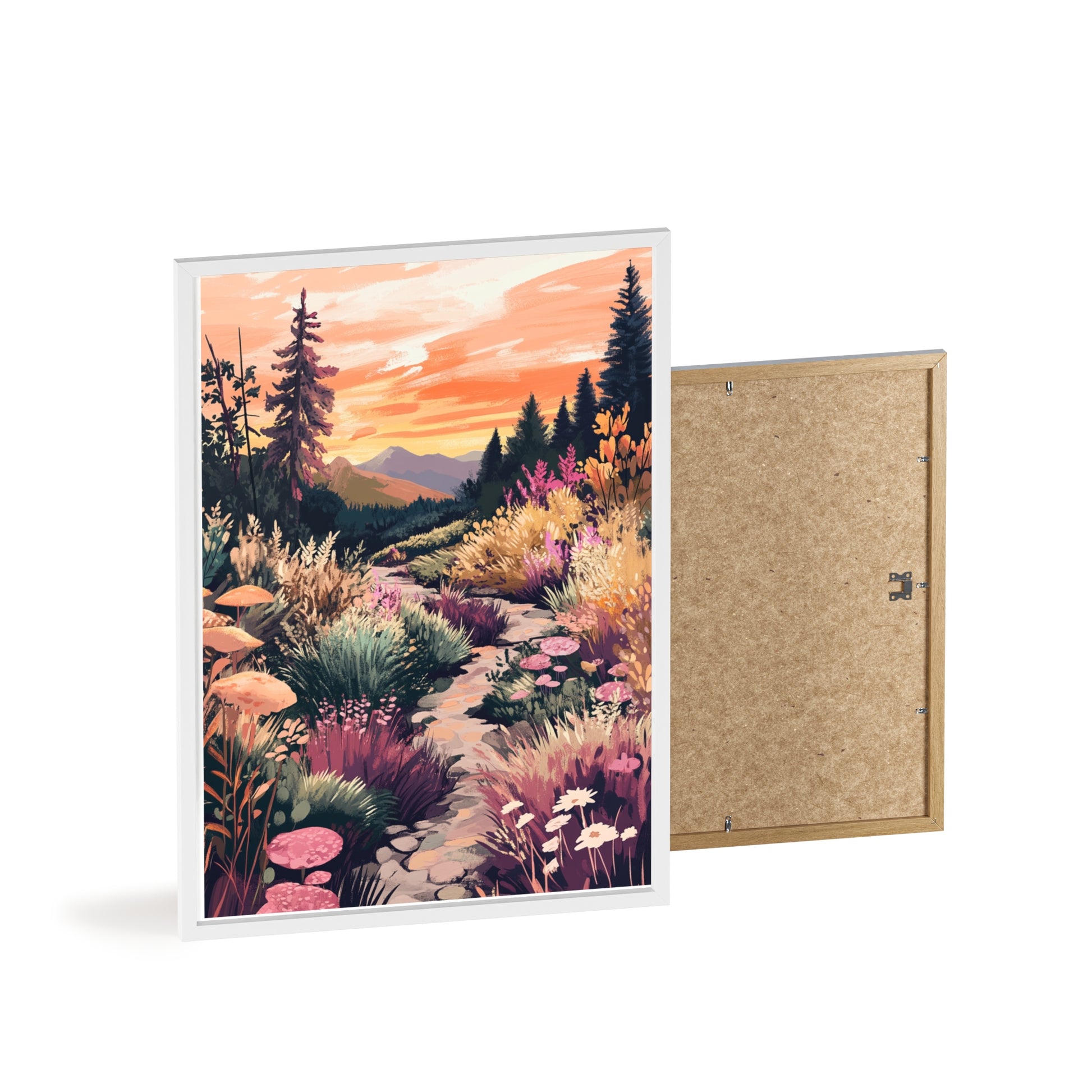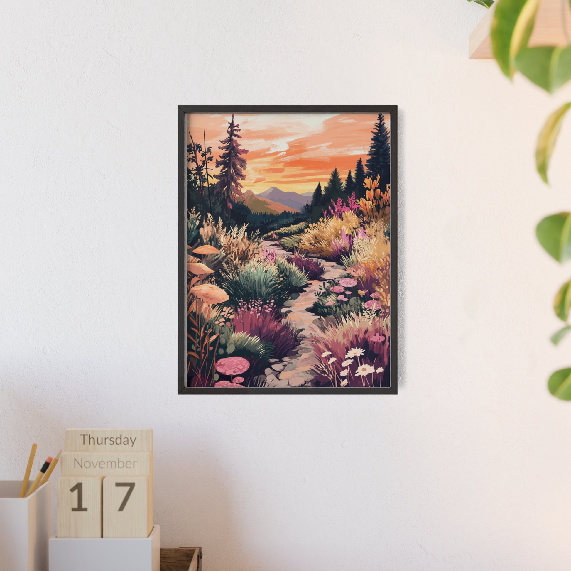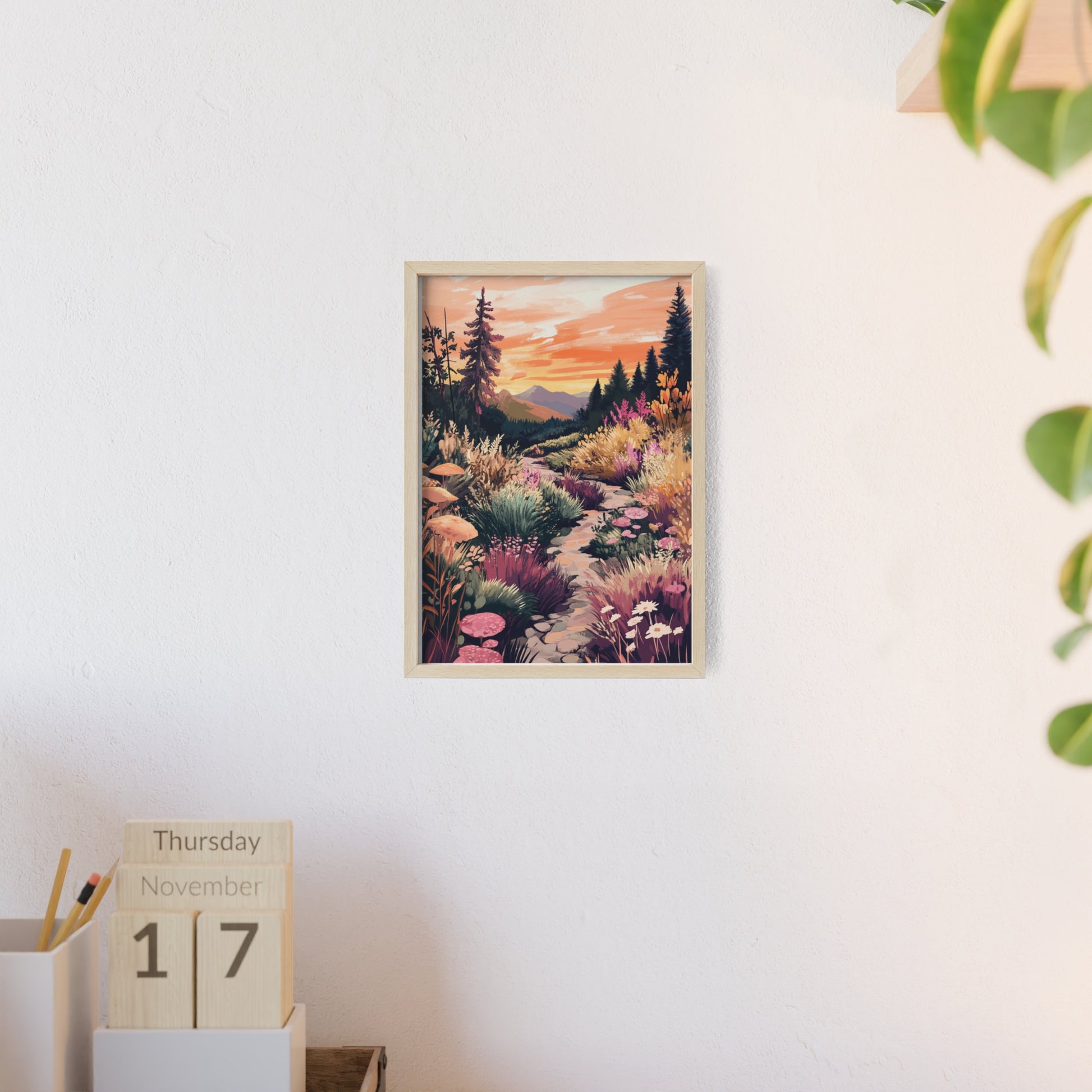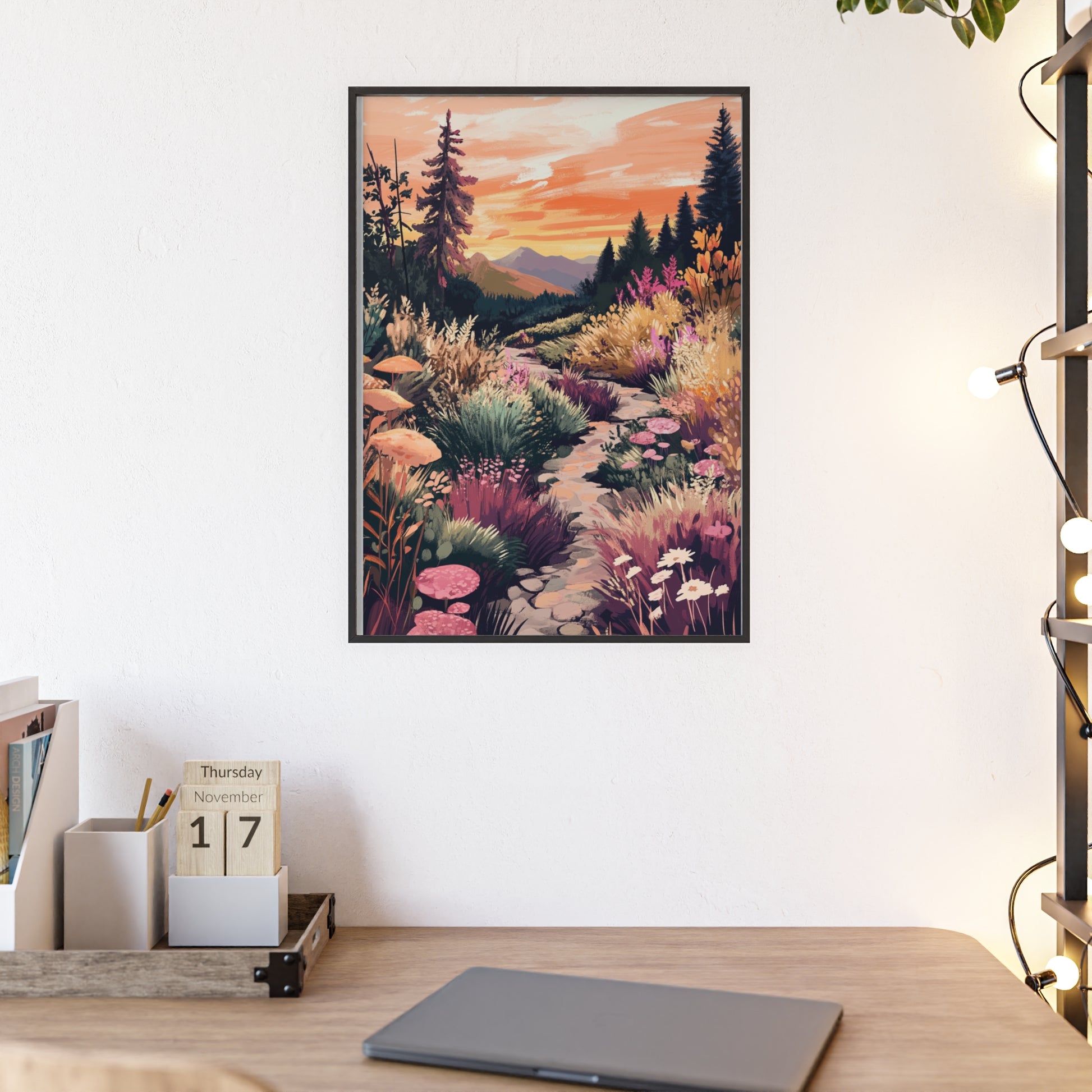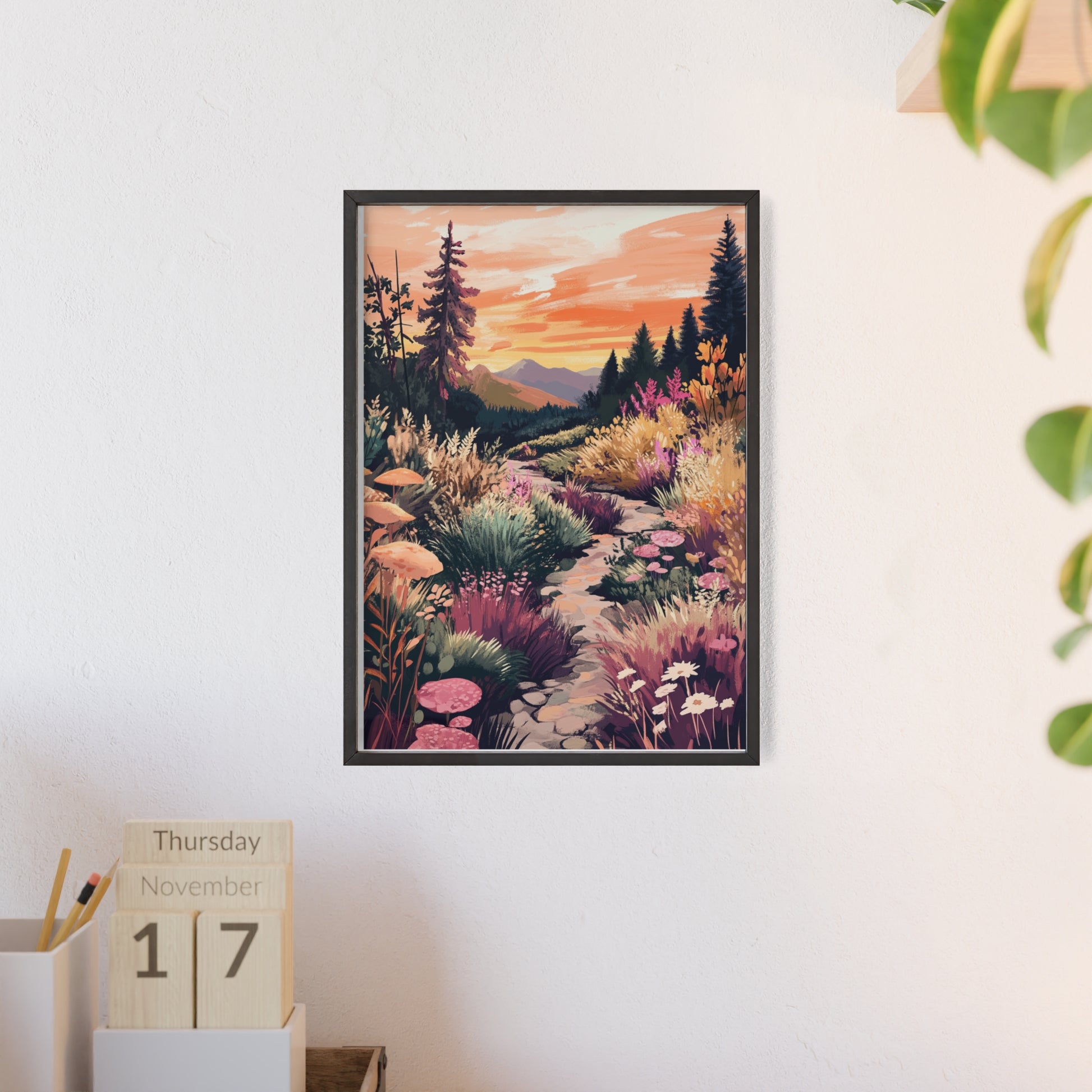 Dieses stimmungsvolle Poster zeigt einen malerischen Pfad, der sich durch eine farbenfrohe Landschaft schlängelt – umgeben von wilden Blumen, sanftem Licht und einer goldenen Abendsonne.