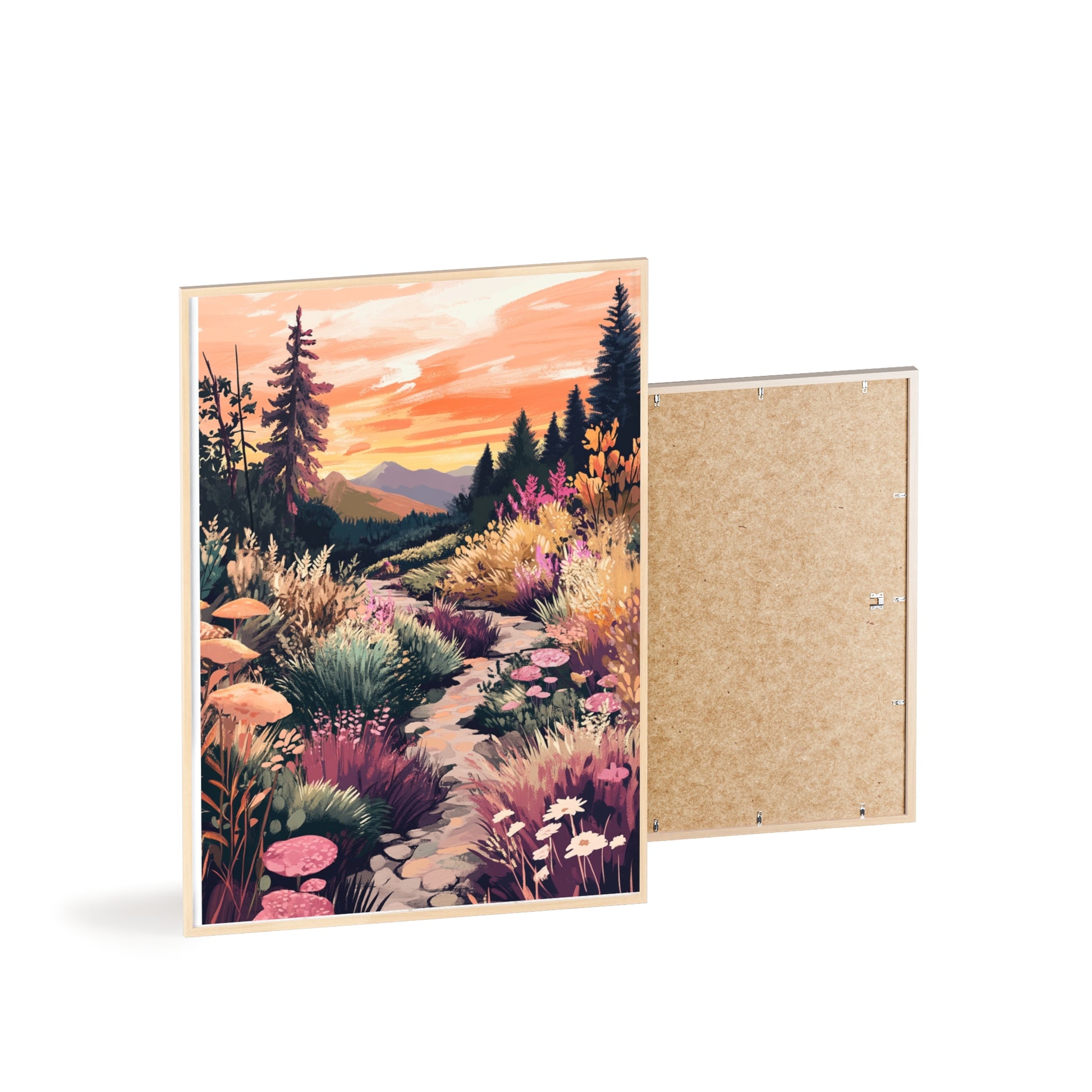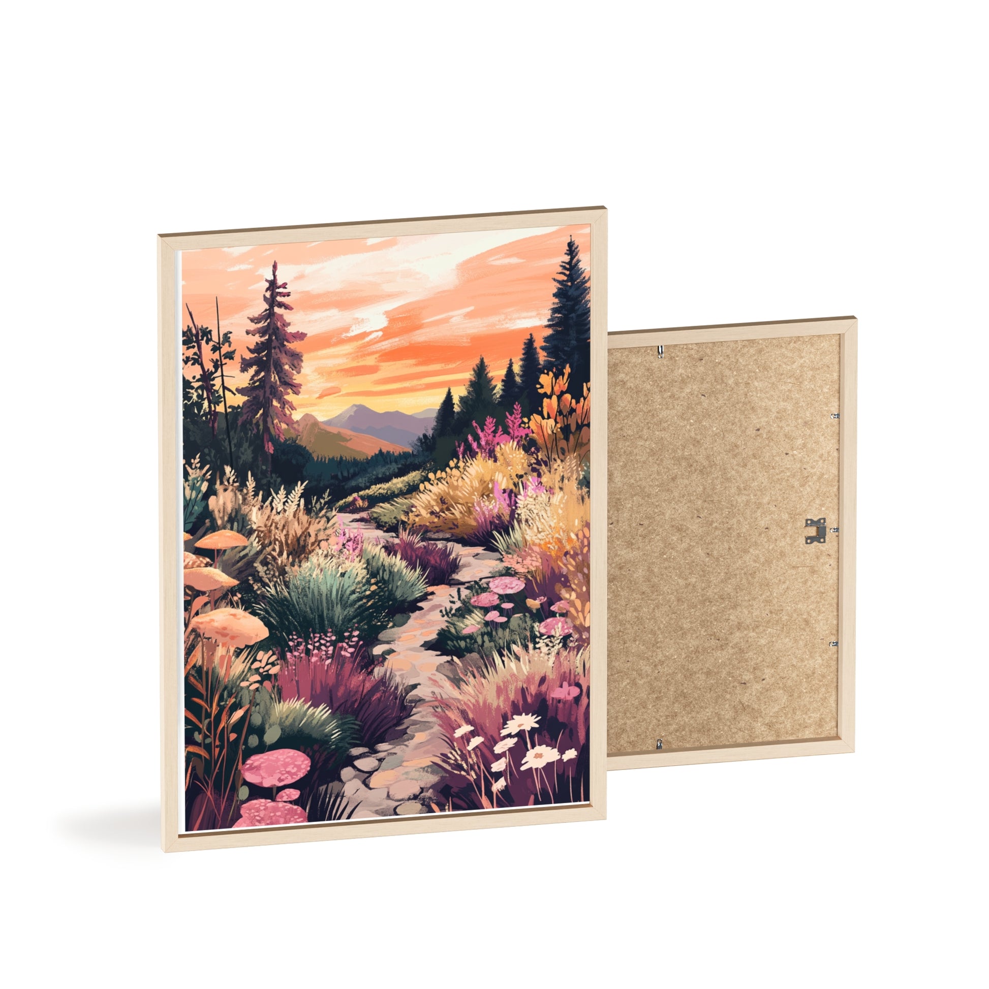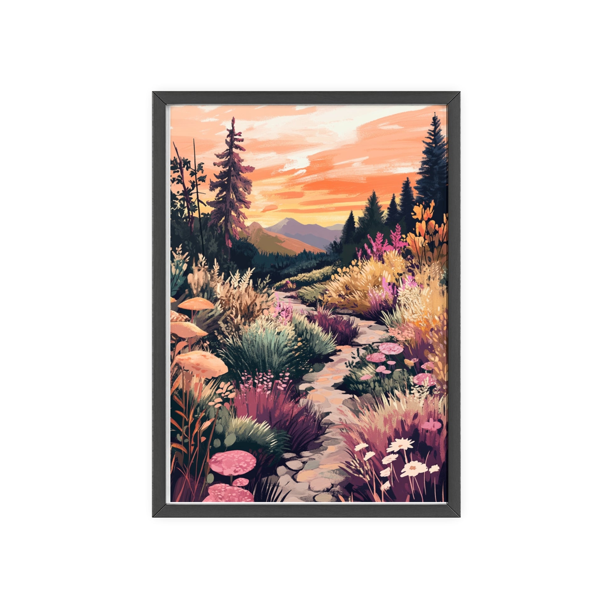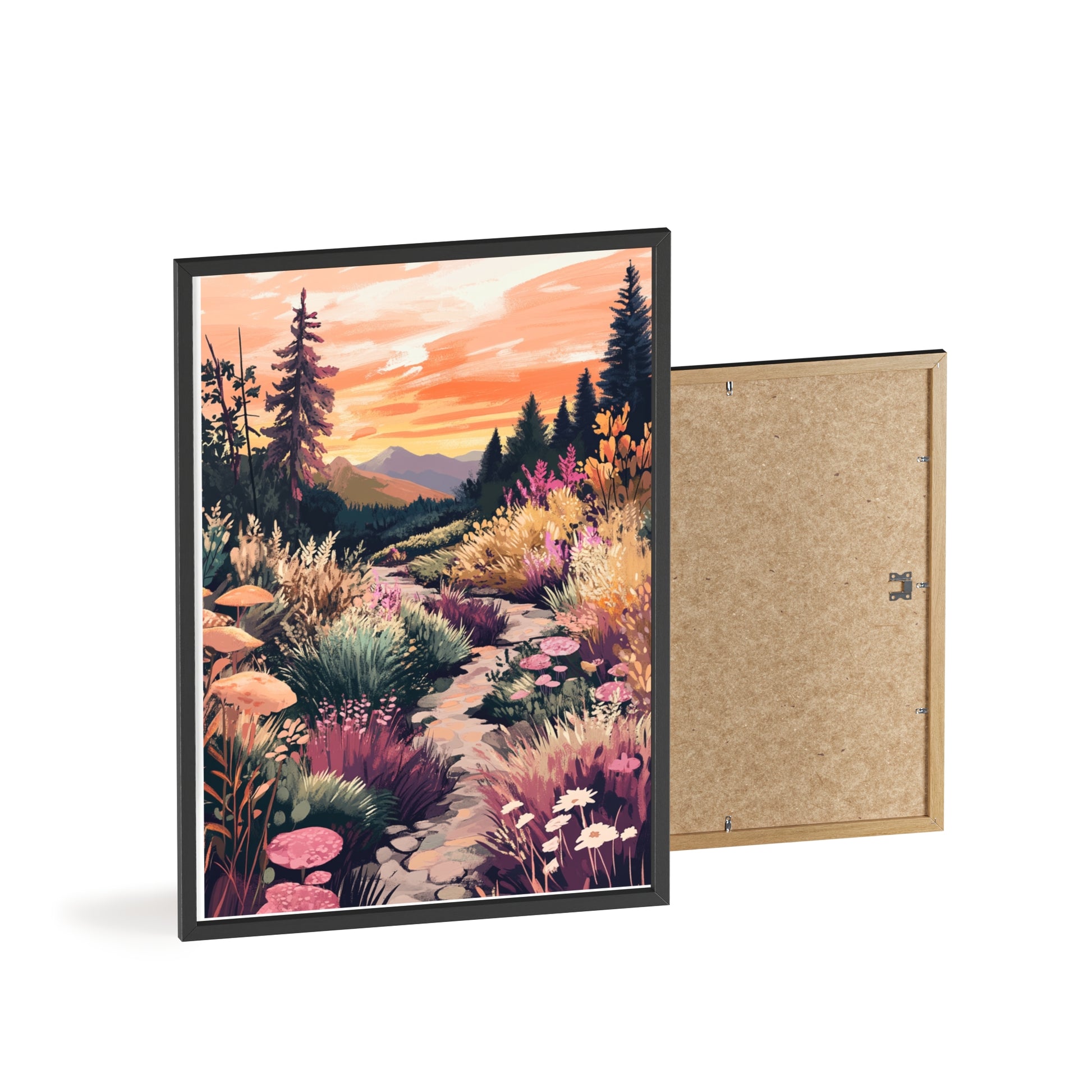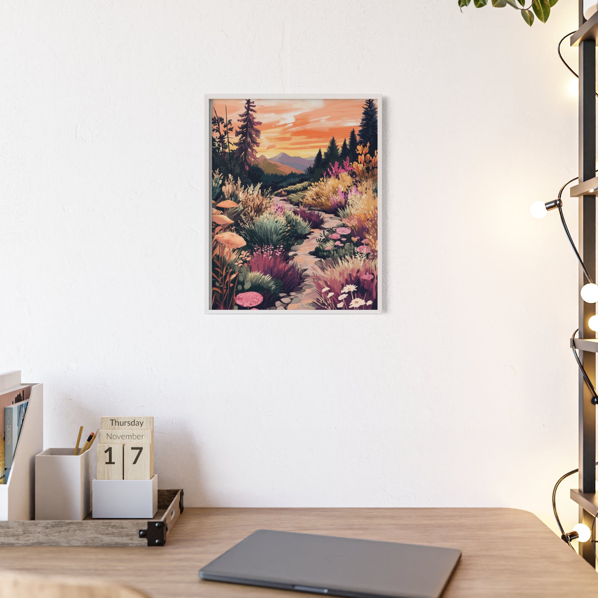 Dieses stimmungsvolle Poster zeigt einen malerischen Pfad, der sich durch eine farbenfrohe Landschaft schlängelt – umgeben von wilden Blumen, sanftem Licht und einer goldenen Abendsonne.