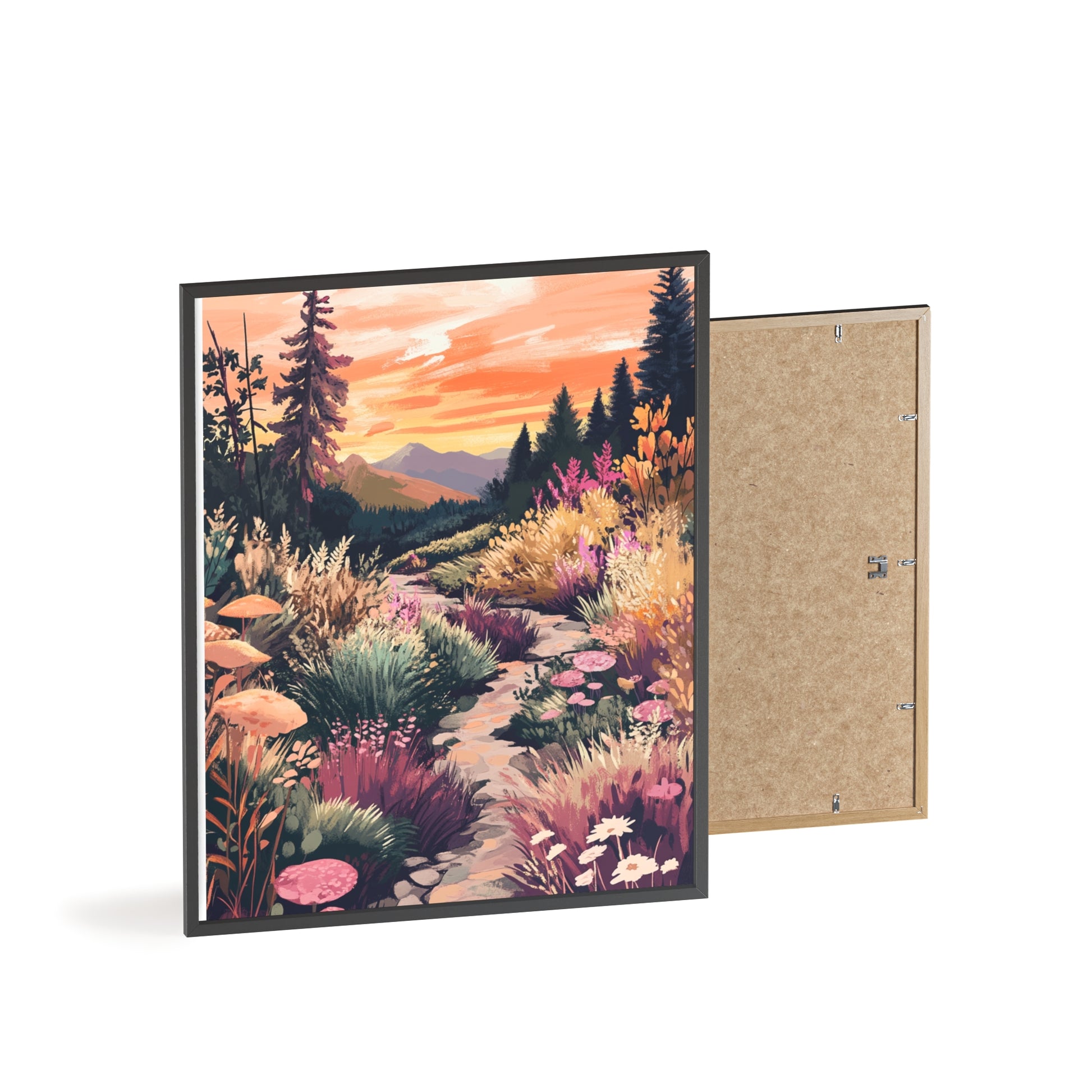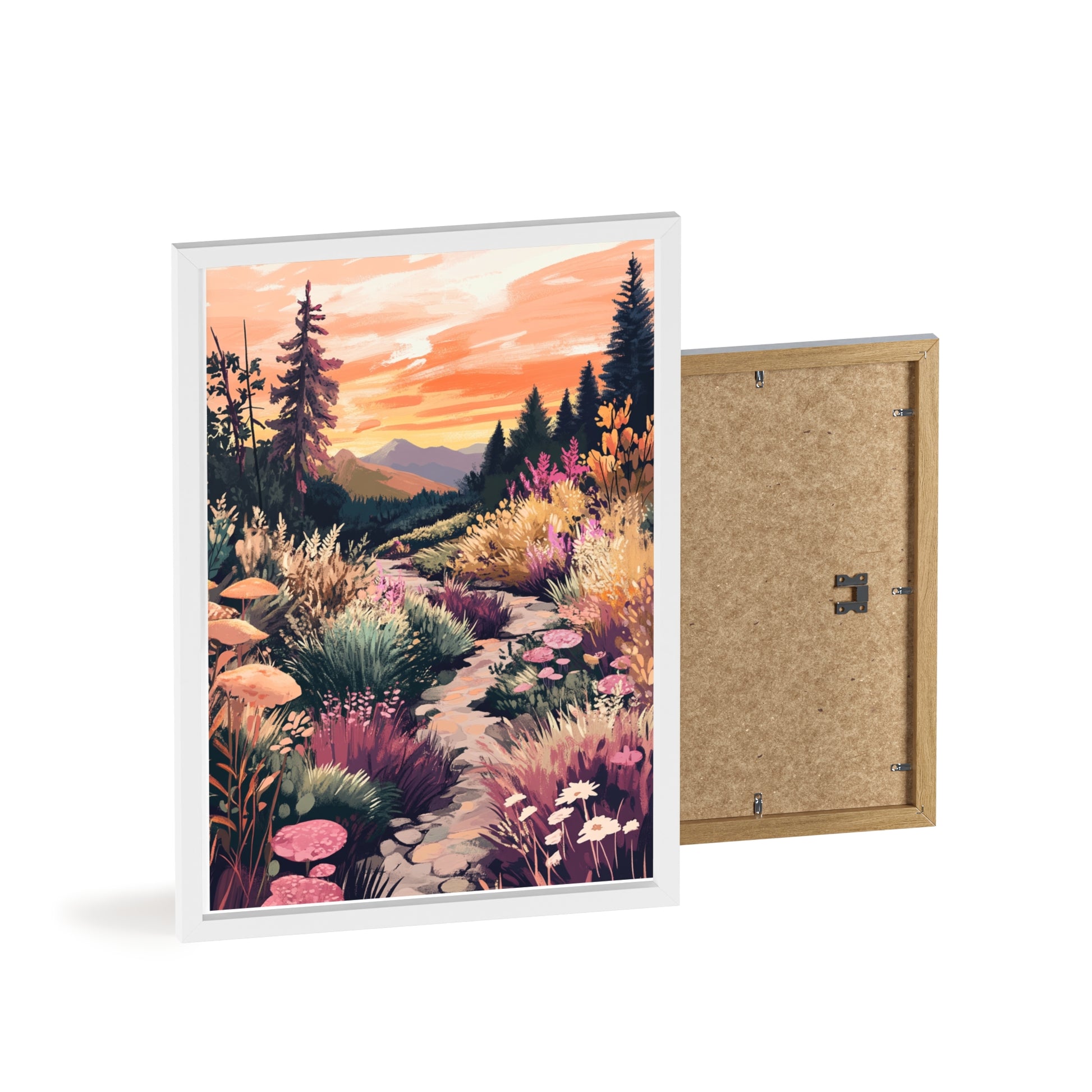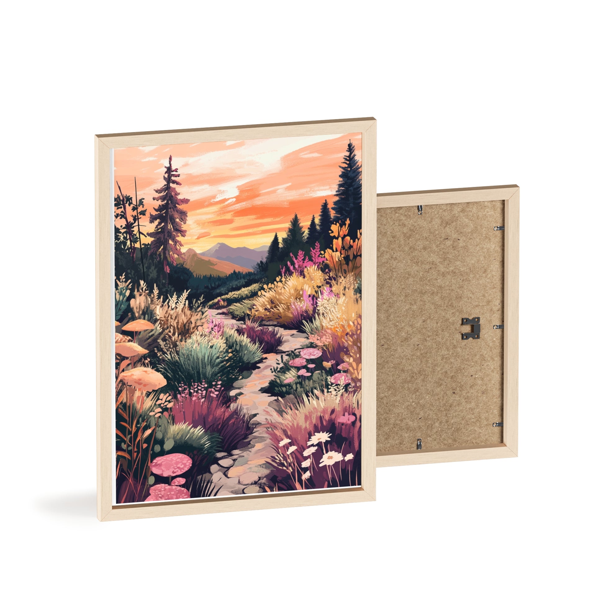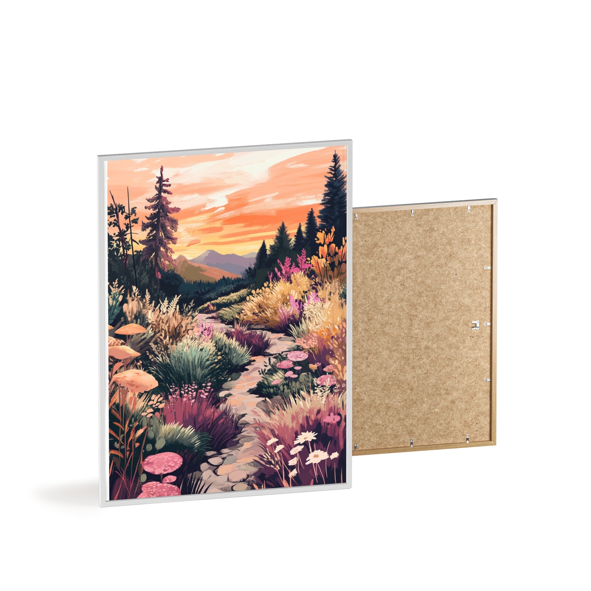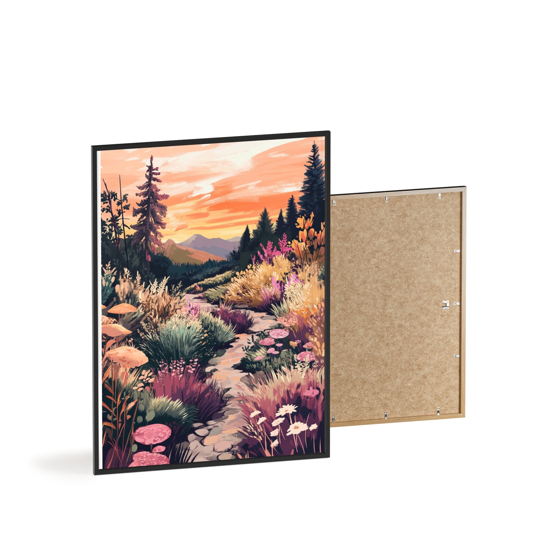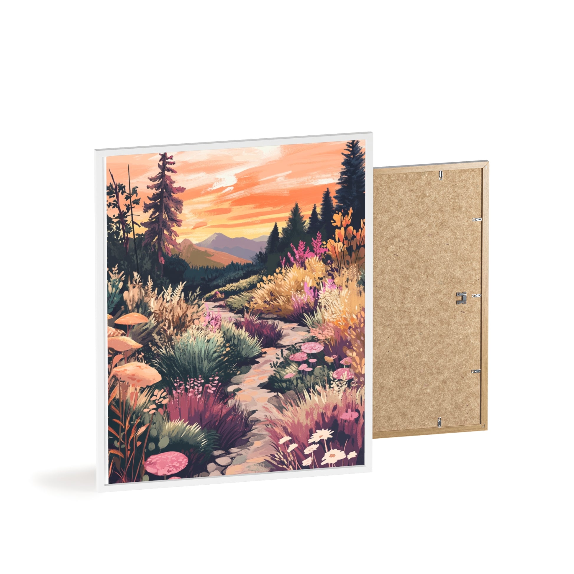 Dieses stimmungsvolle Poster zeigt einen malerischen Pfad, der sich durch eine farbenfrohe Landschaft schlängelt – umgeben von wilden Blumen, sanftem Licht und einer goldenen Abendsonne.