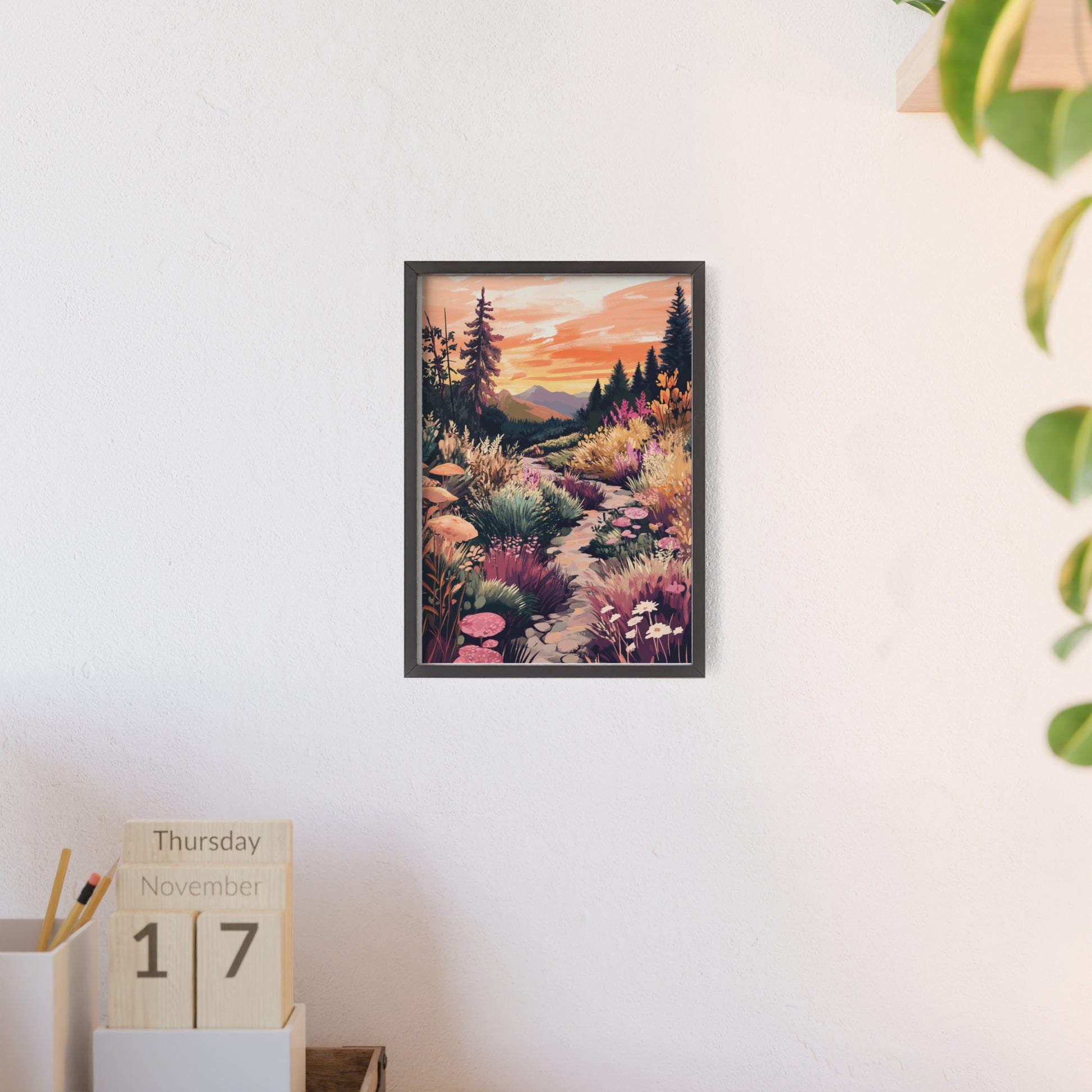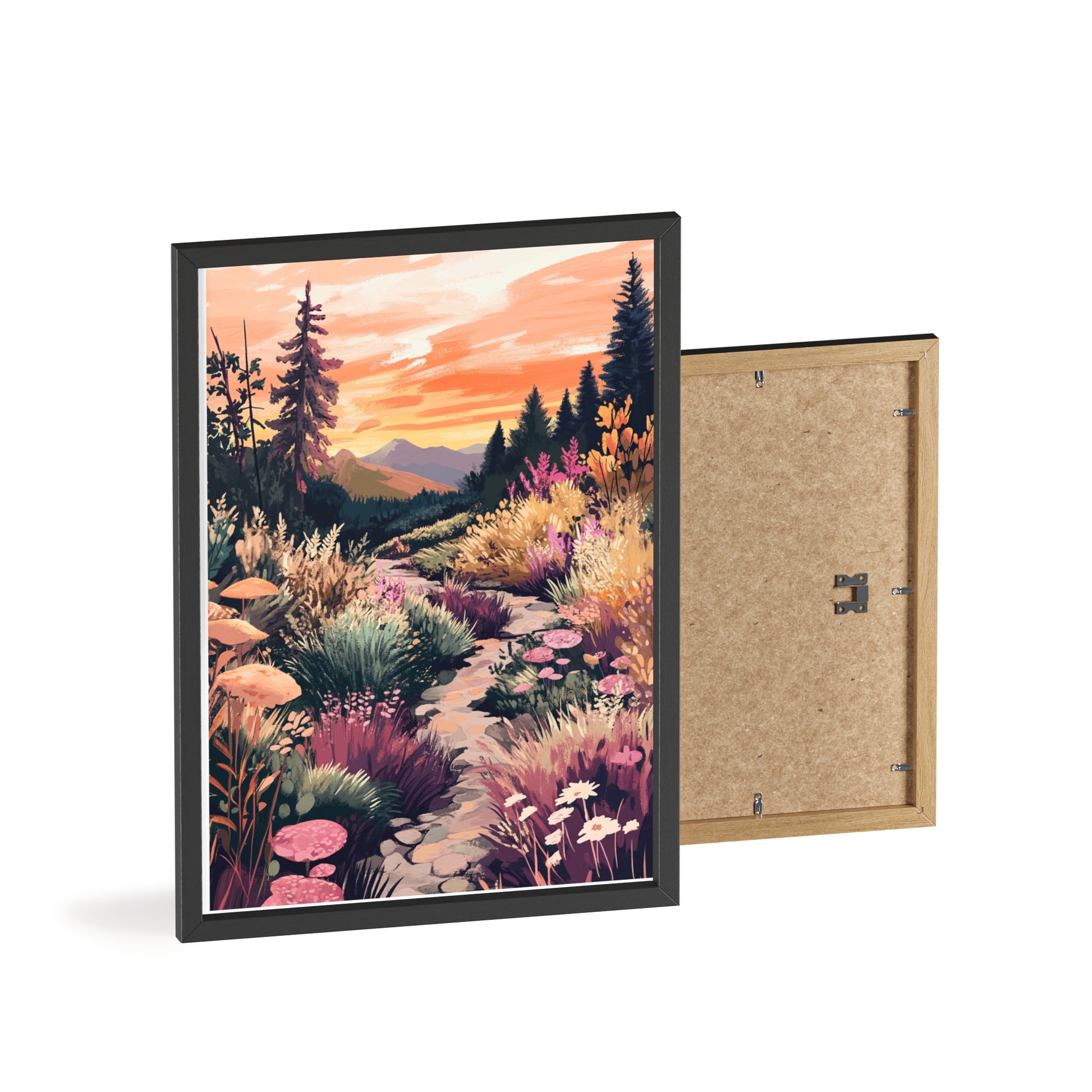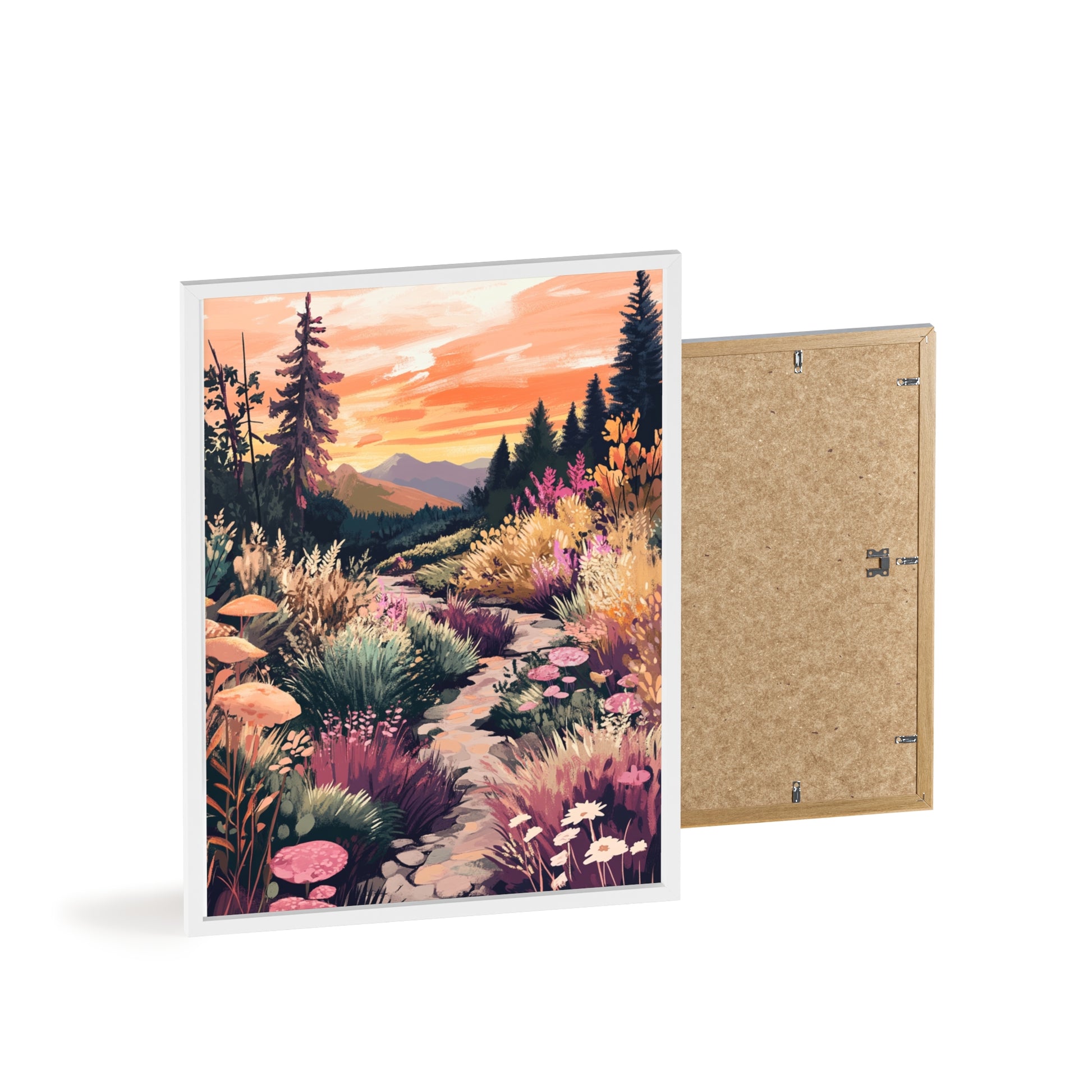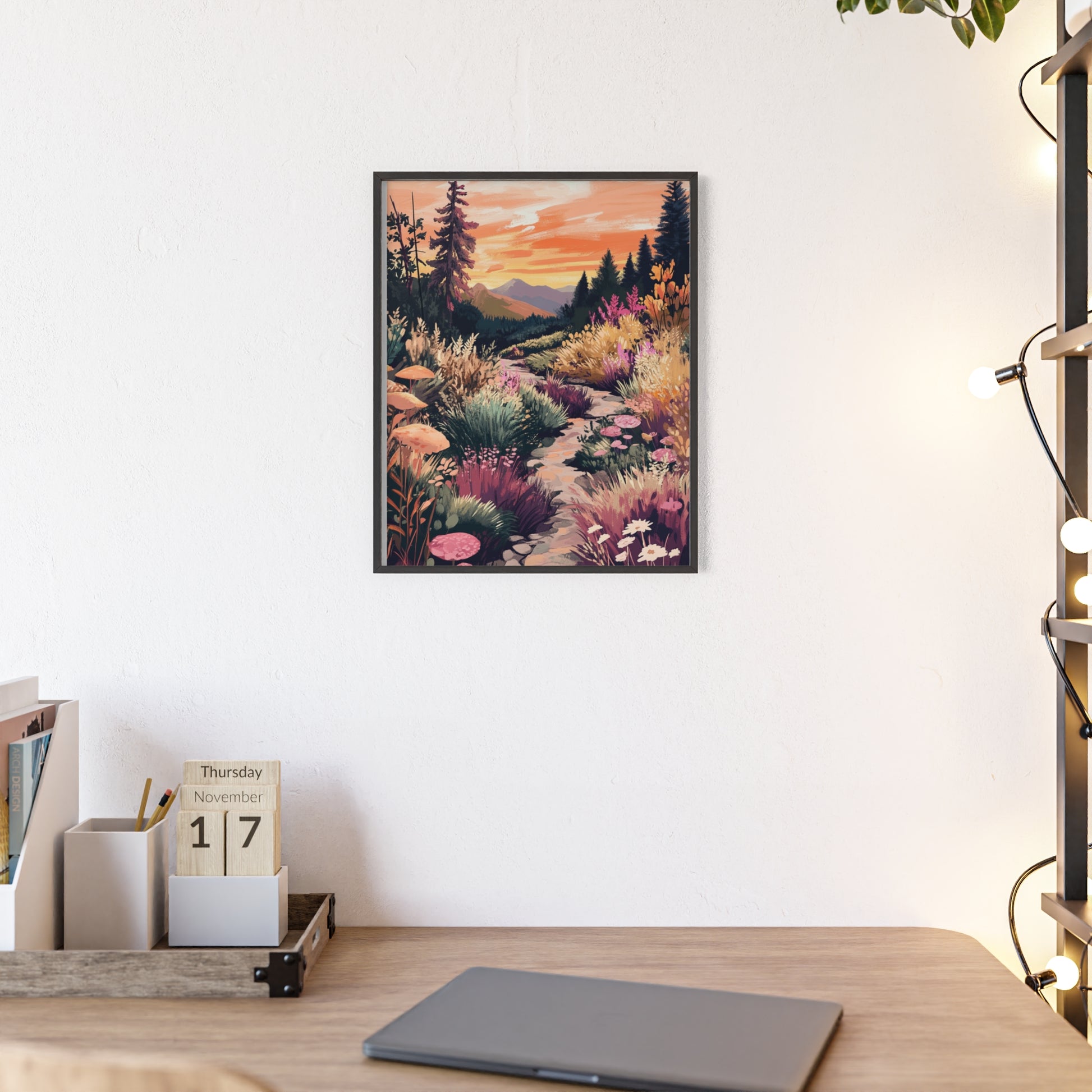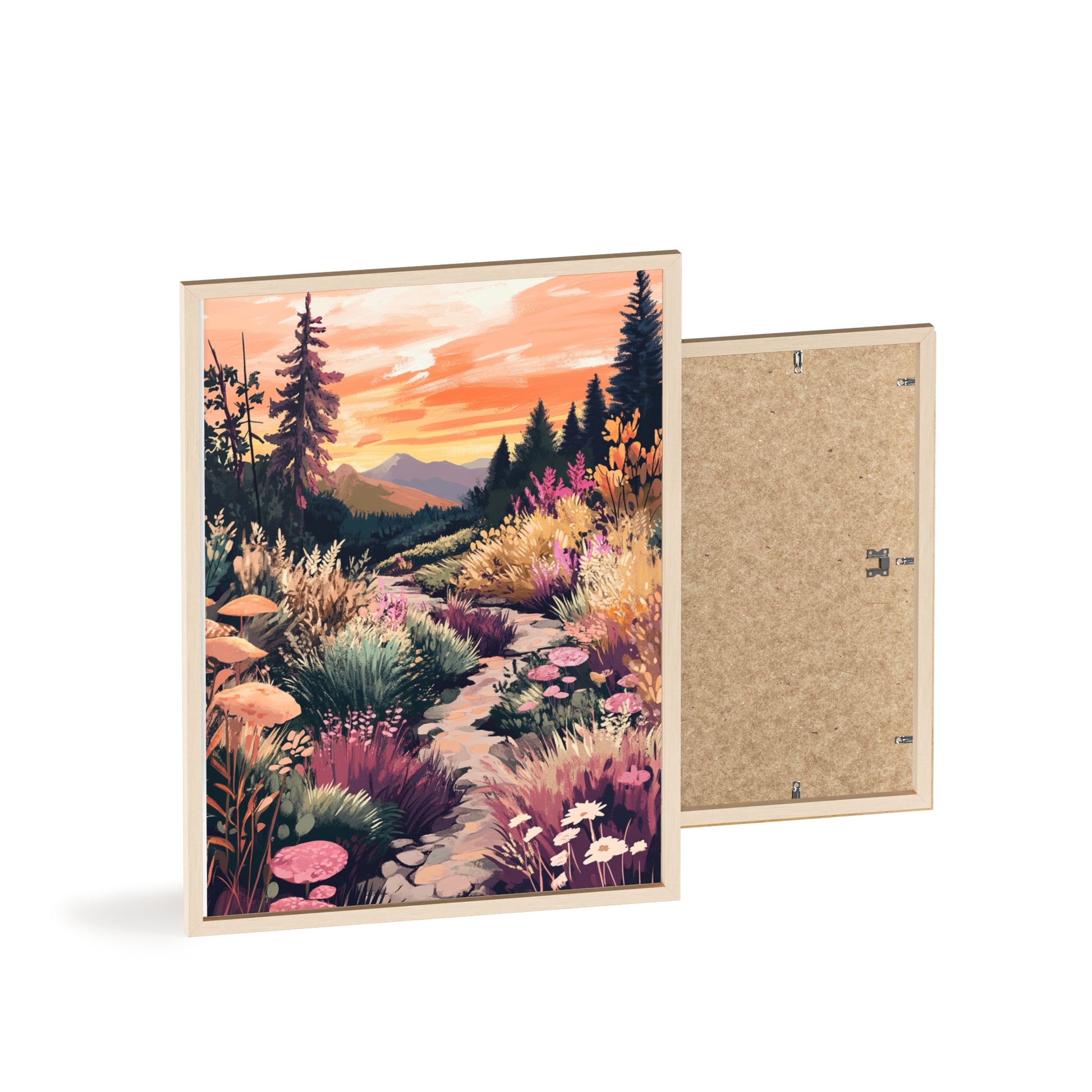 Dieses stimmungsvolle Poster zeigt einen malerischen Pfad, der sich durch eine farbenfrohe Landschaft schlängelt – umgeben von wilden Blumen, sanftem Licht und einer goldenen Abendsonne.