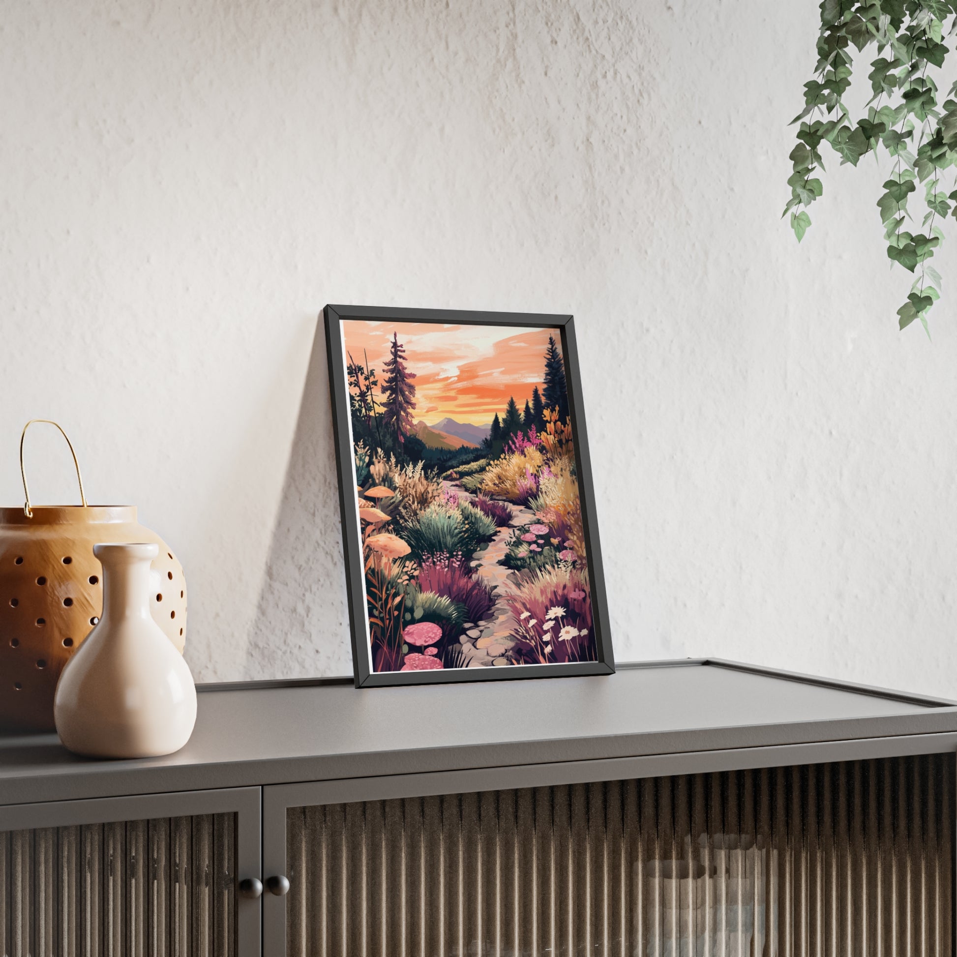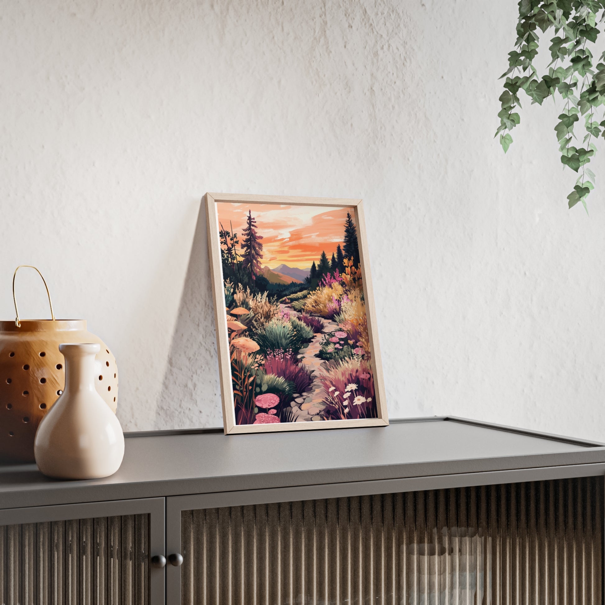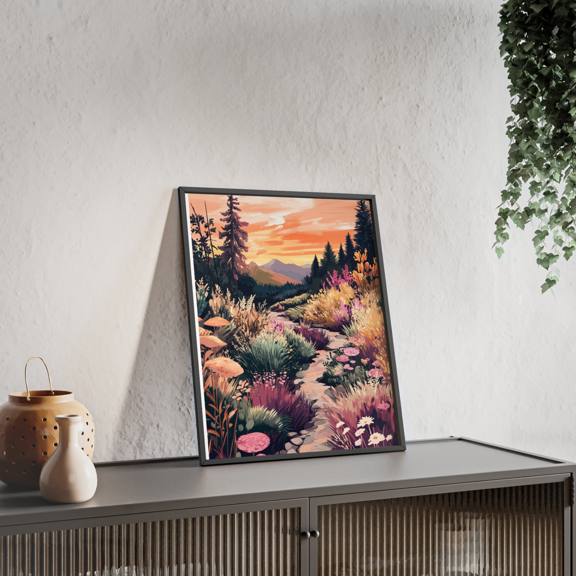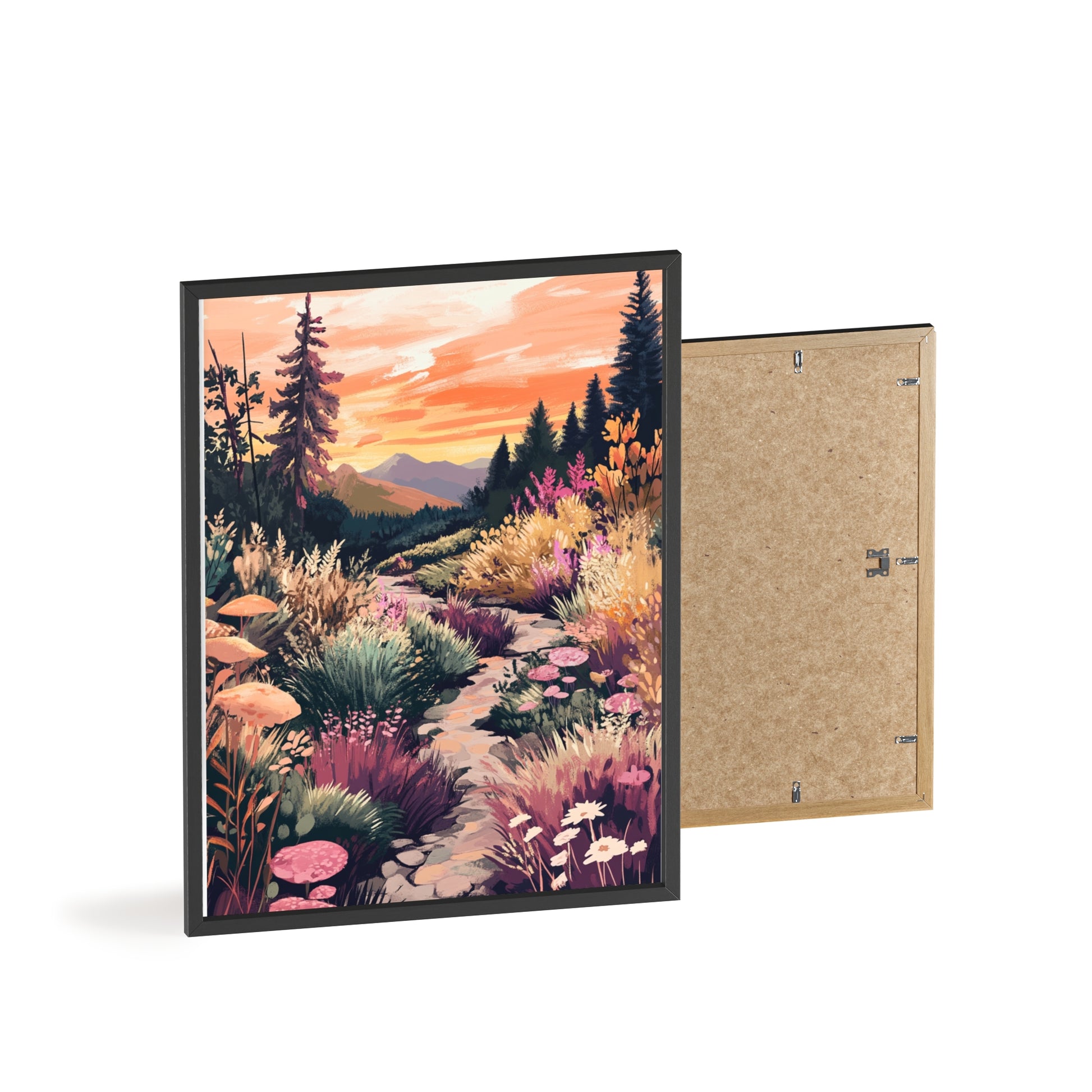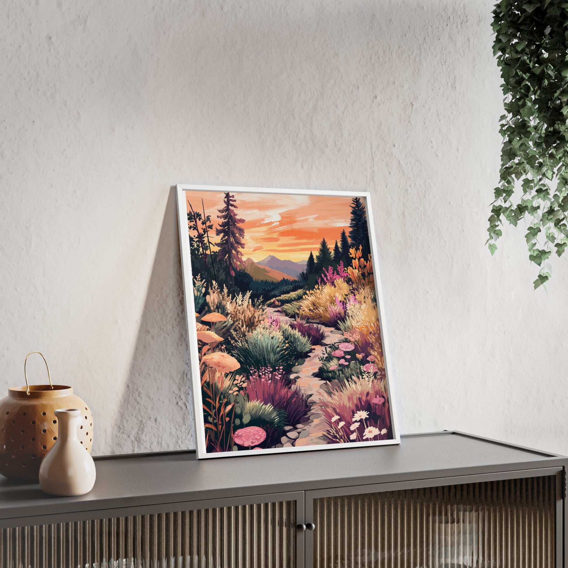 Dieses stimmungsvolle Poster zeigt einen malerischen Pfad, der sich durch eine farbenfrohe Landschaft schlängelt – umgeben von wilden Blumen, sanftem Licht und einer goldenen Abendsonne.