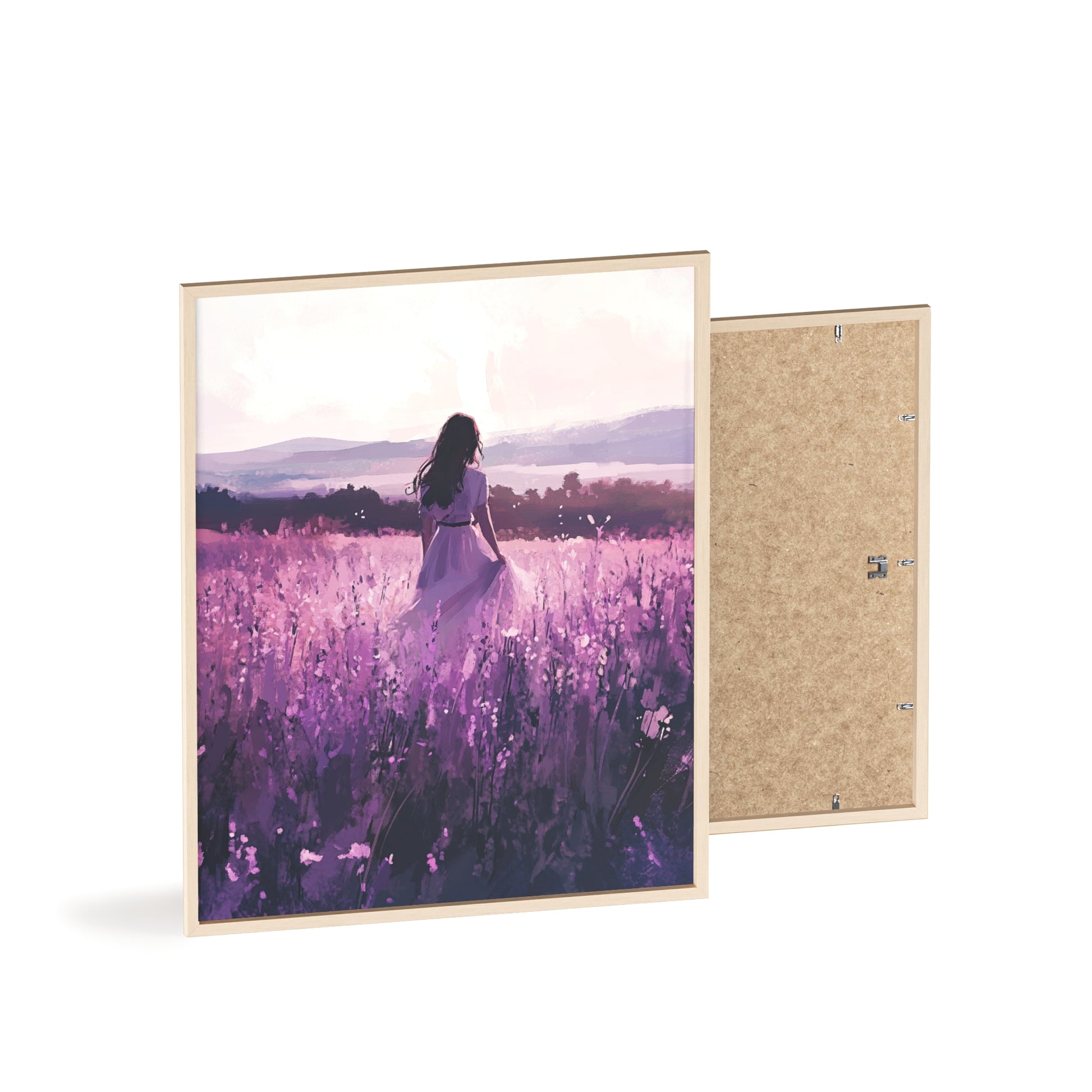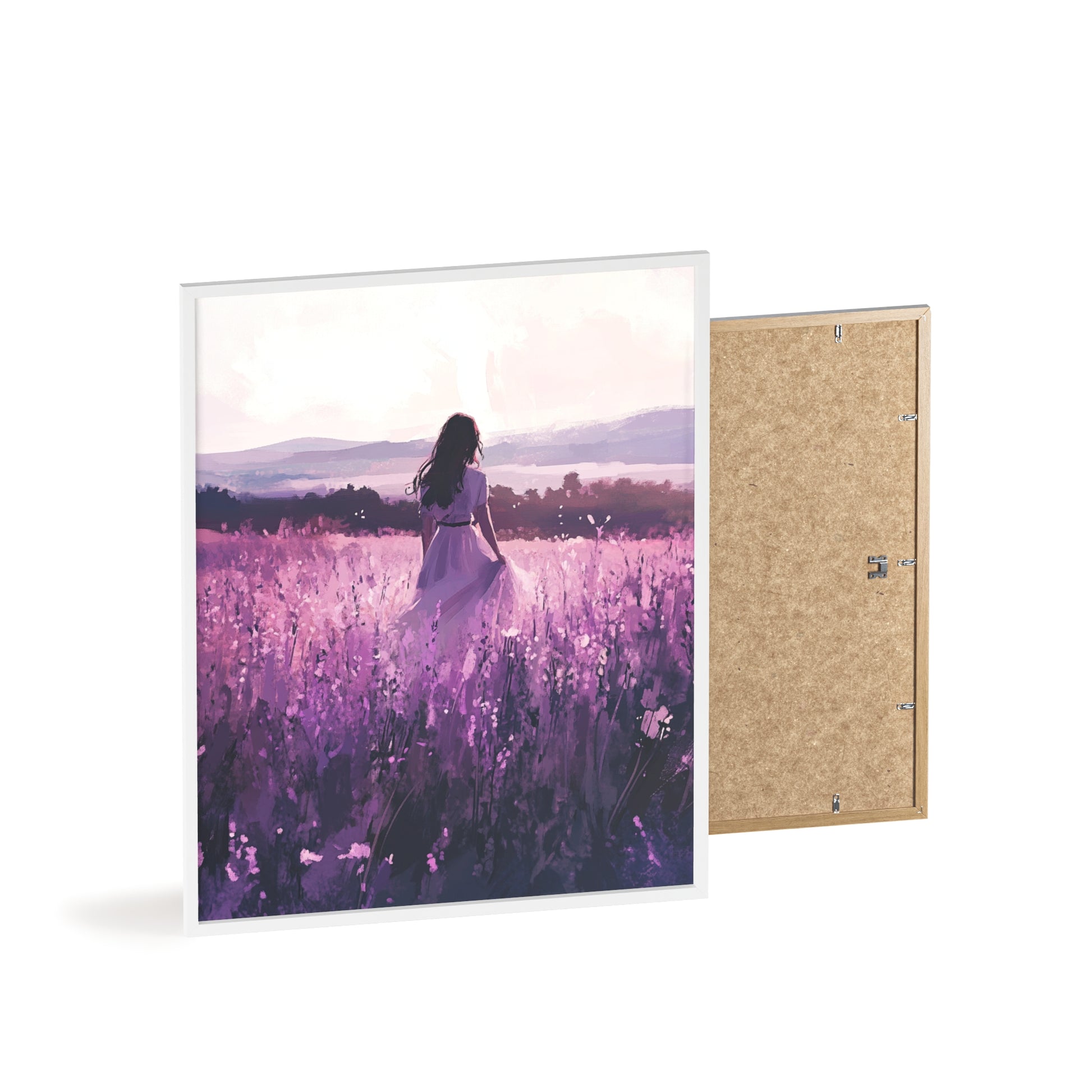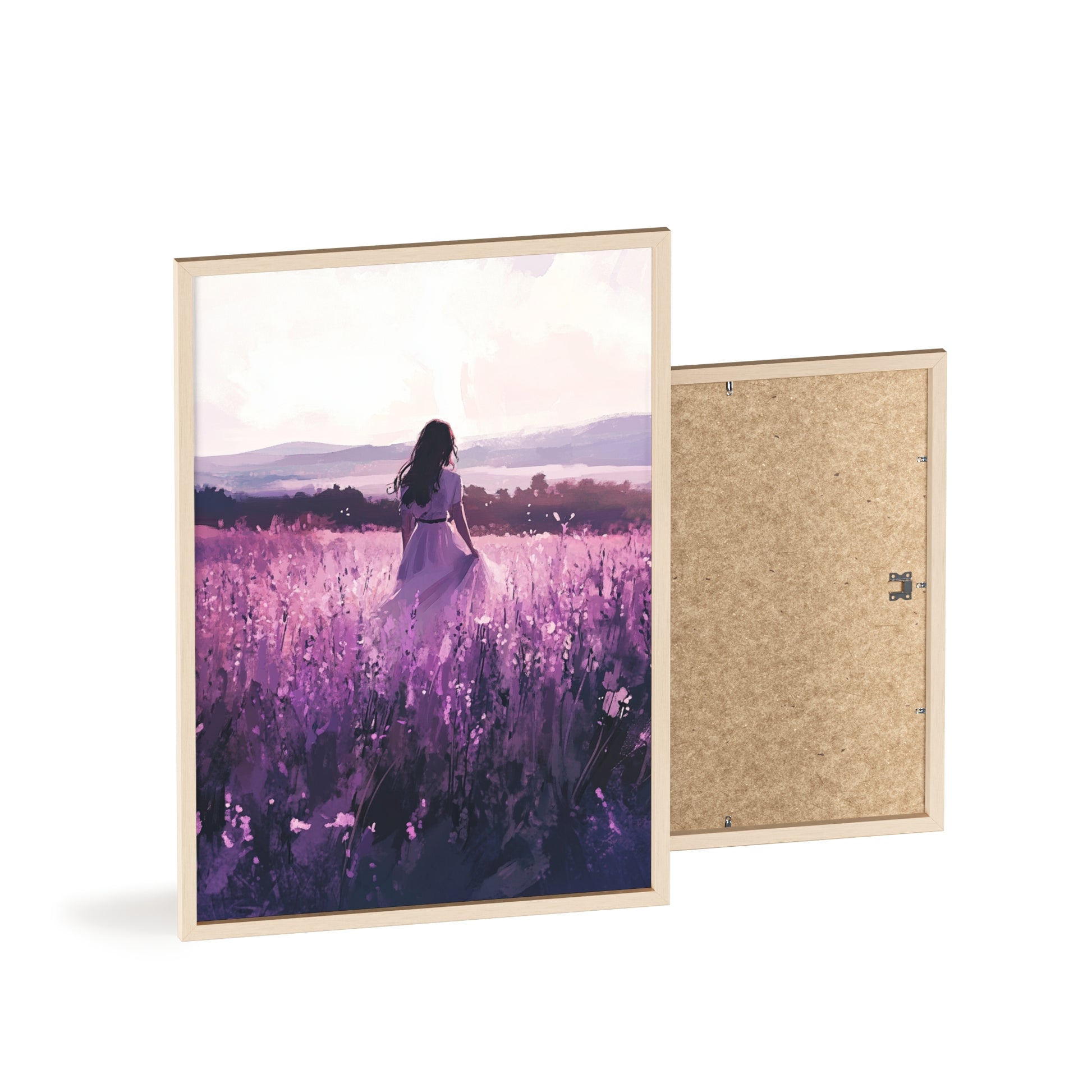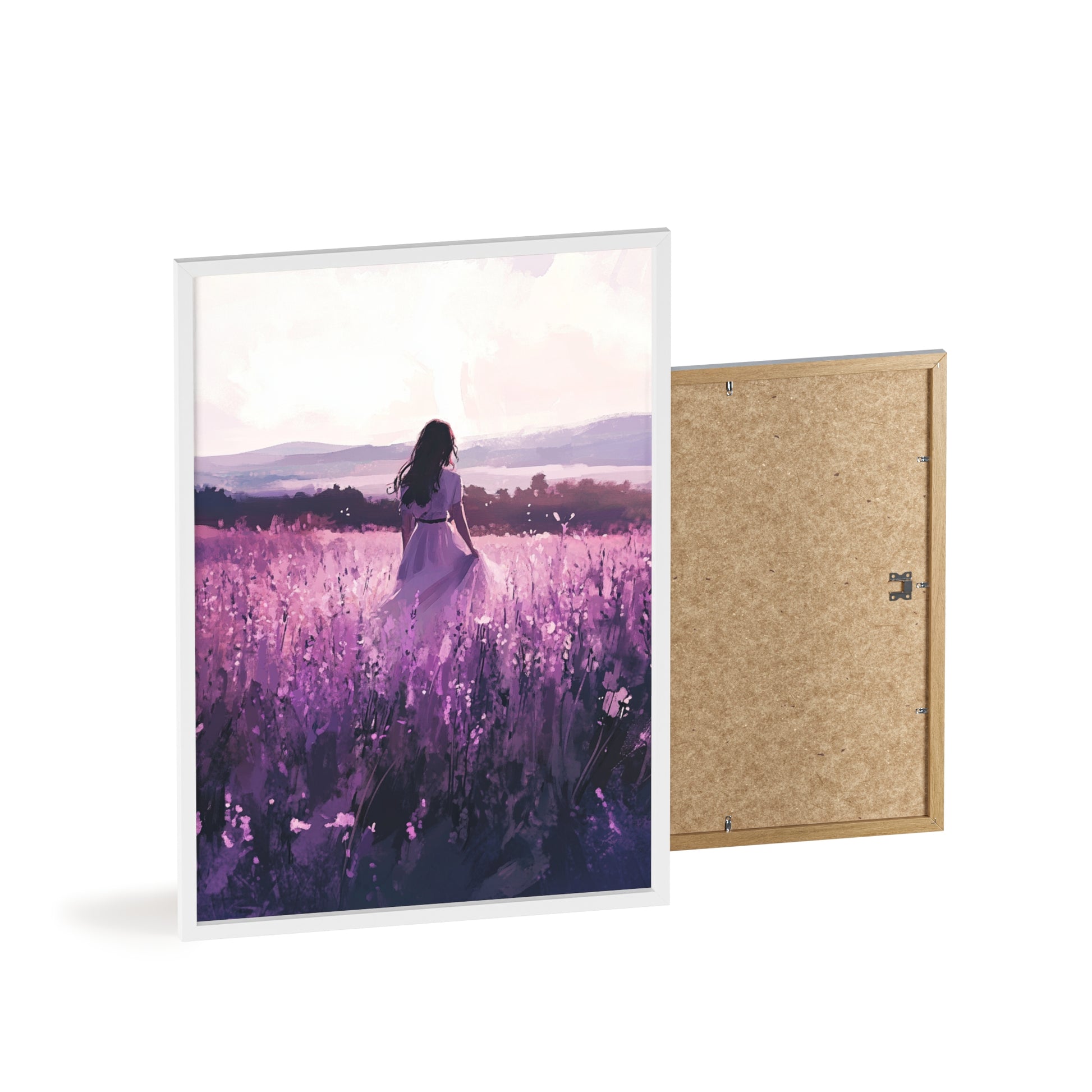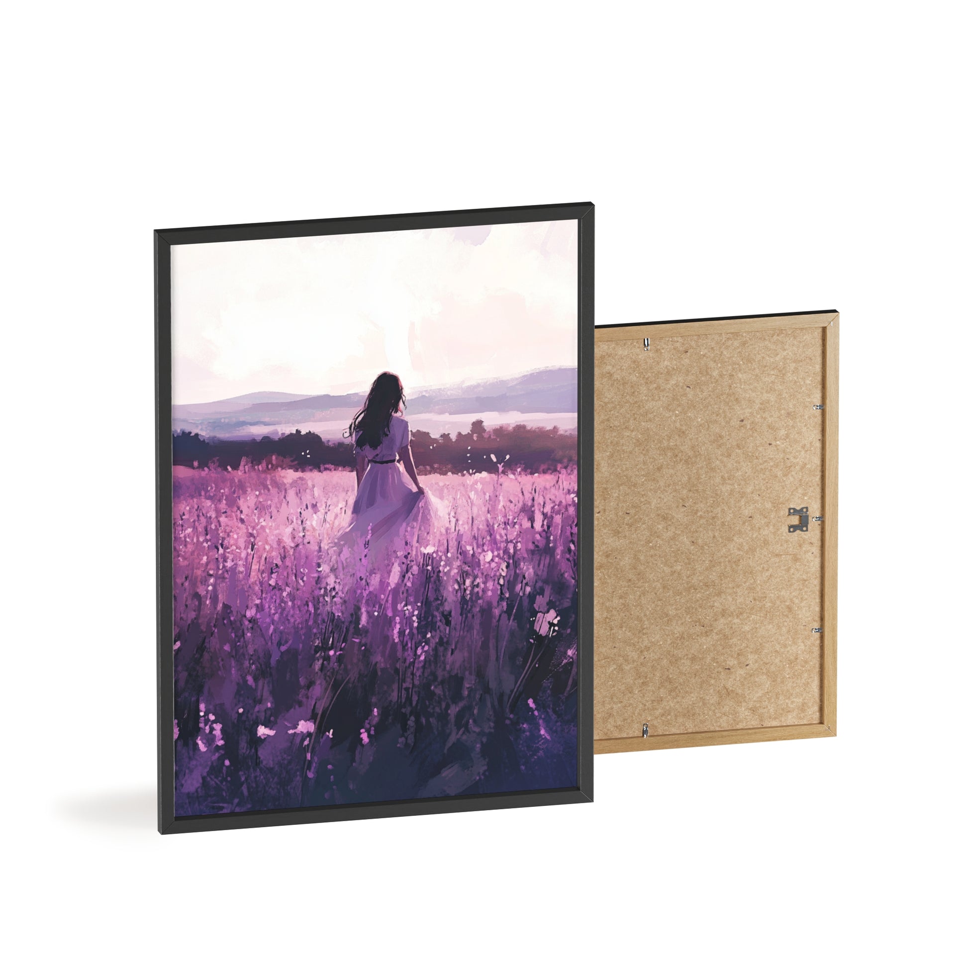 Dieses stimmungsvolle Poster fängt den Zauber eines stillen Augenblicks ein: Eine Frau steht inmitten eines endlosen Lavendelfelds, während das Licht der Abendsonne die Welt in zarte Violett- und Rosatöne taucht. Das Motiv vermittelt Ruhe, Freiheit und den Wunsch, einfach im Moment zu sein.