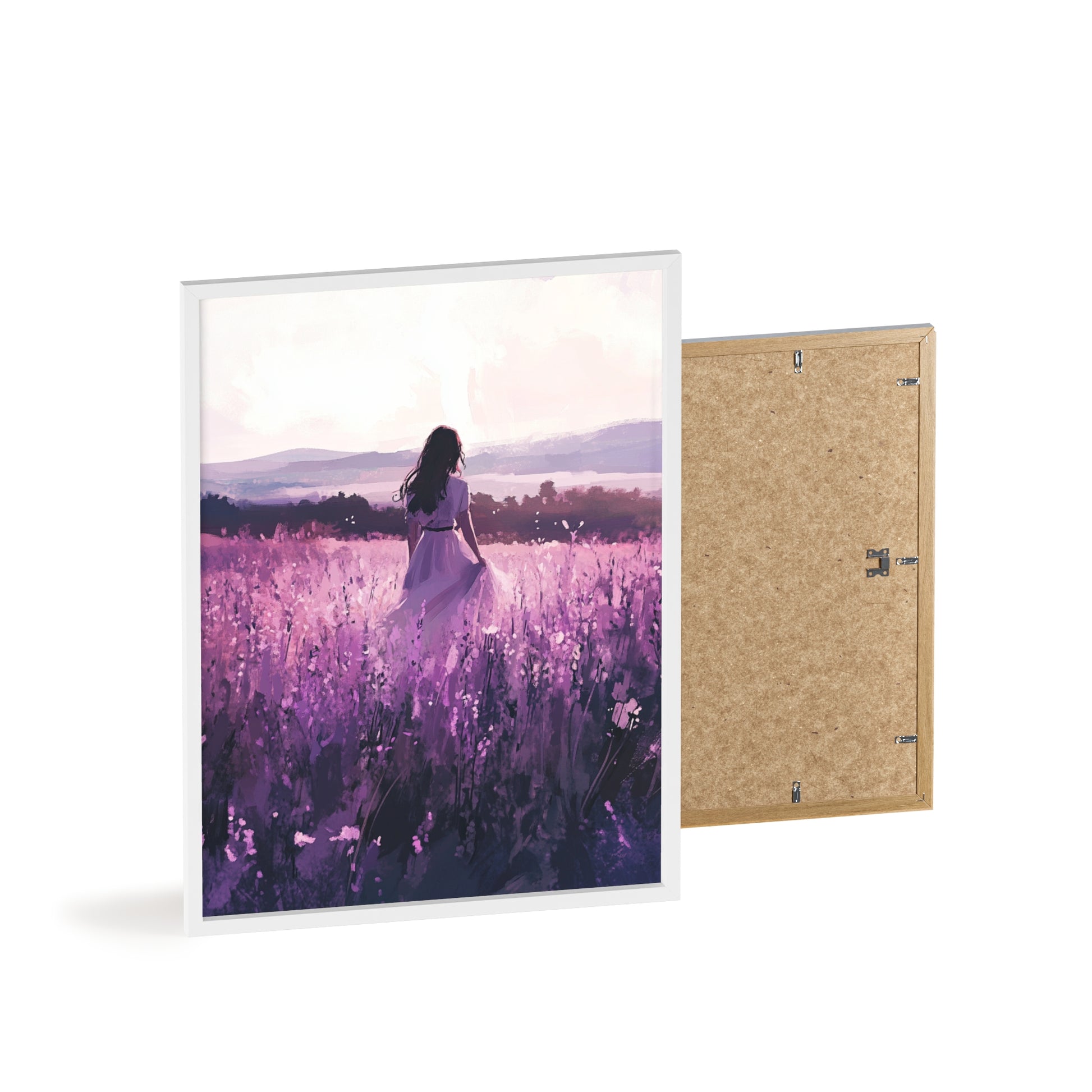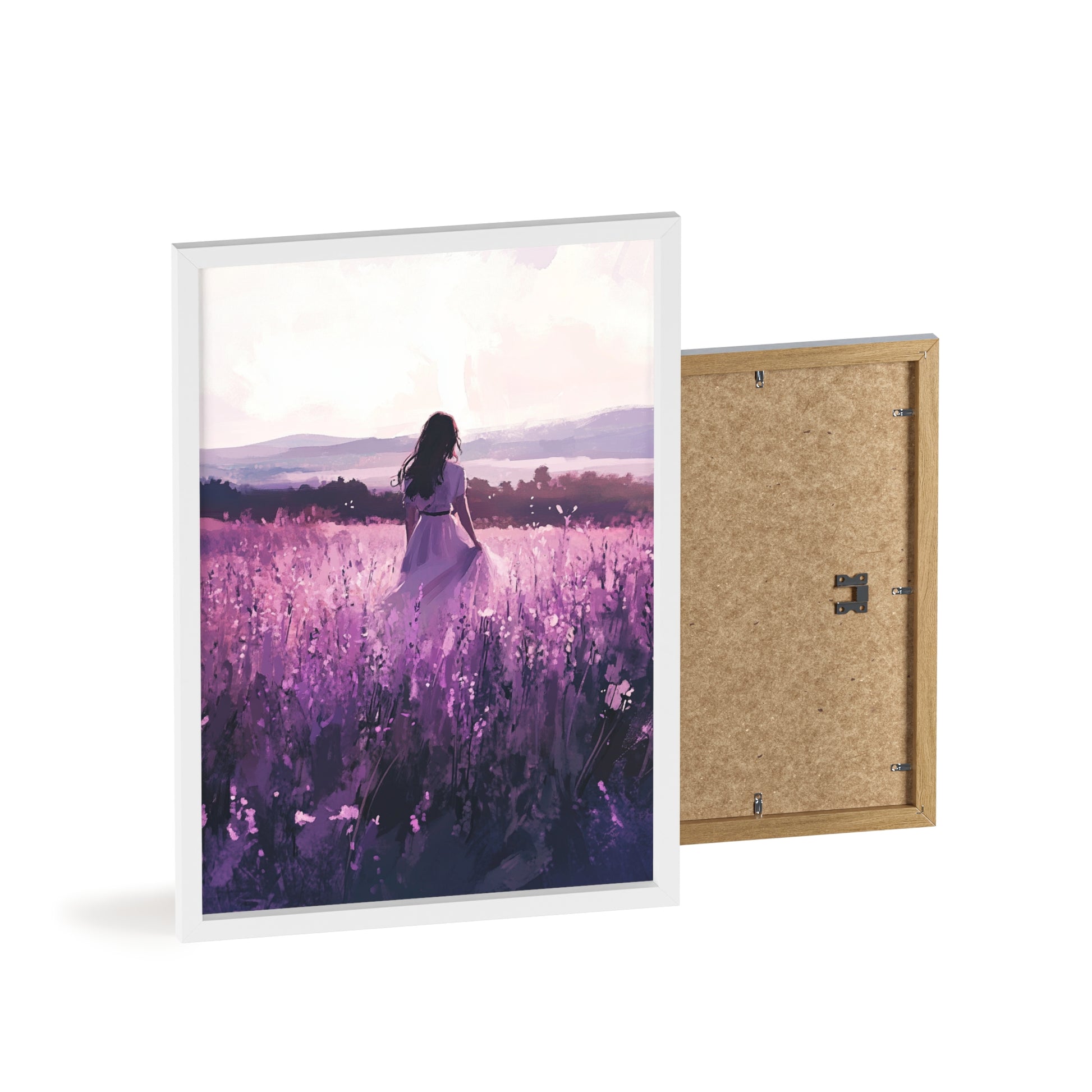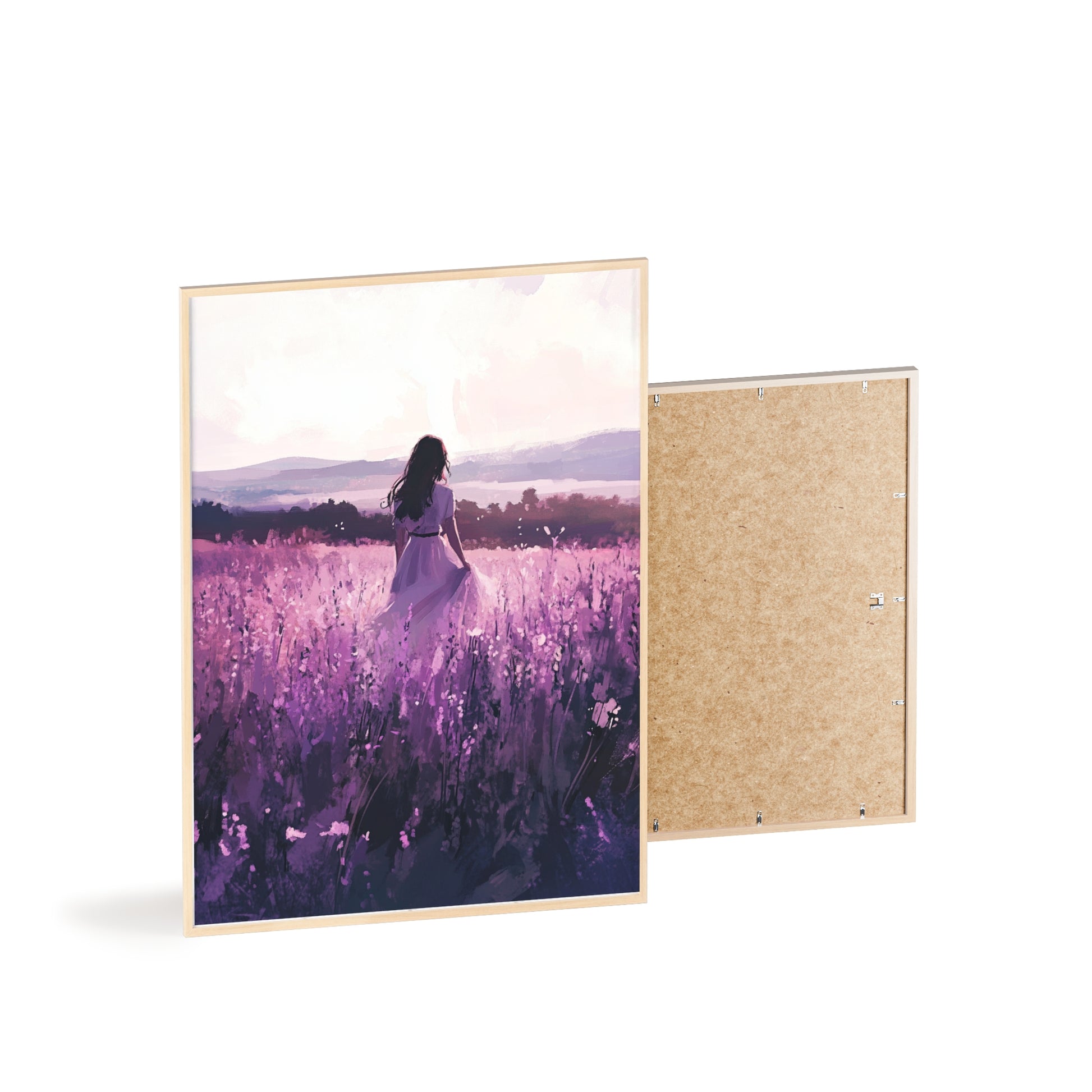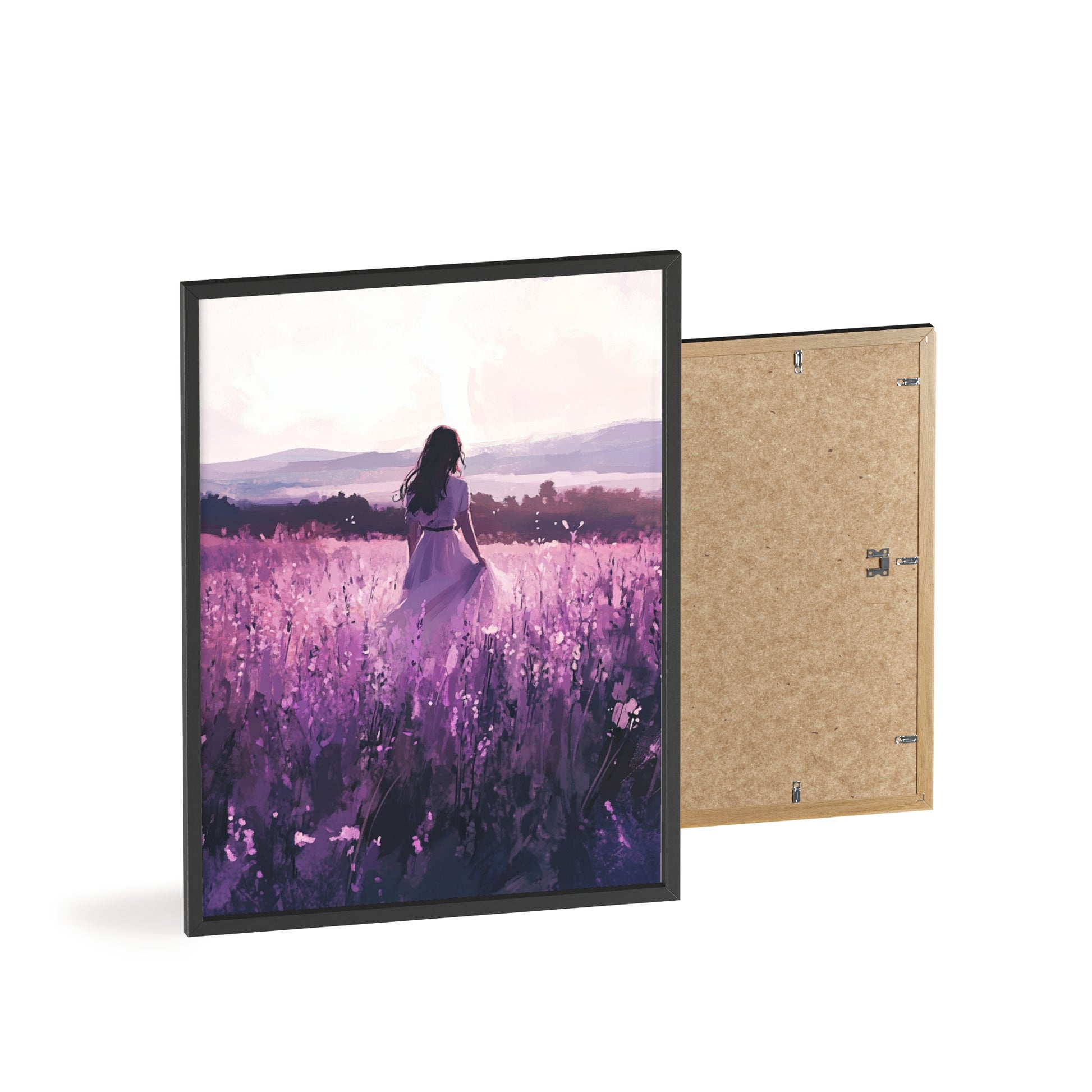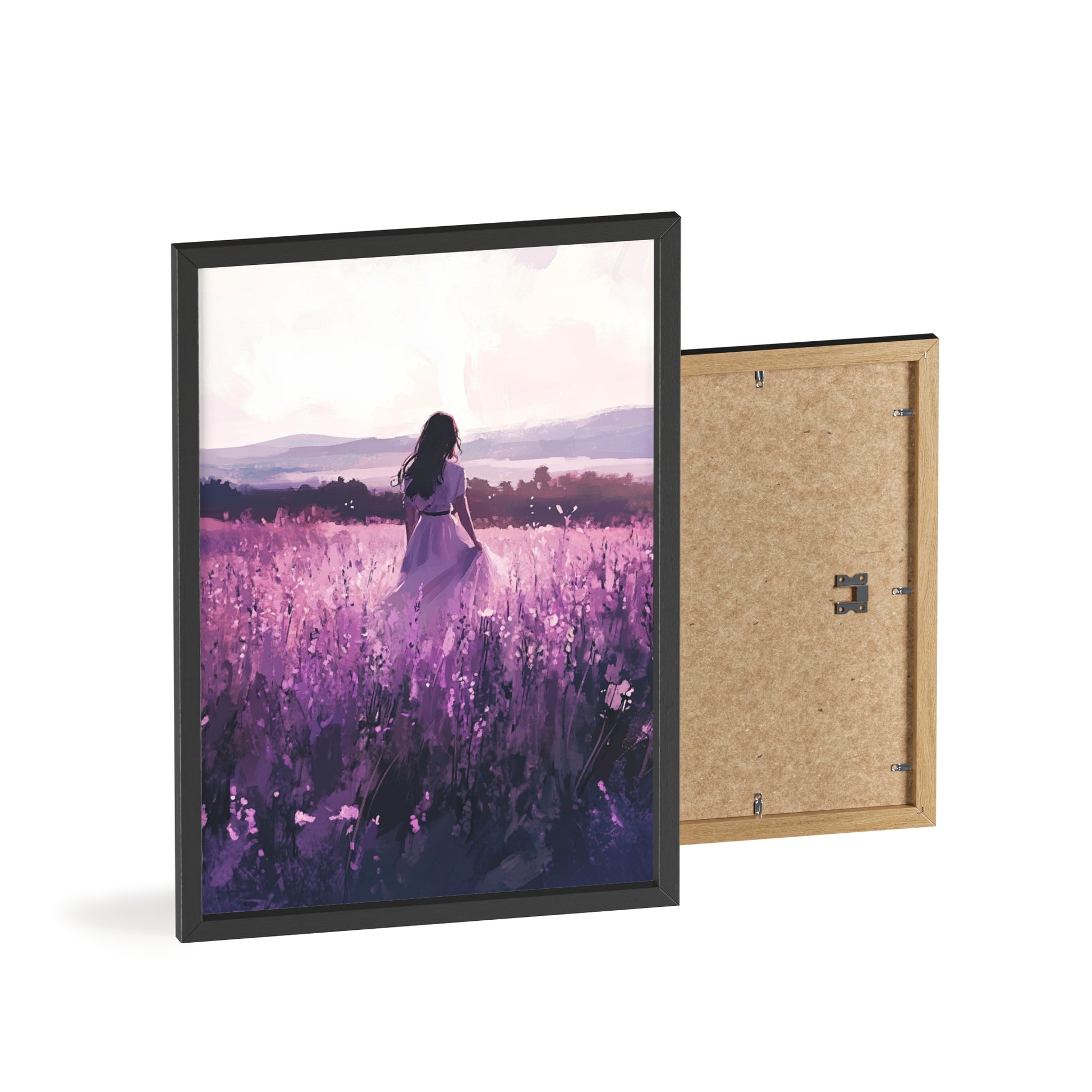 Dieses stimmungsvolle Poster fängt den Zauber eines stillen Augenblicks ein: Eine Frau steht inmitten eines endlosen Lavendelfelds, während das Licht der Abendsonne die Welt in zarte Violett- und Rosatöne taucht. Das Motiv vermittelt Ruhe, Freiheit und den Wunsch, einfach im Moment zu sein.