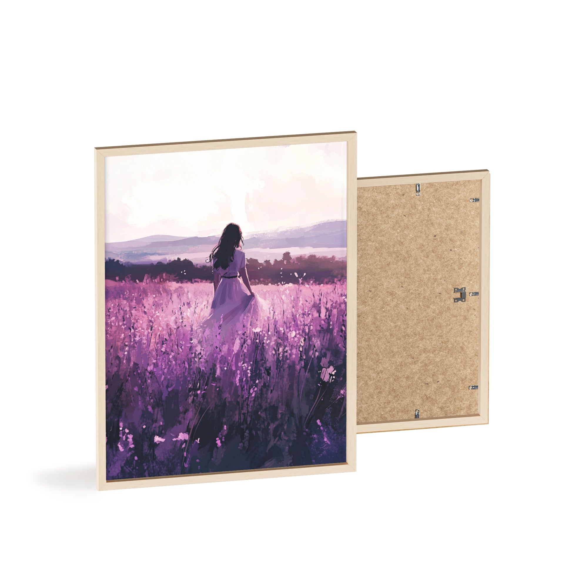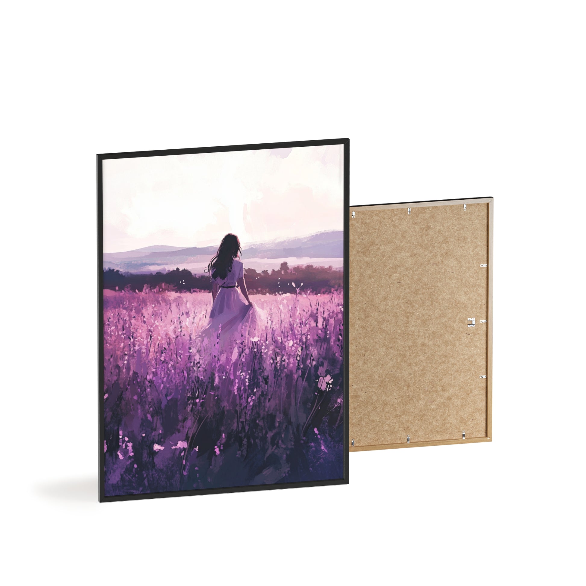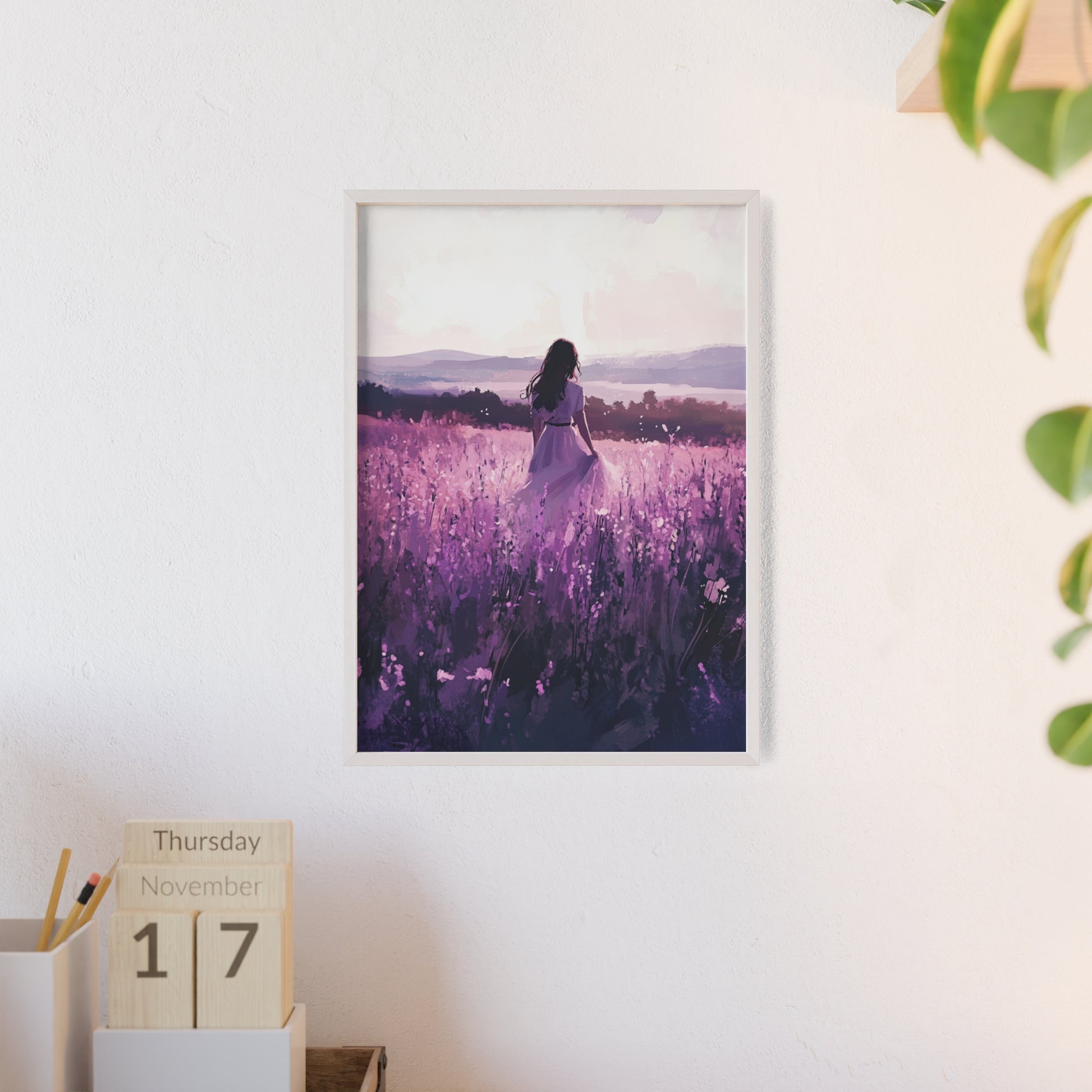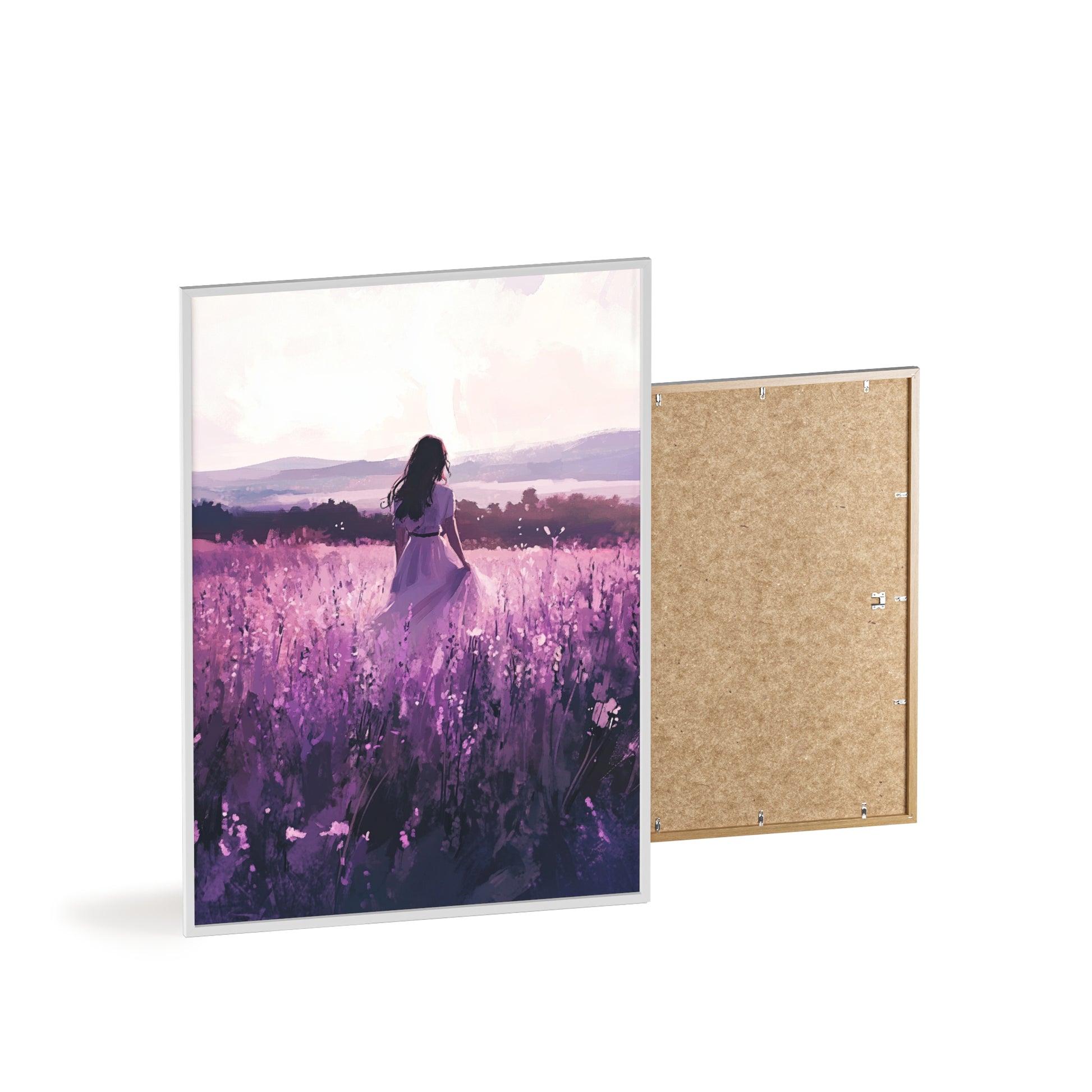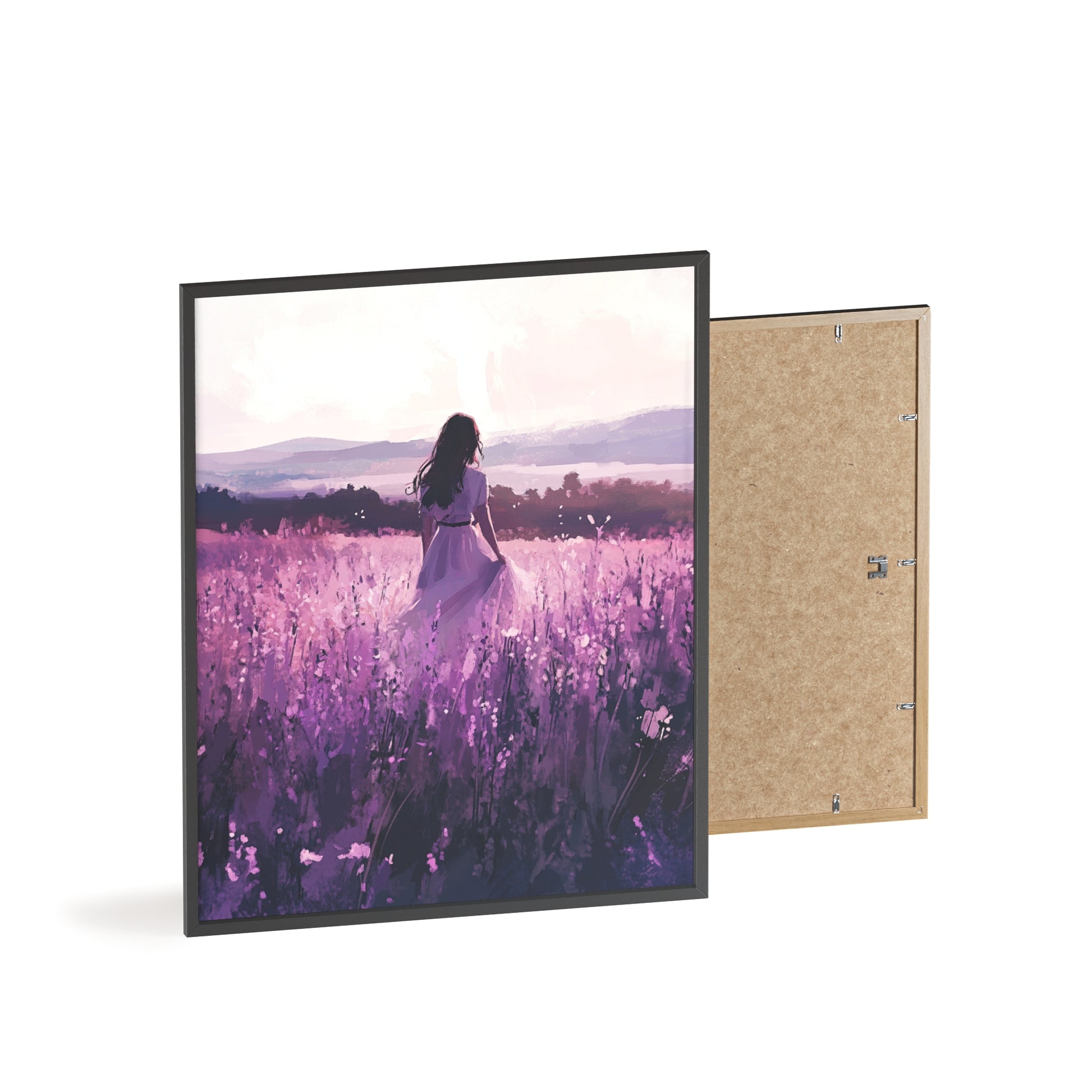 Dieses stimmungsvolle Poster fängt den Zauber eines stillen Augenblicks ein: Eine Frau steht inmitten eines endlosen Lavendelfelds, während das Licht der Abendsonne die Welt in zarte Violett- und Rosatöne taucht. Das Motiv vermittelt Ruhe, Freiheit und den Wunsch, einfach im Moment zu sein.