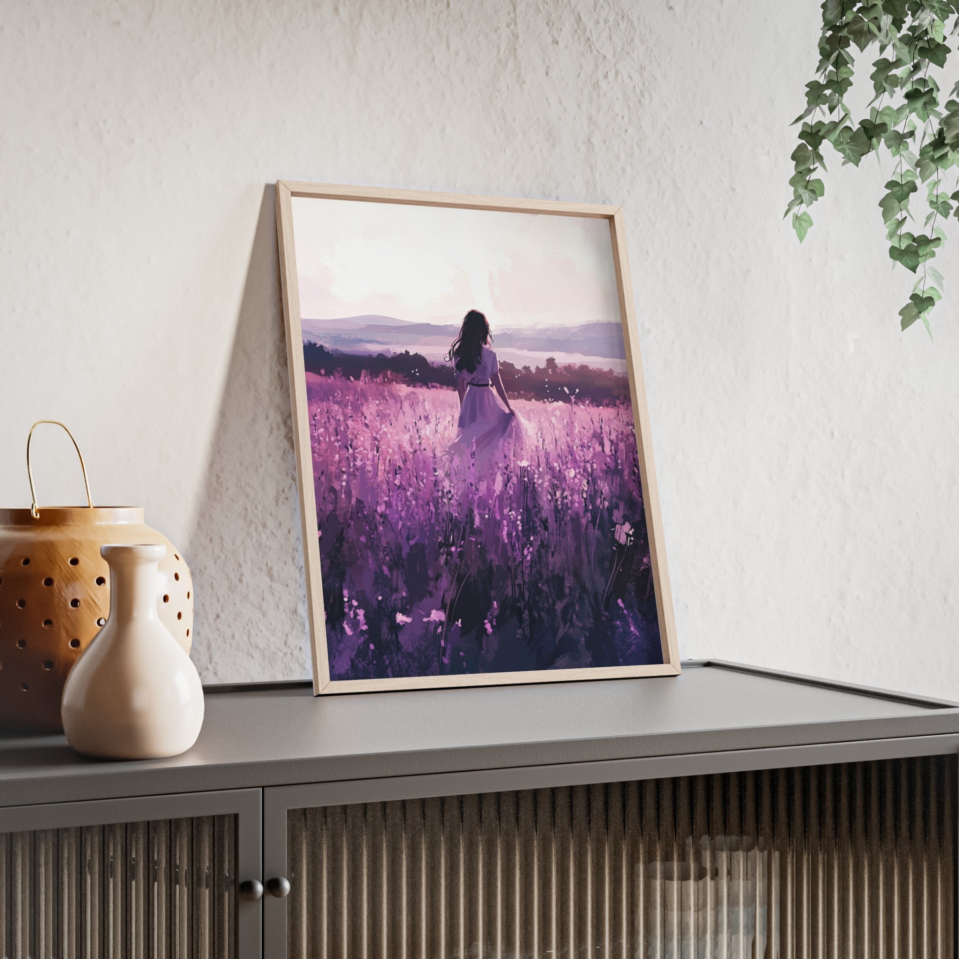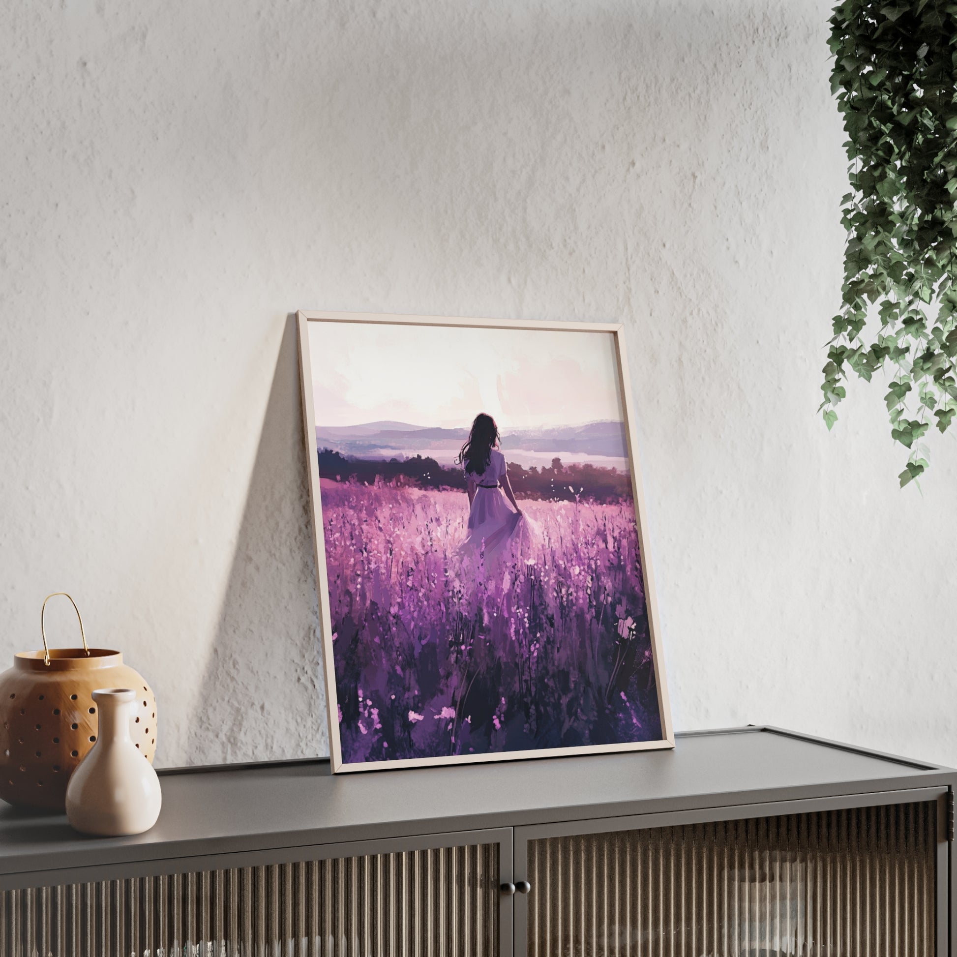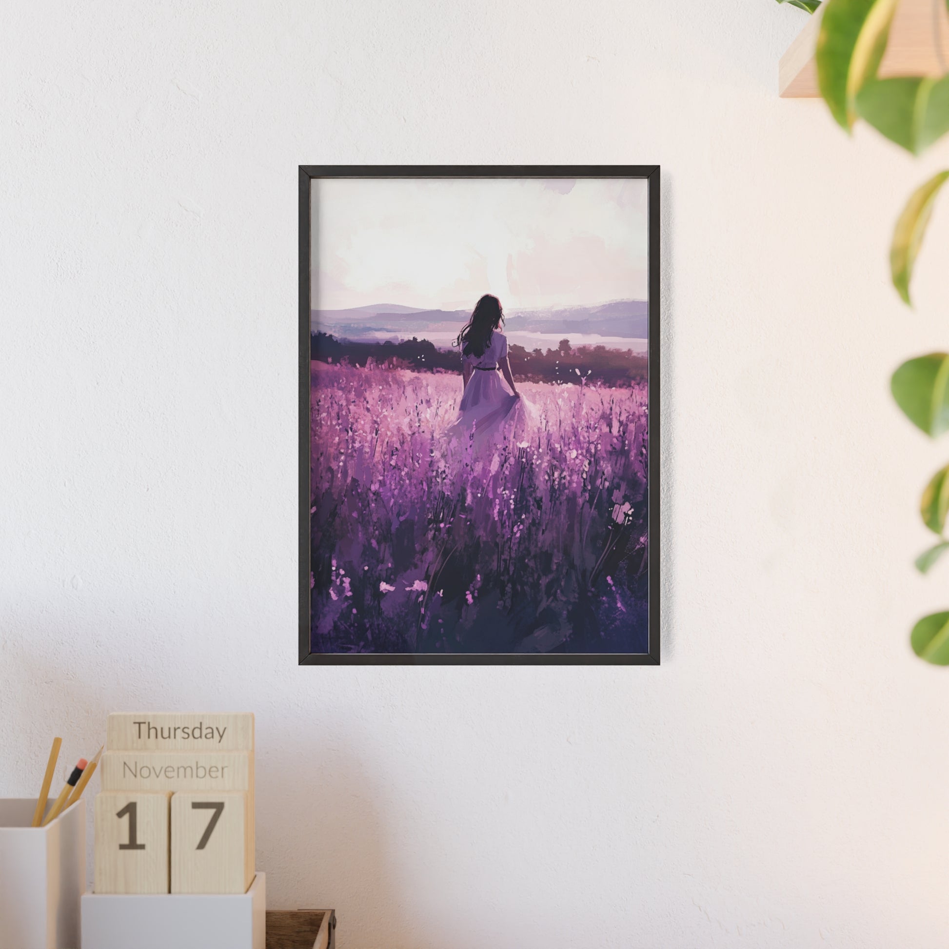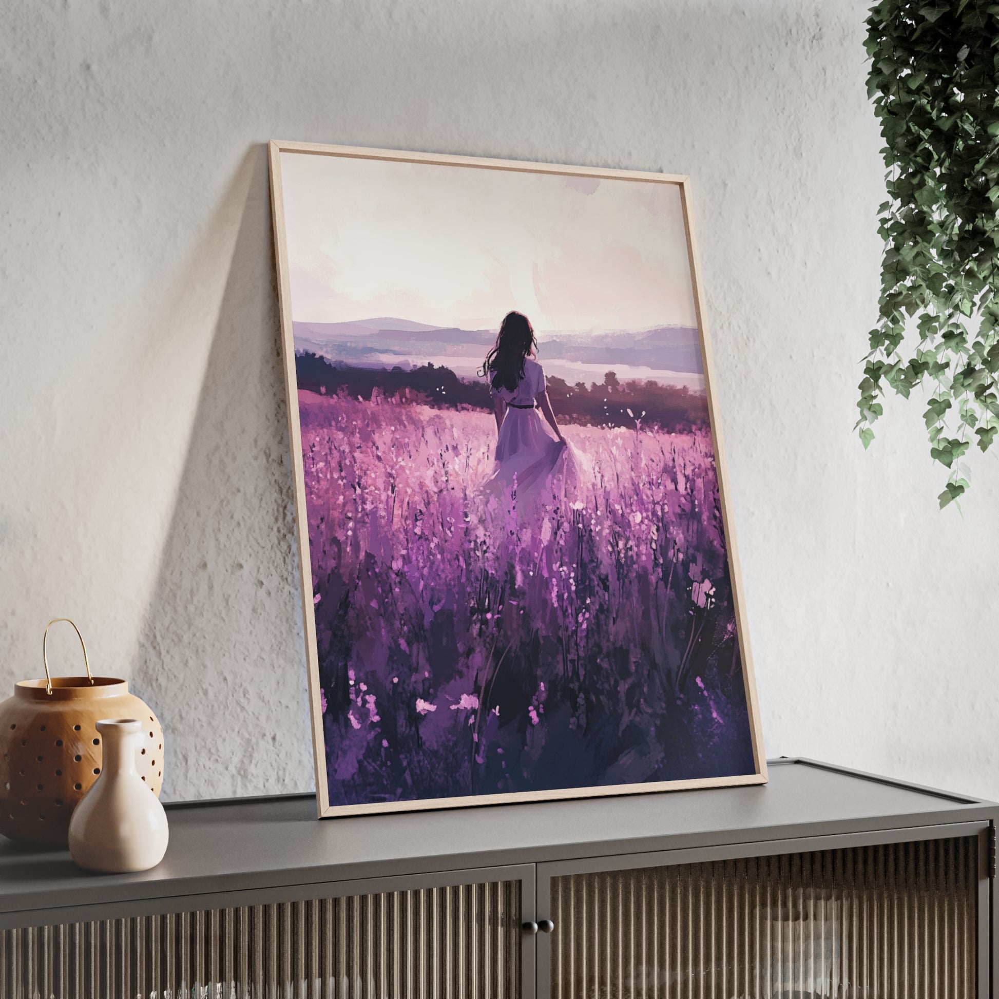 Dieses stimmungsvolle Poster fängt den Zauber eines stillen Augenblicks ein: Eine Frau steht inmitten eines endlosen Lavendelfelds, während das Licht der Abendsonne die Welt in zarte Violett- und Rosatöne taucht. Das Motiv vermittelt Ruhe, Freiheit und den Wunsch, einfach im Moment zu sein.