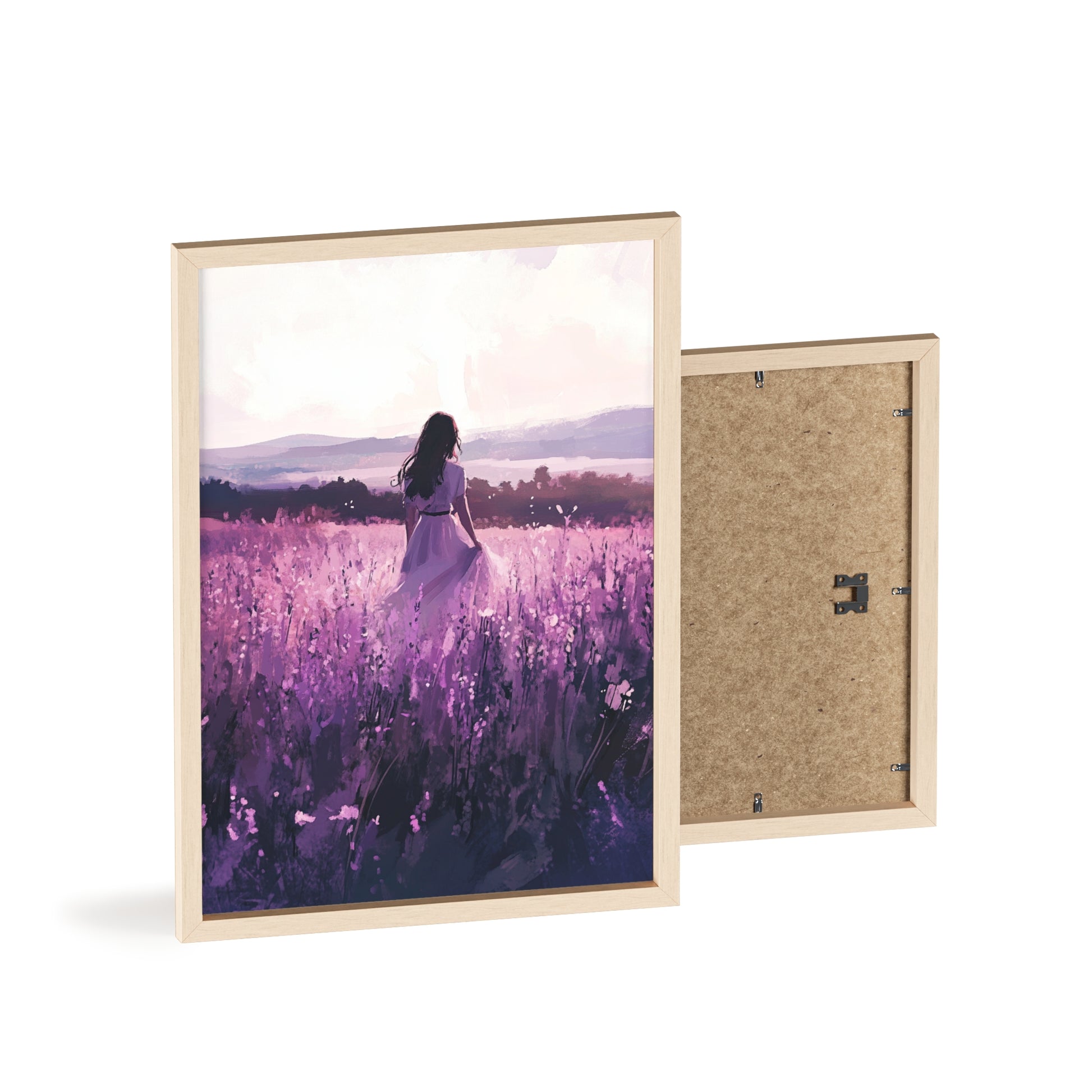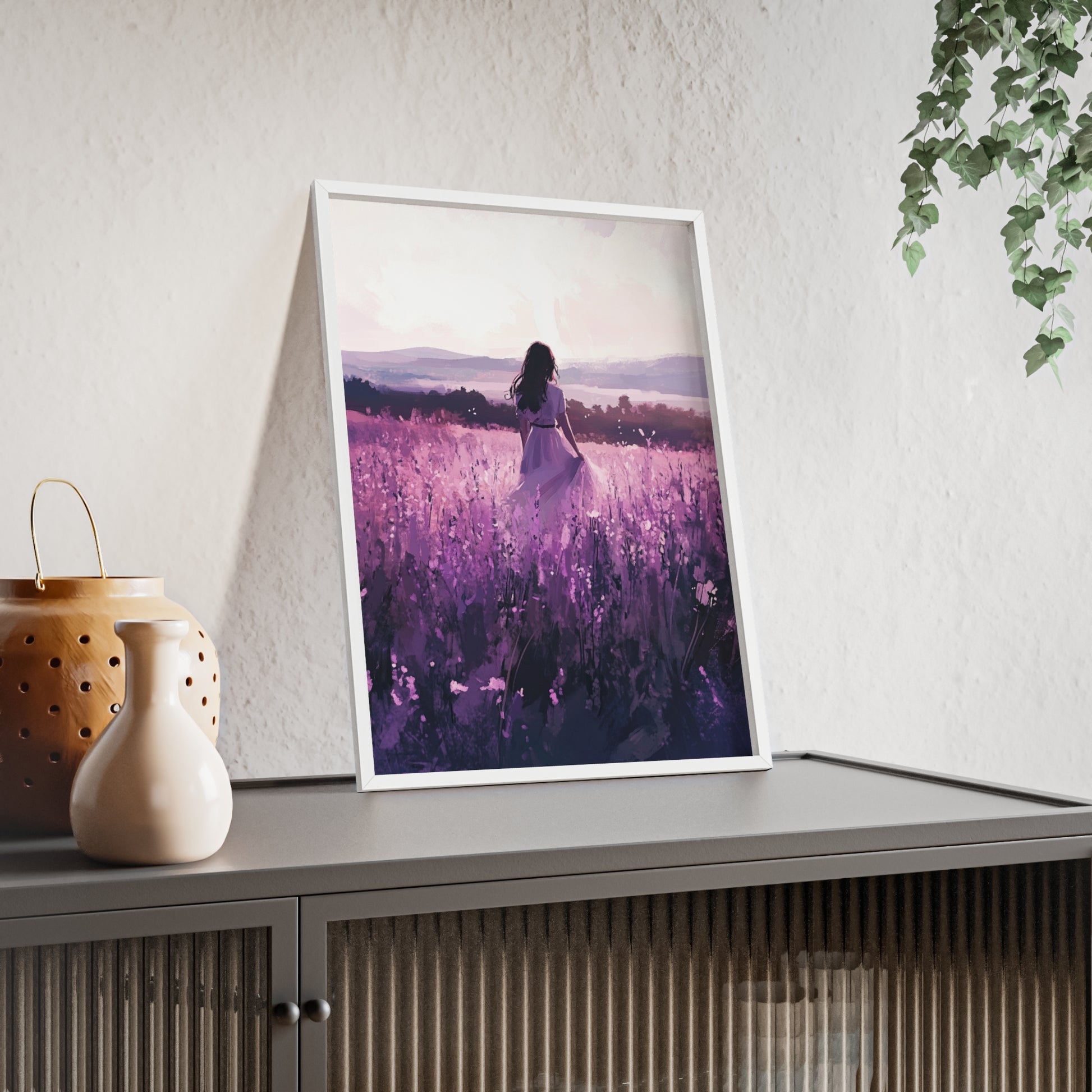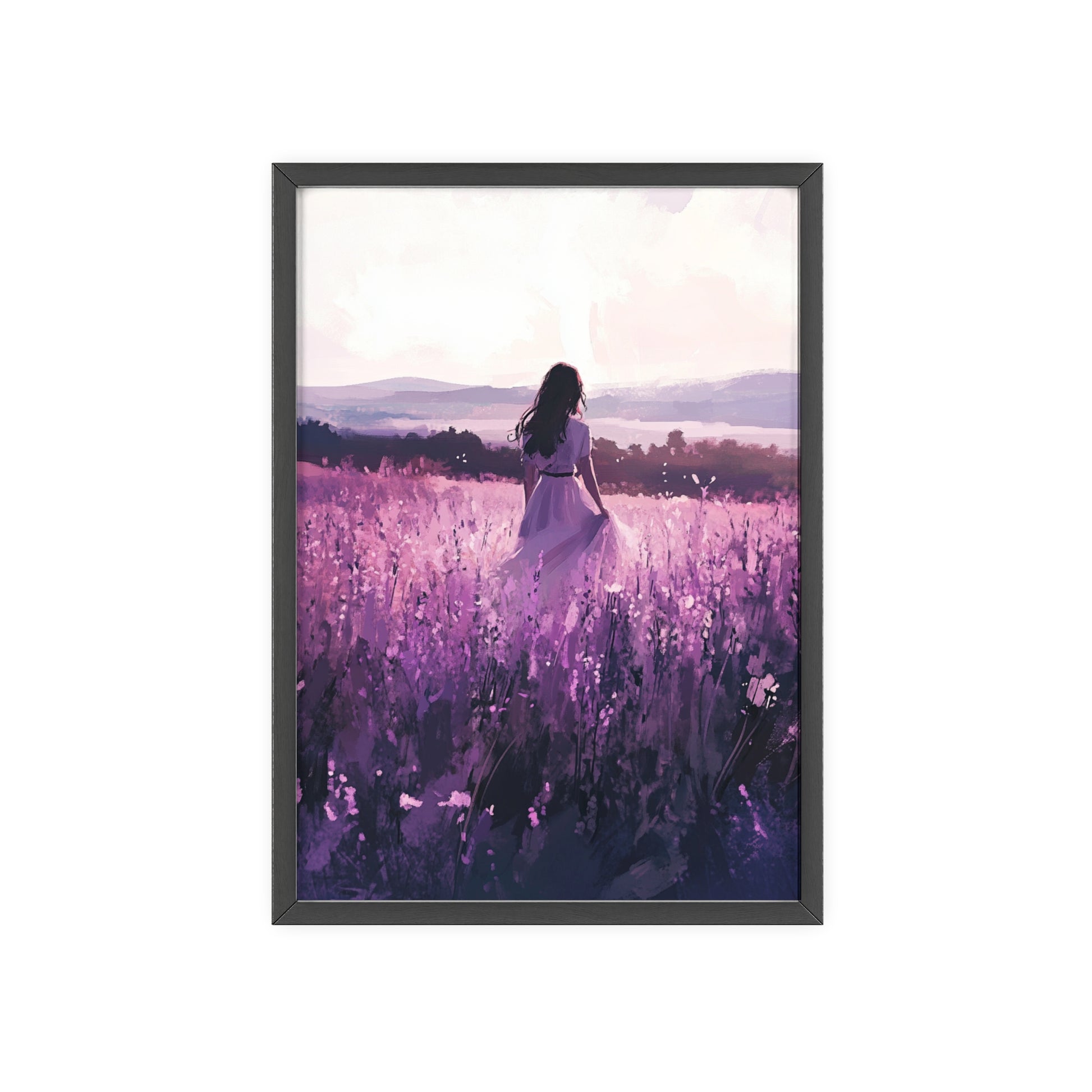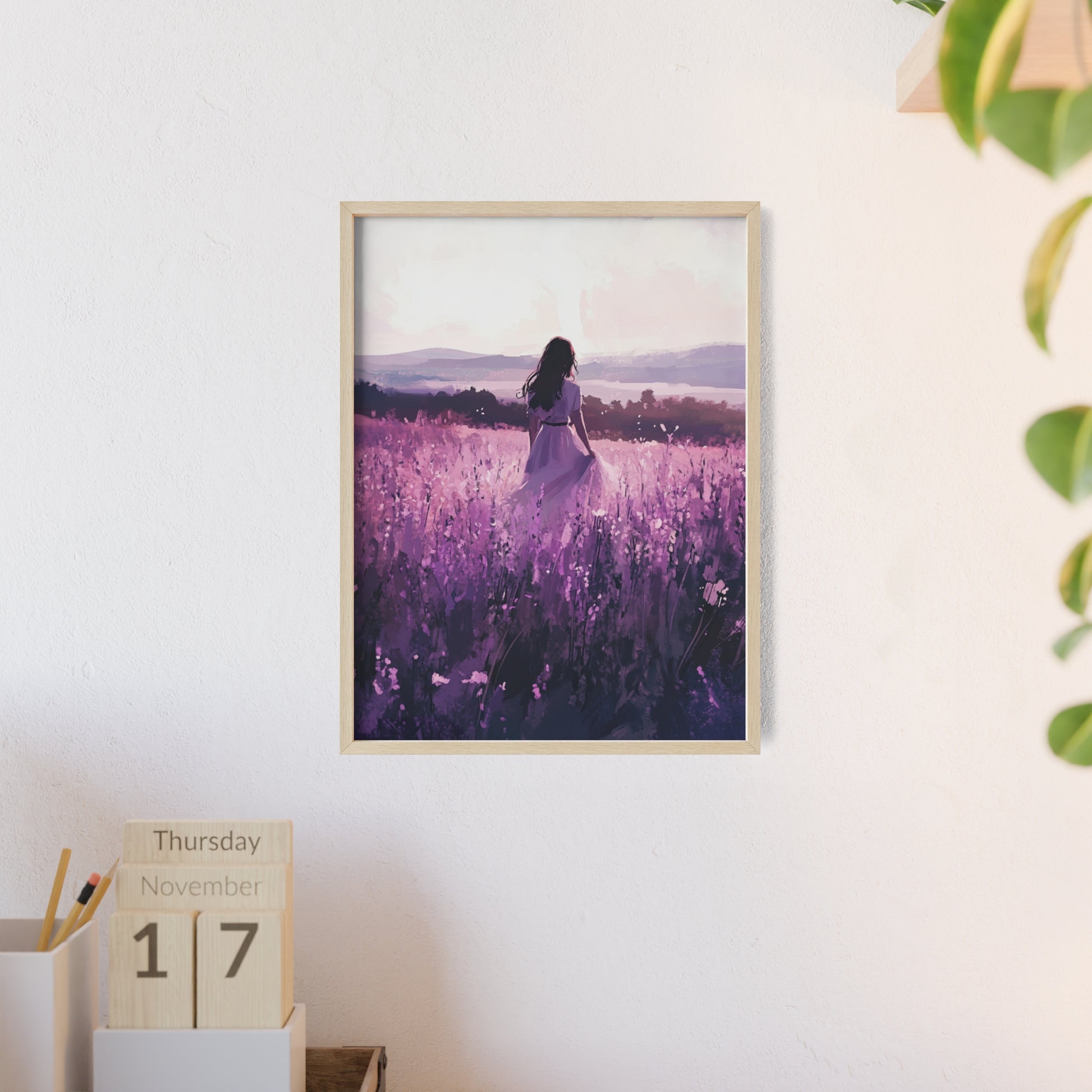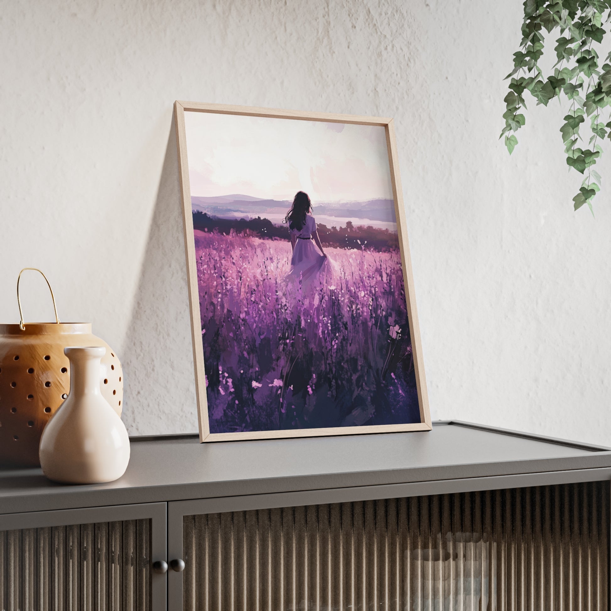 Dieses stimmungsvolle Poster fängt den Zauber eines stillen Augenblicks ein: Eine Frau steht inmitten eines endlosen Lavendelfelds, während das Licht der Abendsonne die Welt in zarte Violett- und Rosatöne taucht. Das Motiv vermittelt Ruhe, Freiheit und den Wunsch, einfach im Moment zu sein.