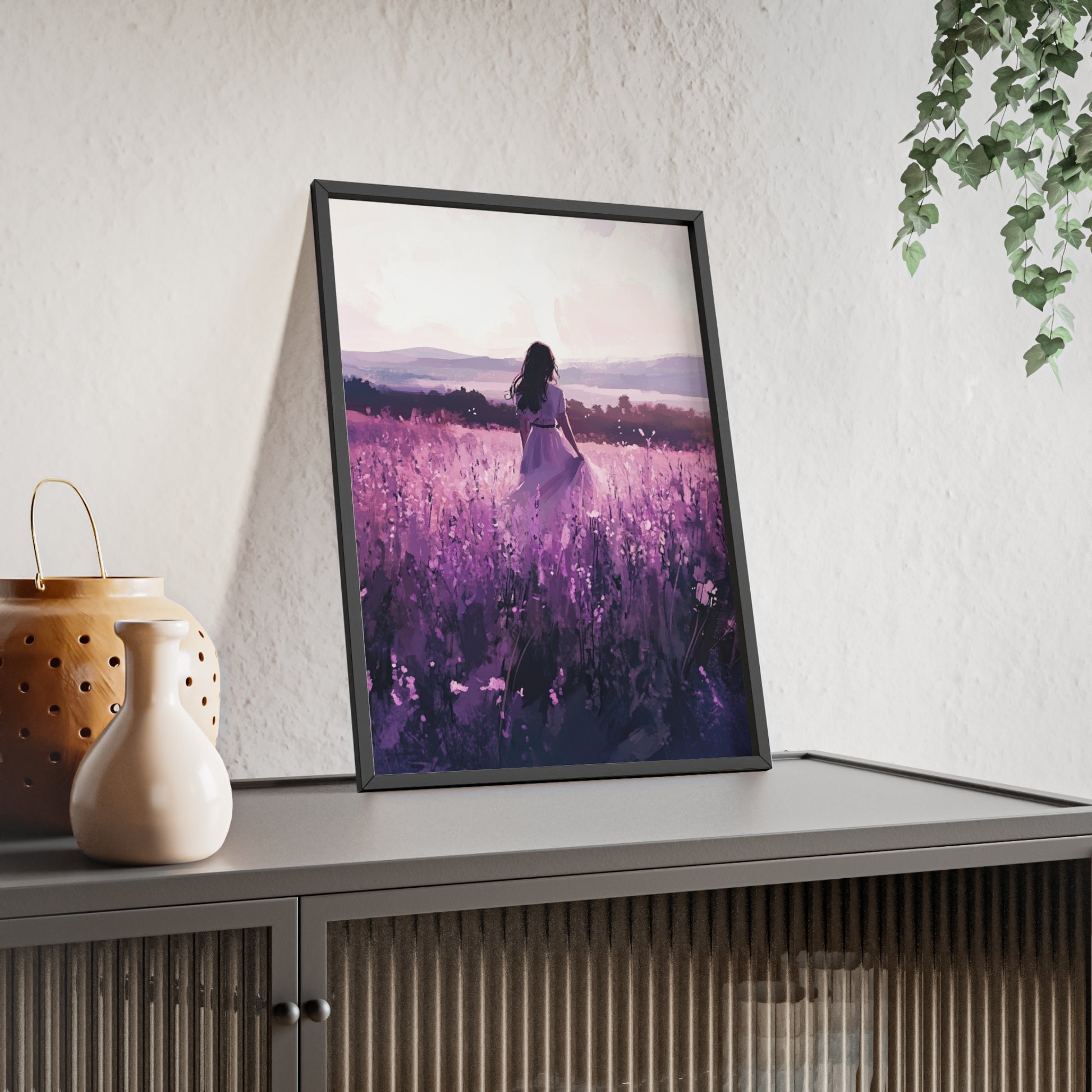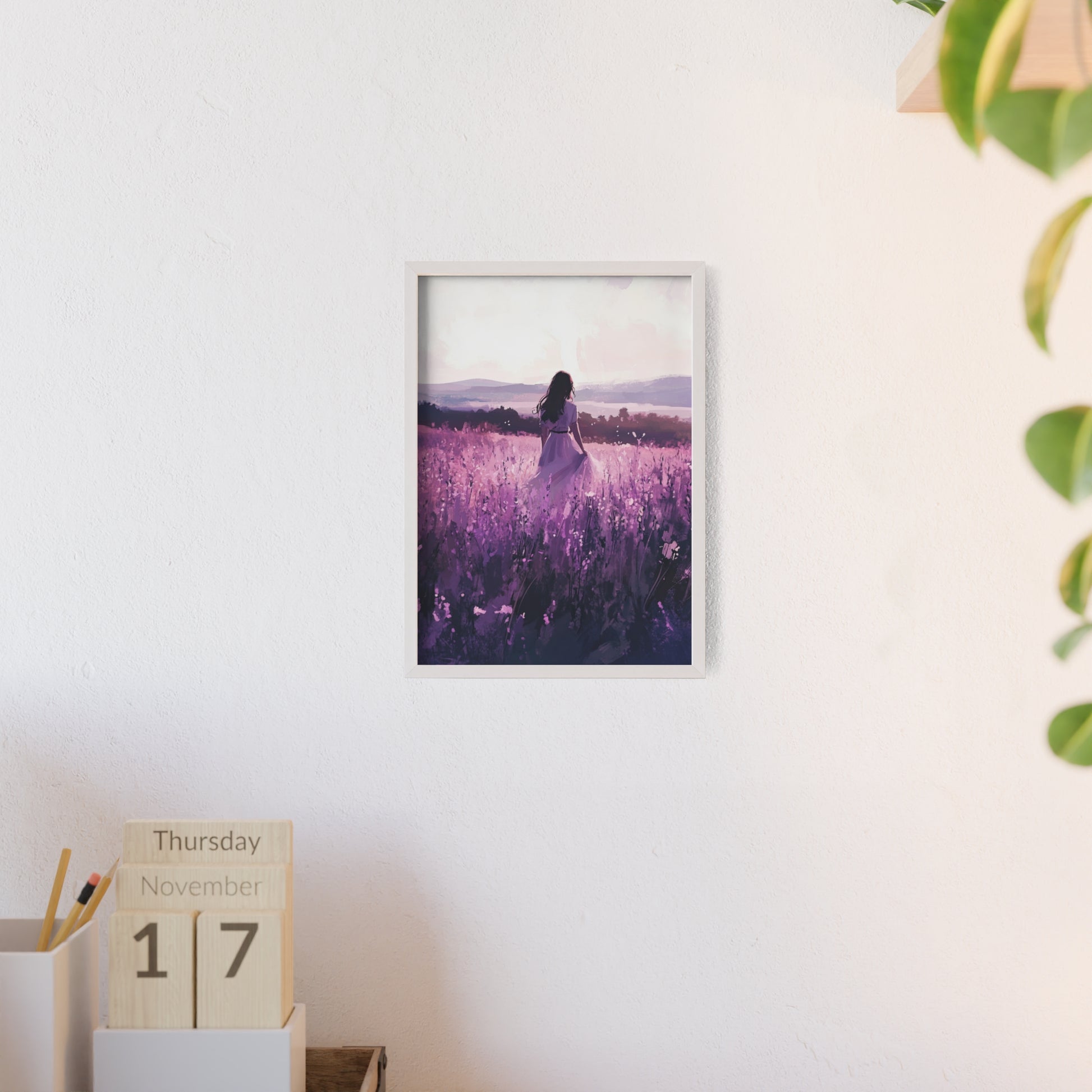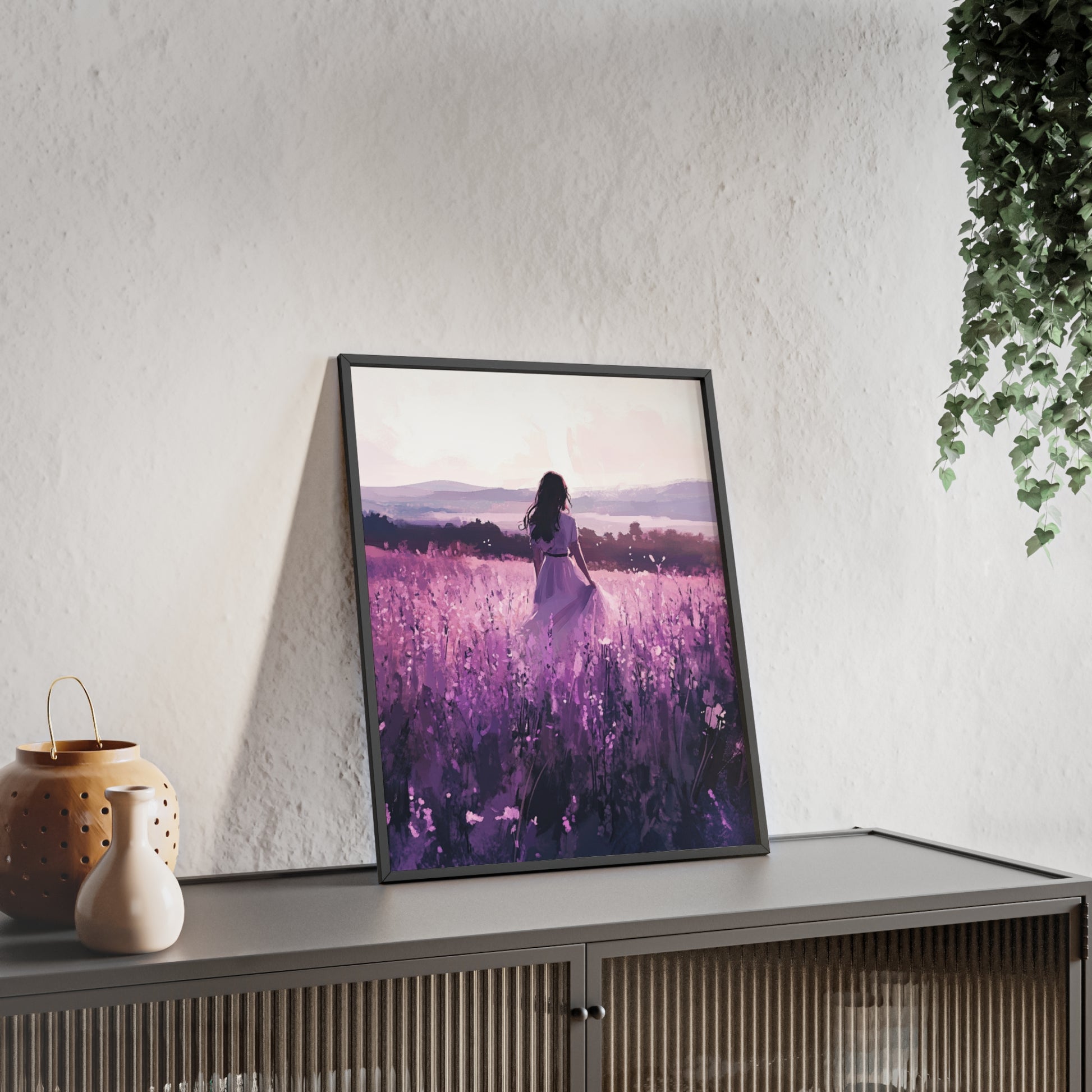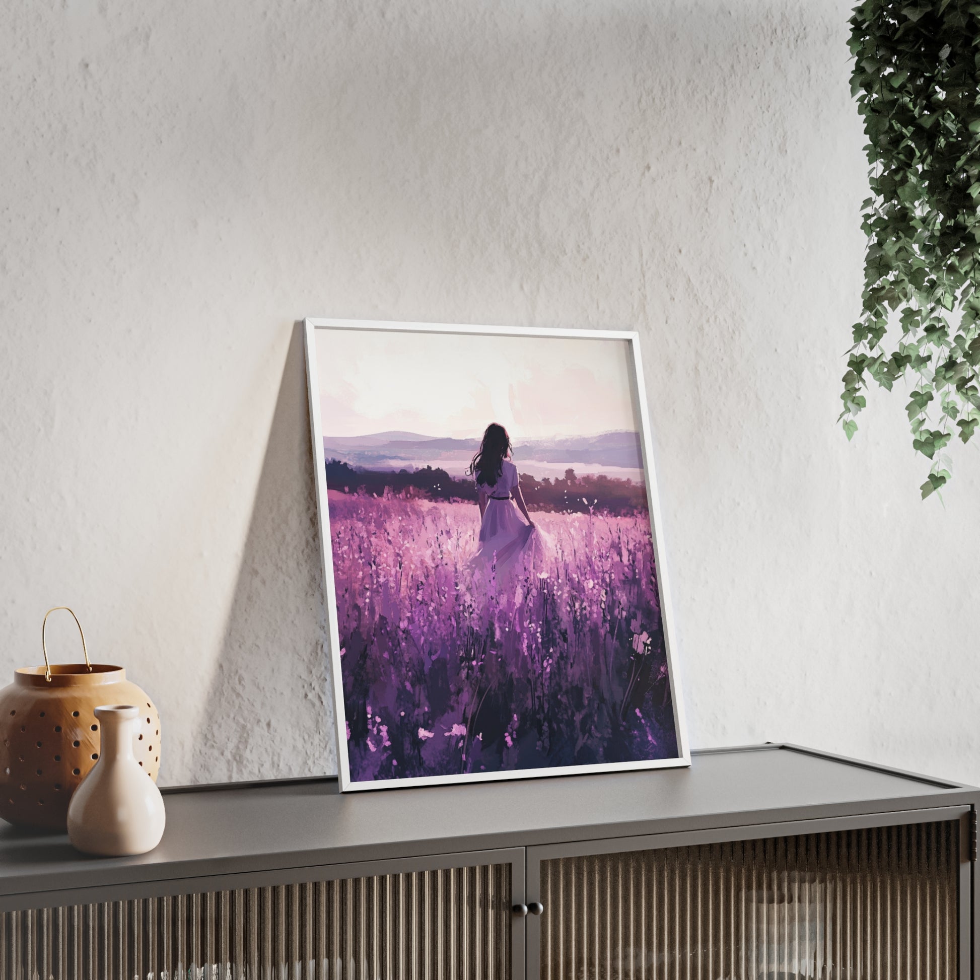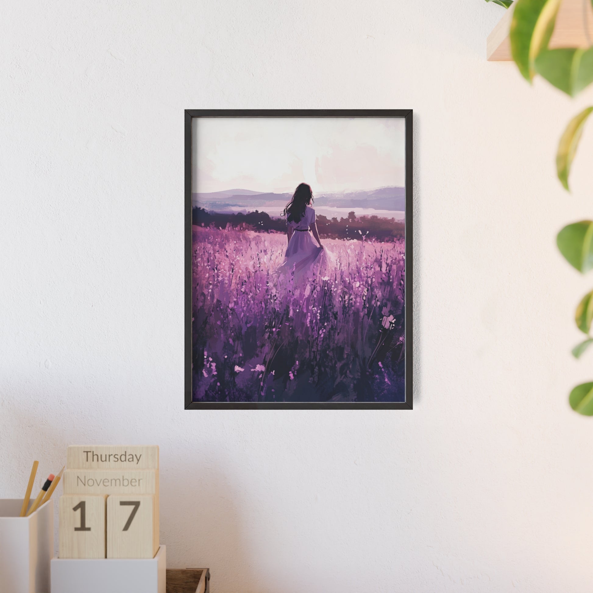 Dieses stimmungsvolle Poster fängt den Zauber eines stillen Augenblicks ein: Eine Frau steht inmitten eines endlosen Lavendelfelds, während das Licht der Abendsonne die Welt in zarte Violett- und Rosatöne taucht. Das Motiv vermittelt Ruhe, Freiheit und den Wunsch, einfach im Moment zu sein.