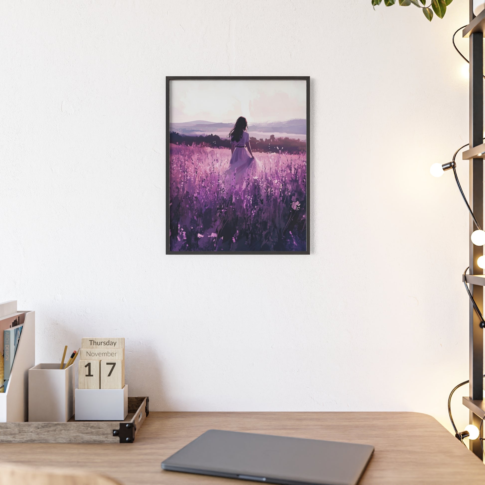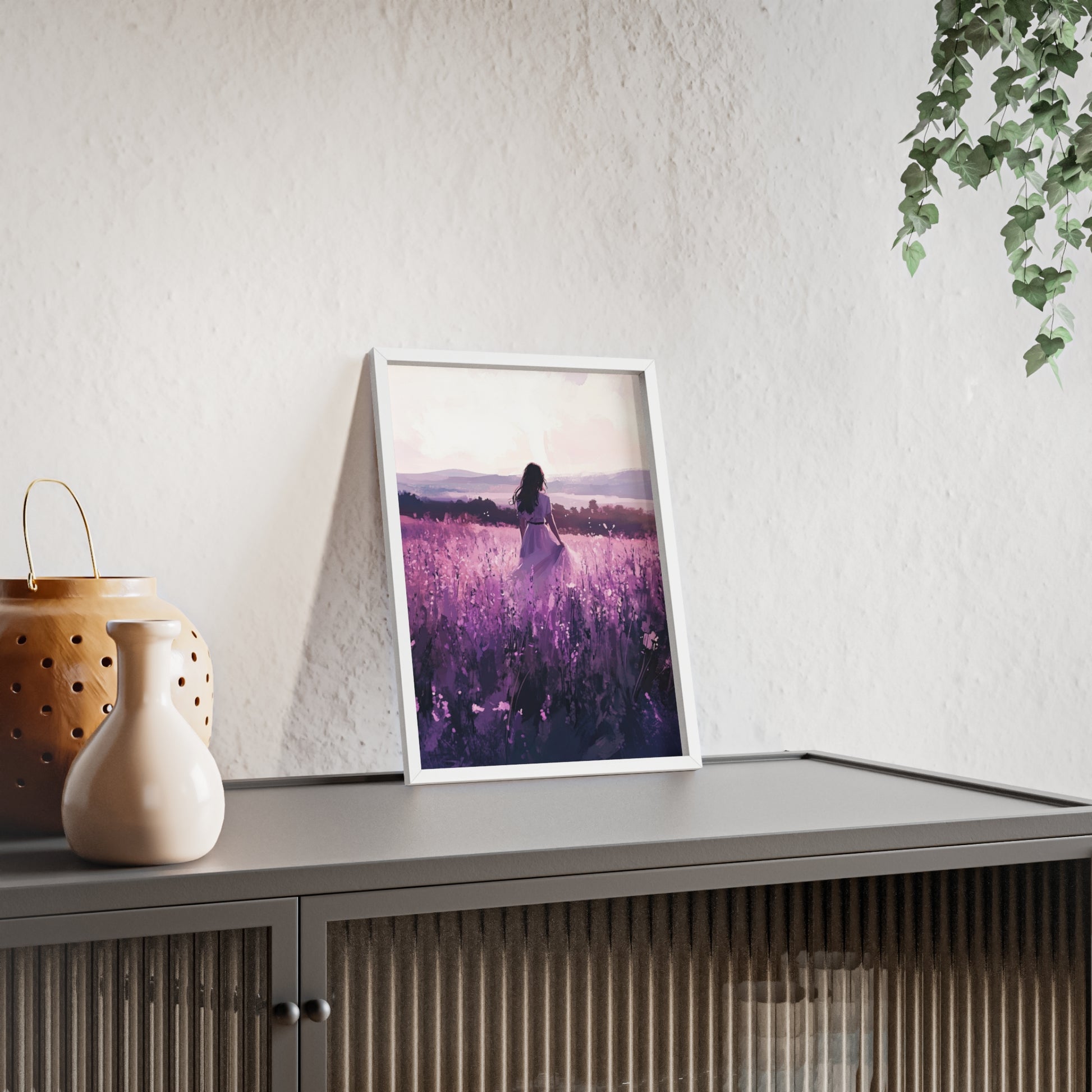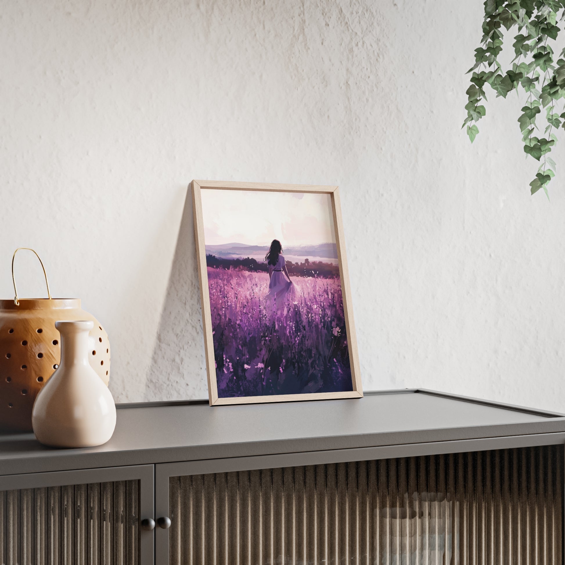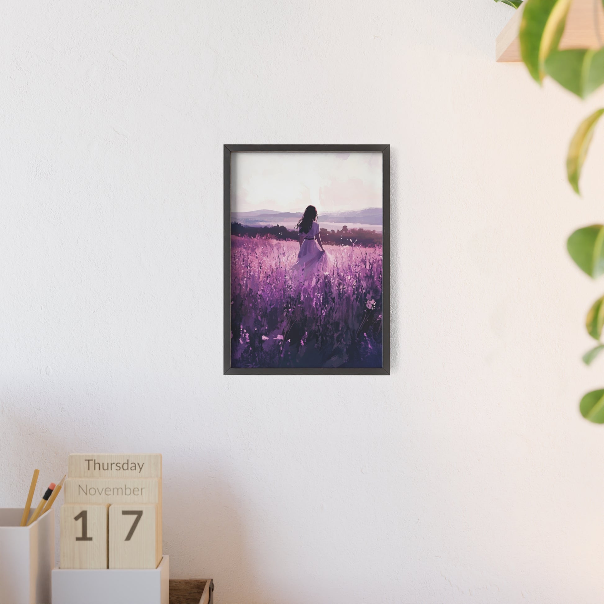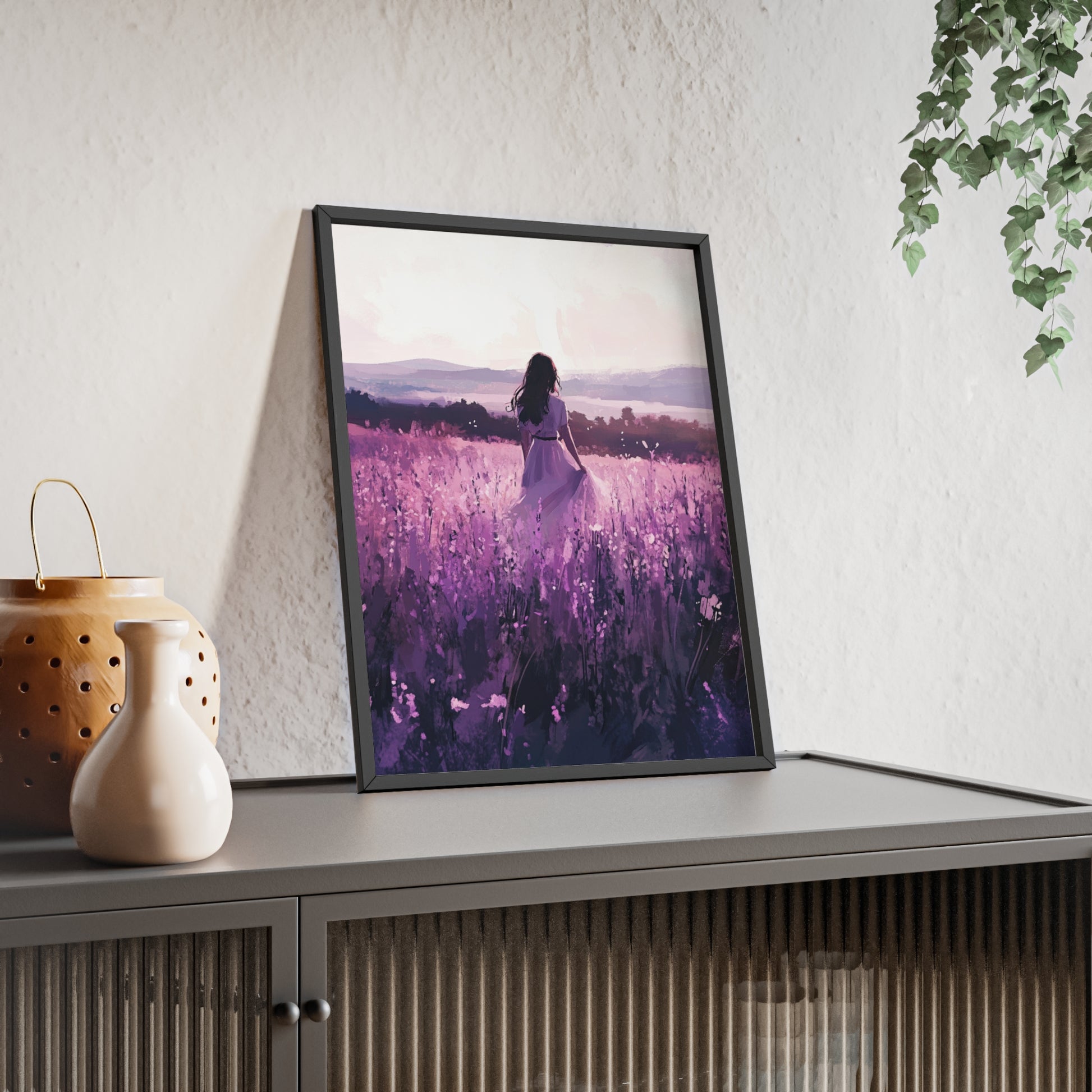 Dieses stimmungsvolle Poster fängt den Zauber eines stillen Augenblicks ein: Eine Frau steht inmitten eines endlosen Lavendelfelds, während das Licht der Abendsonne die Welt in zarte Violett- und Rosatöne taucht. Das Motiv vermittelt Ruhe, Freiheit und den Wunsch, einfach im Moment zu sein.
