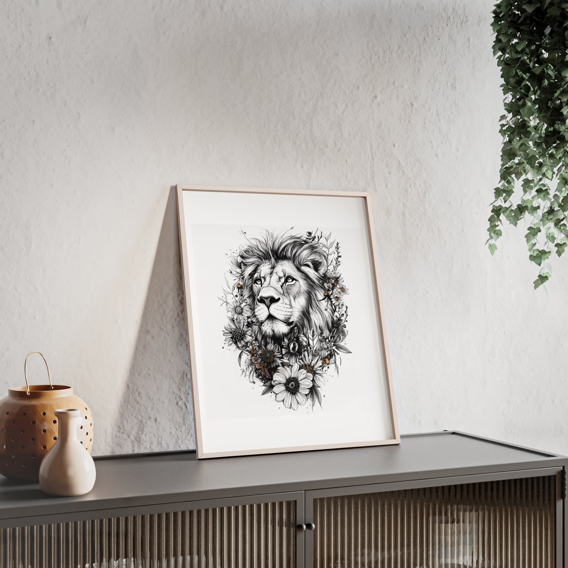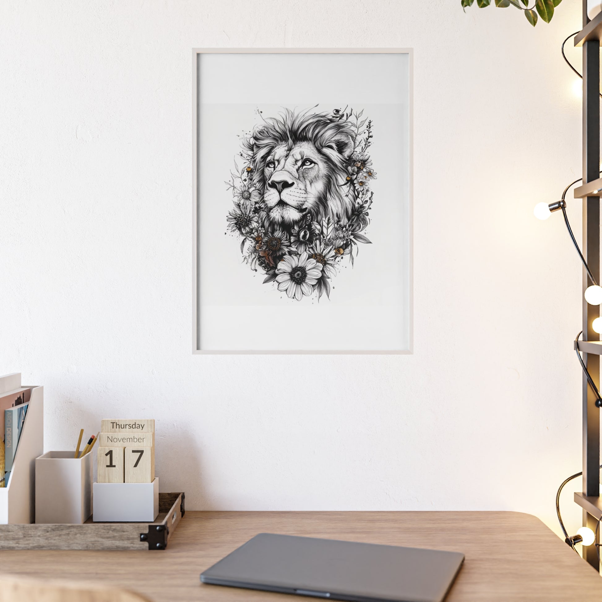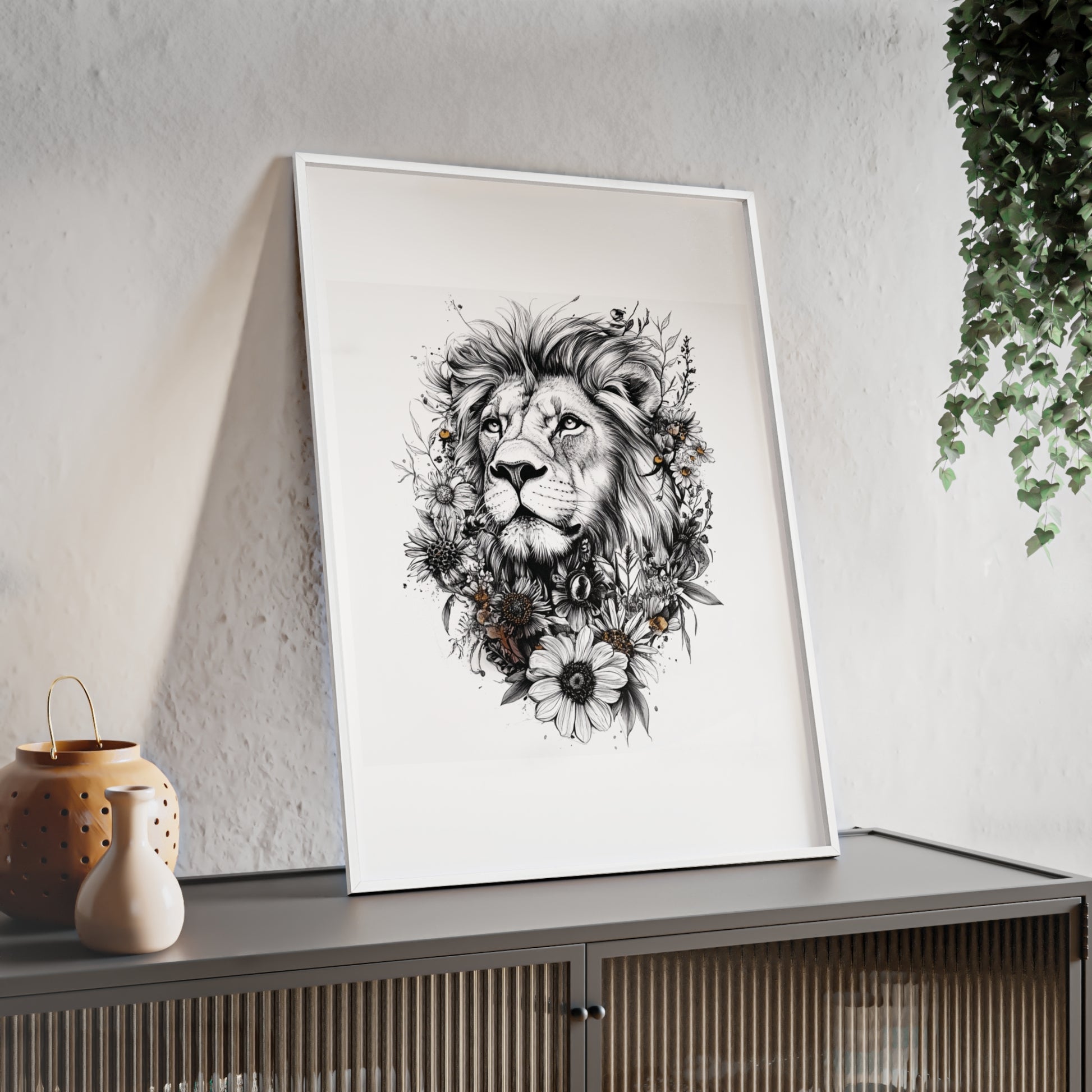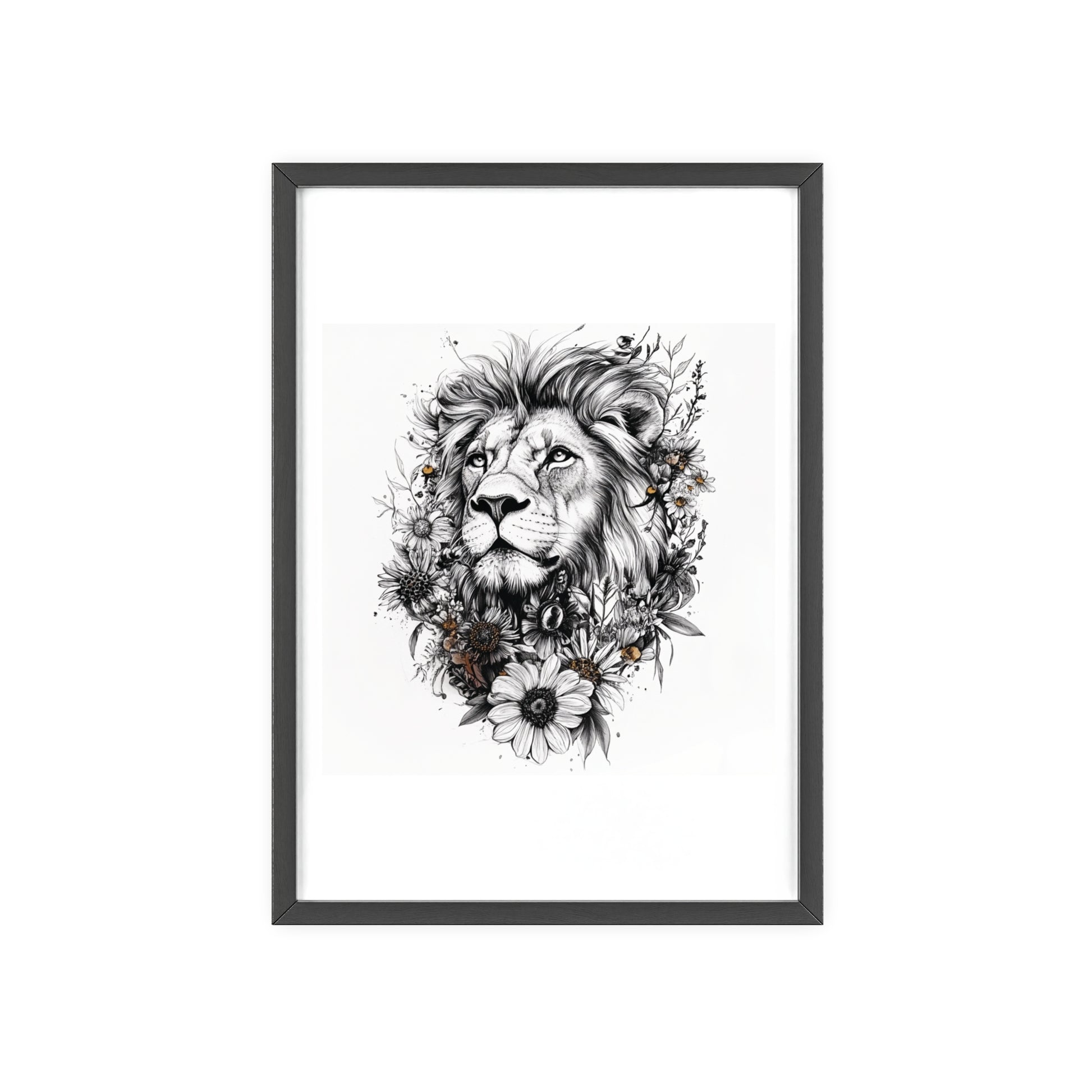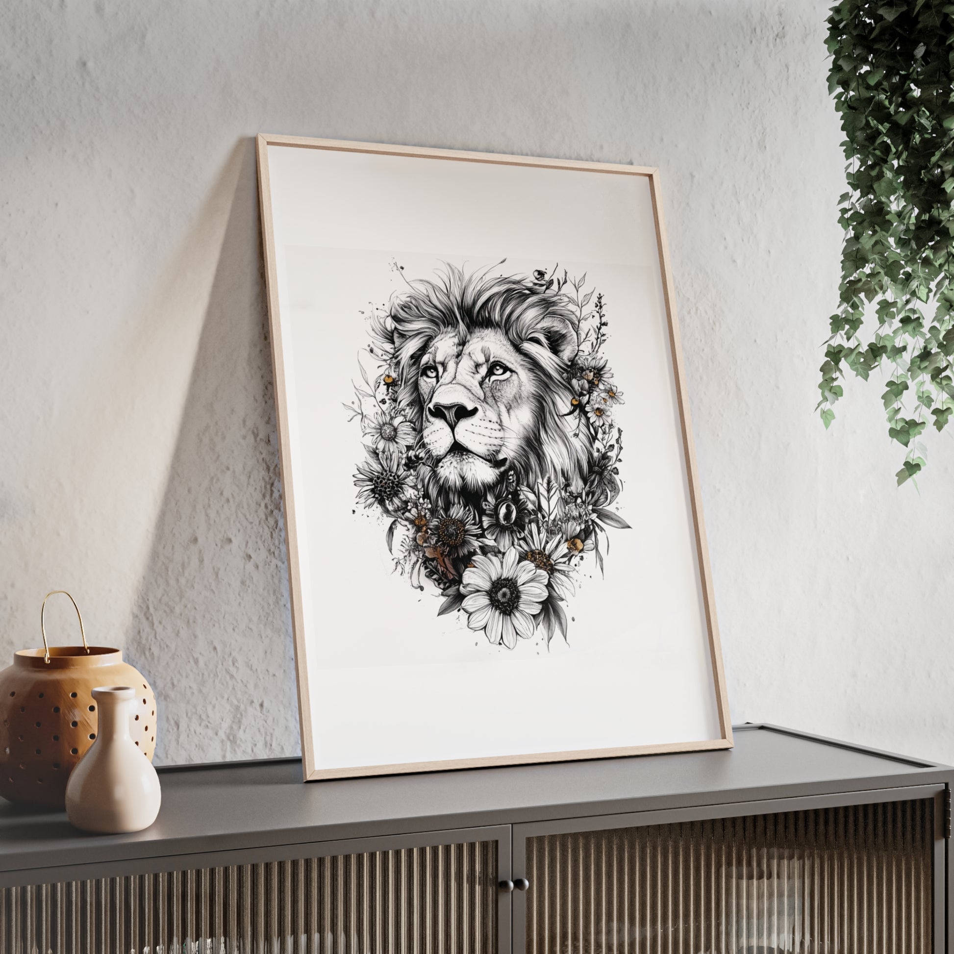 Majestätisch und zugleich zart: Der Löwe wird hier von floralen Akzenten umspielt, was dem Bild Stärke mit poetischer Note verleiht.