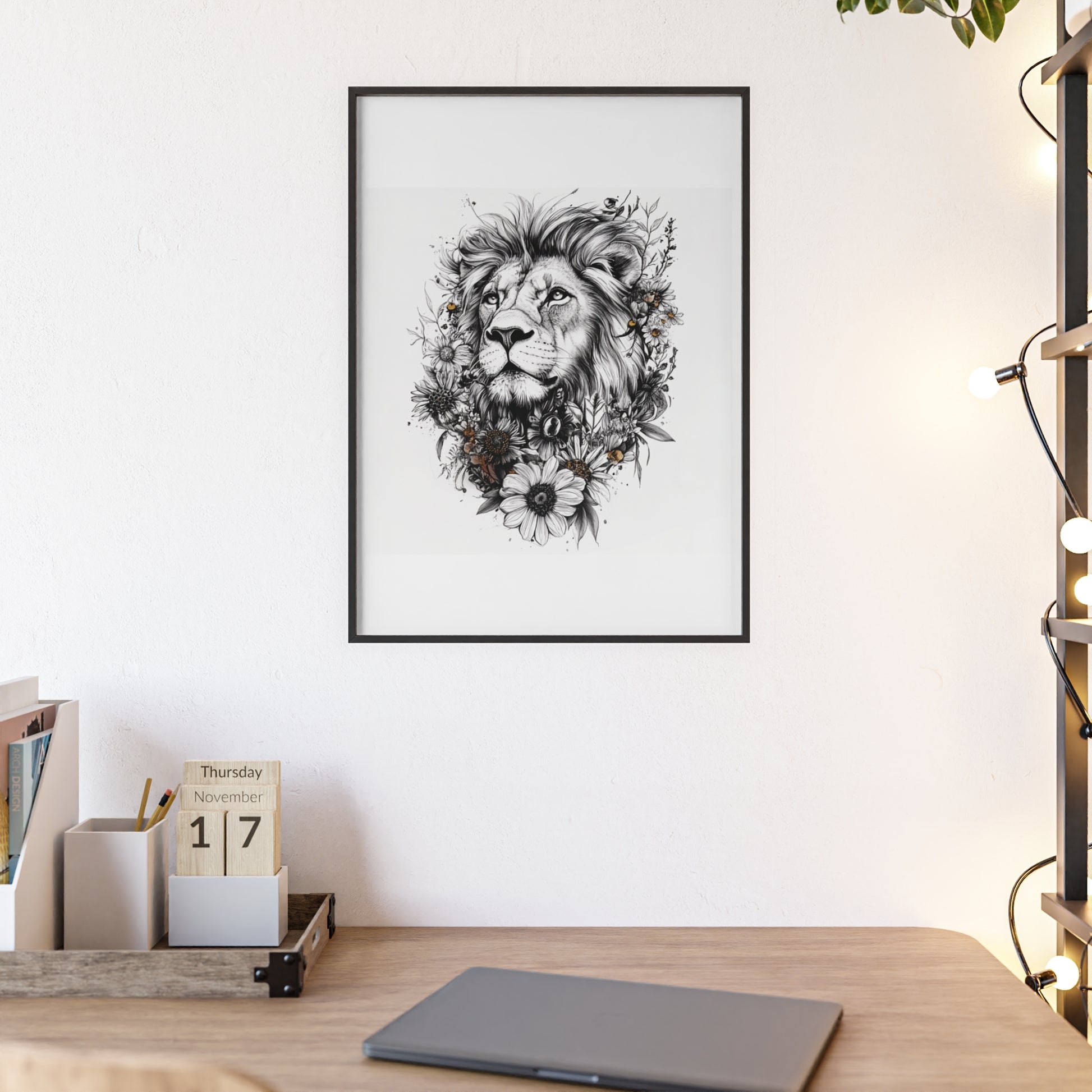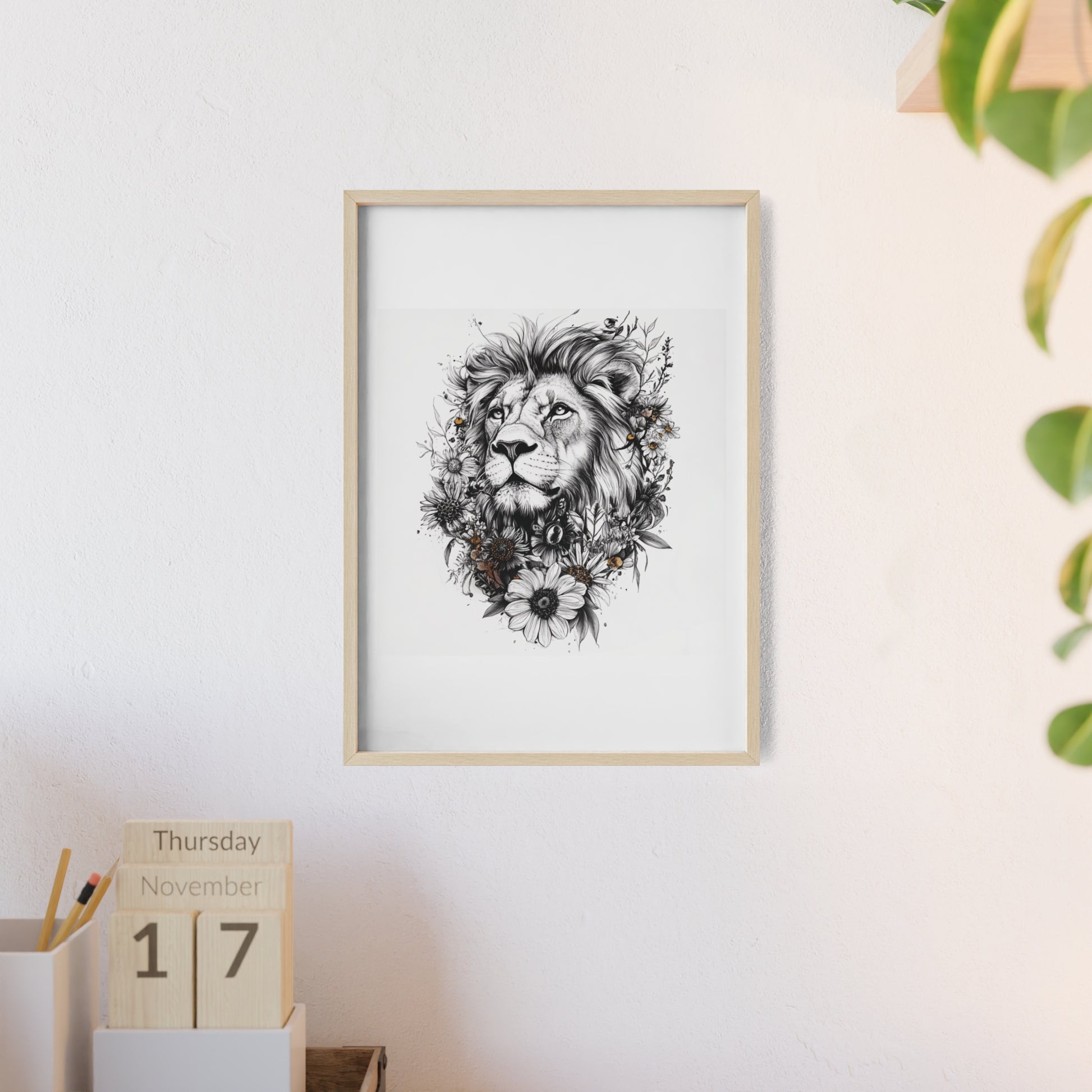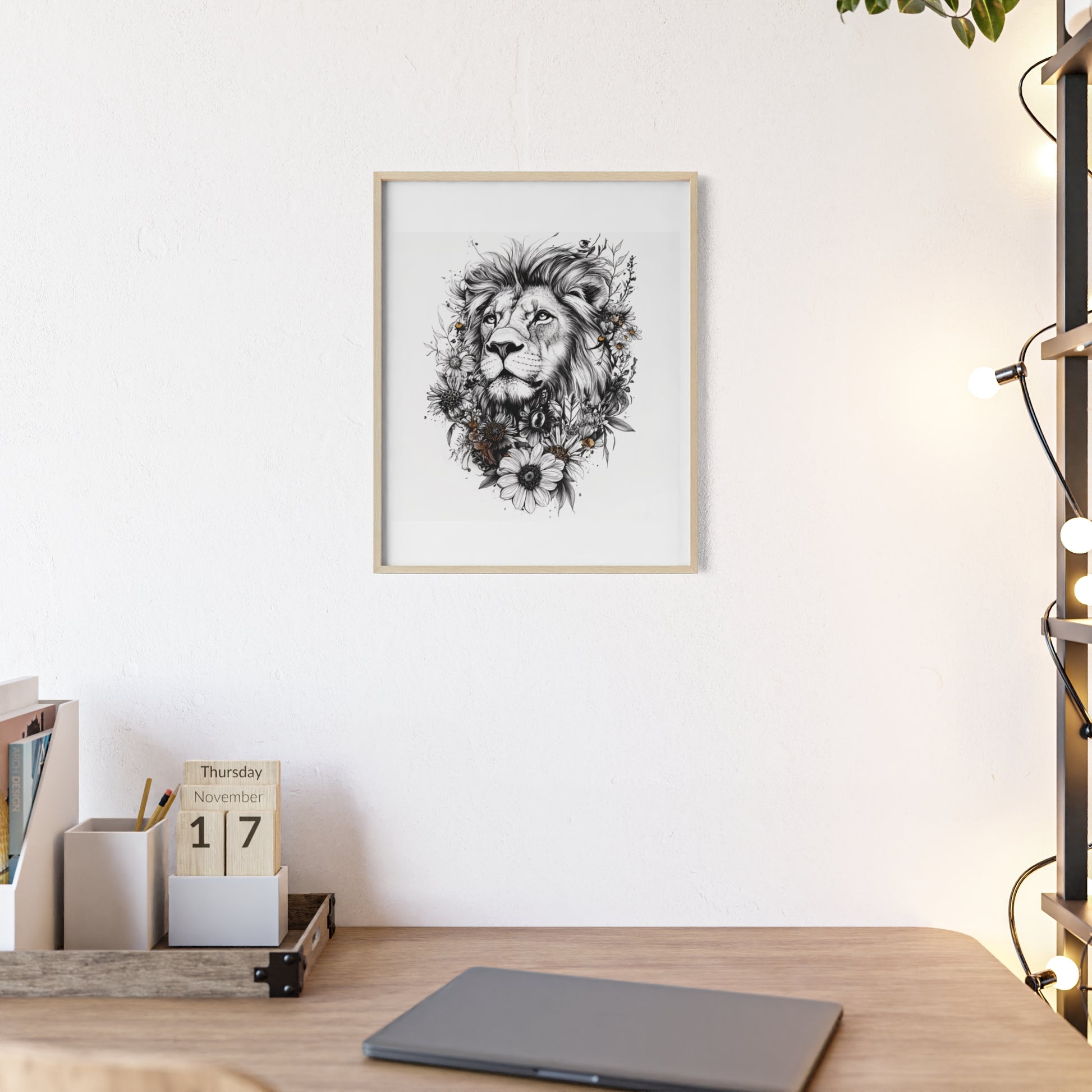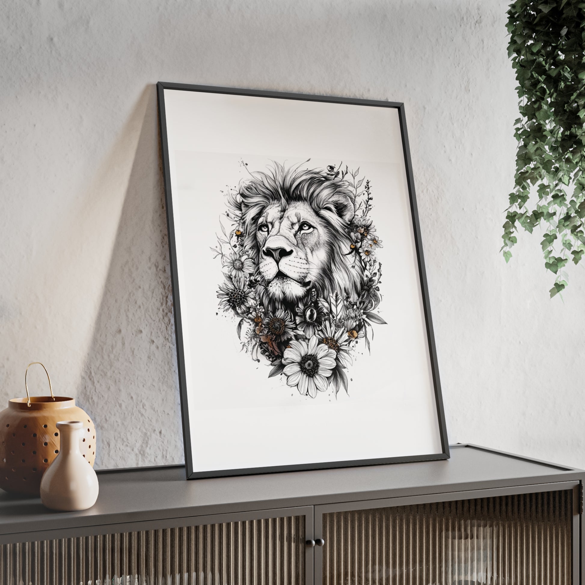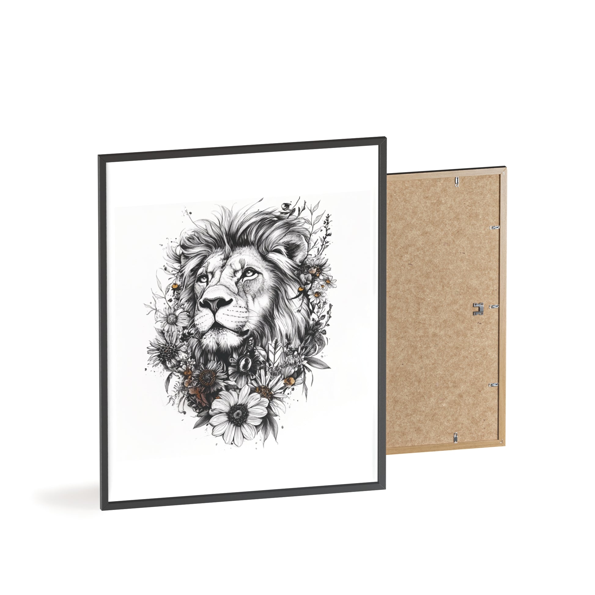 Majestätisch und zugleich zart: Der Löwe wird hier von floralen Akzenten umspielt, was dem Bild Stärke mit poetischer Note verleiht.