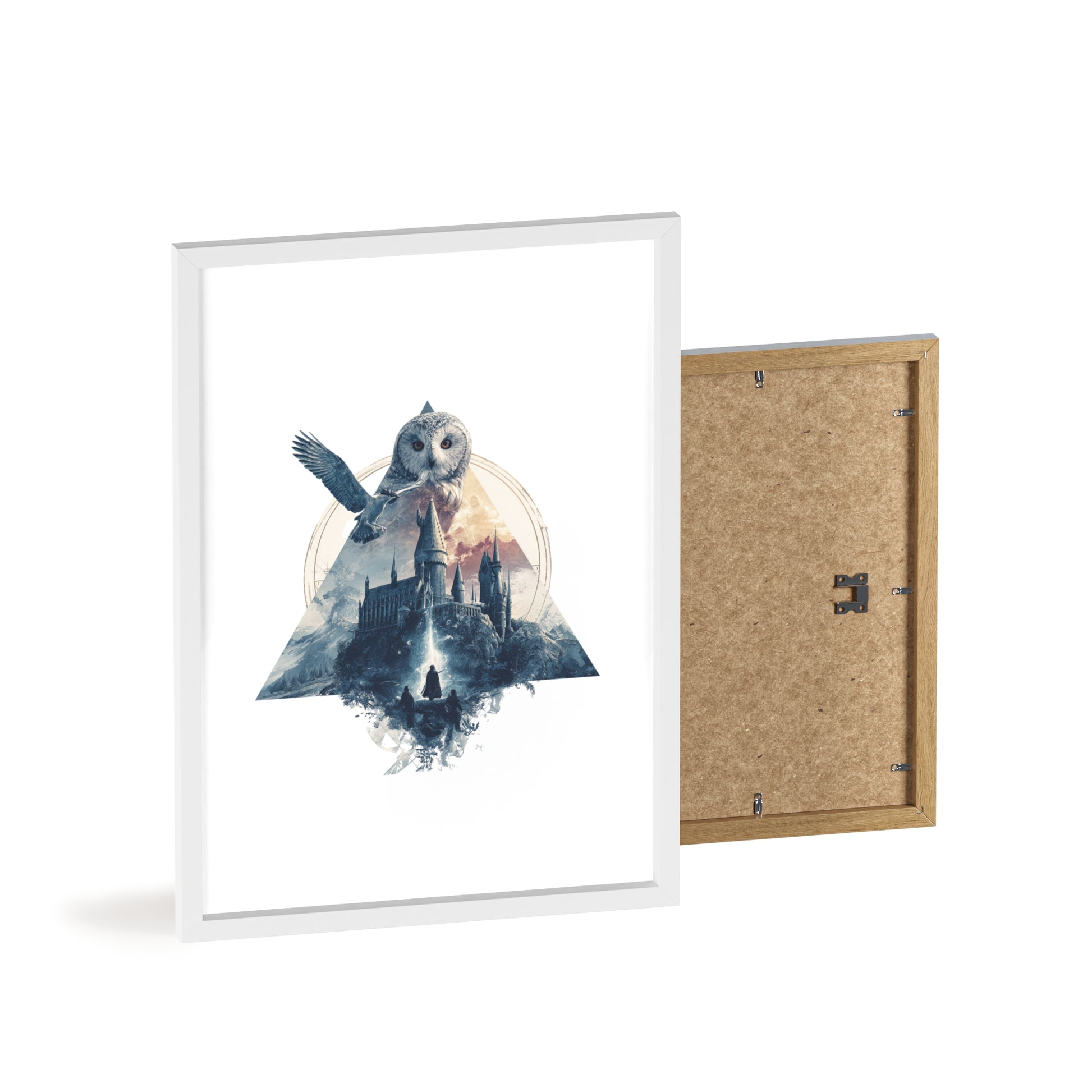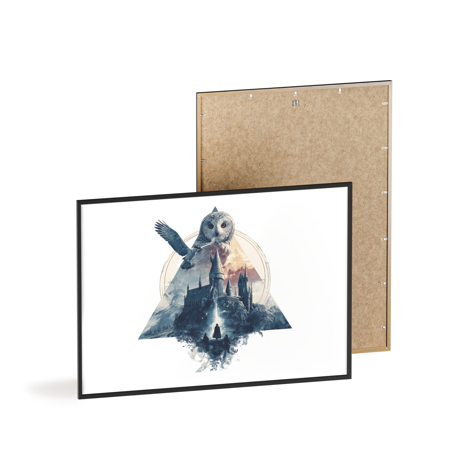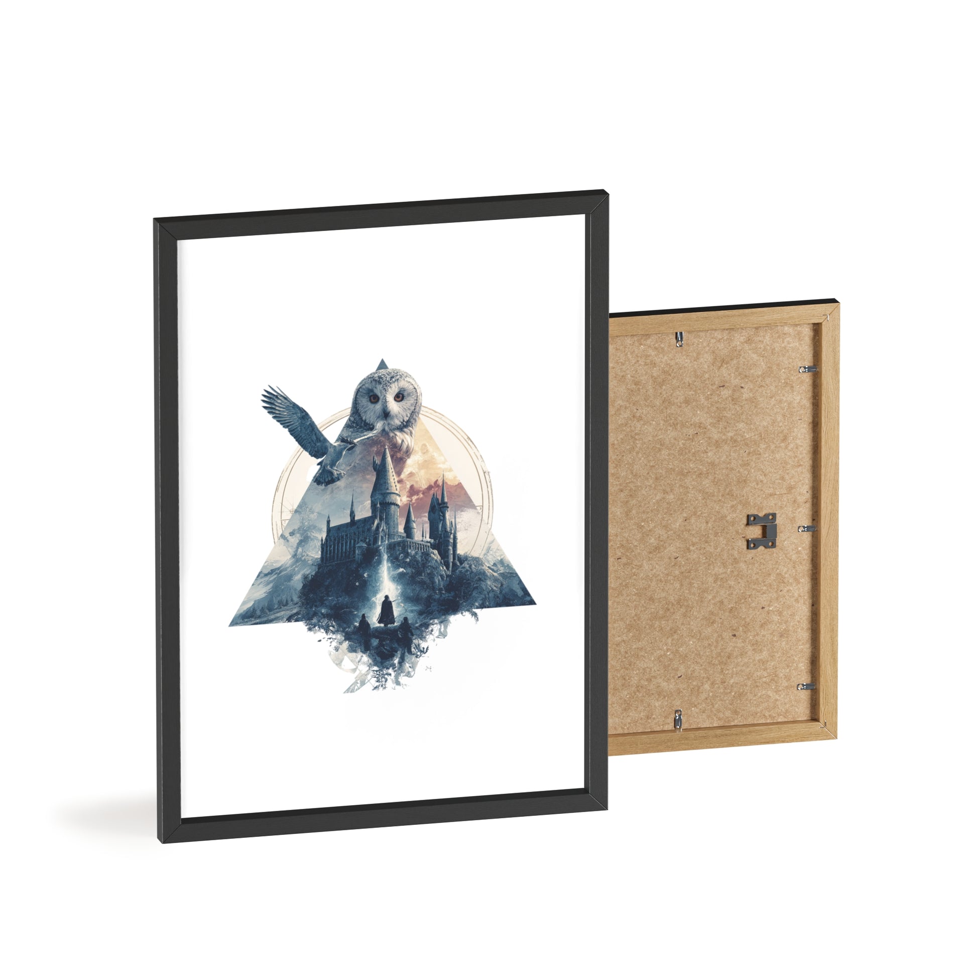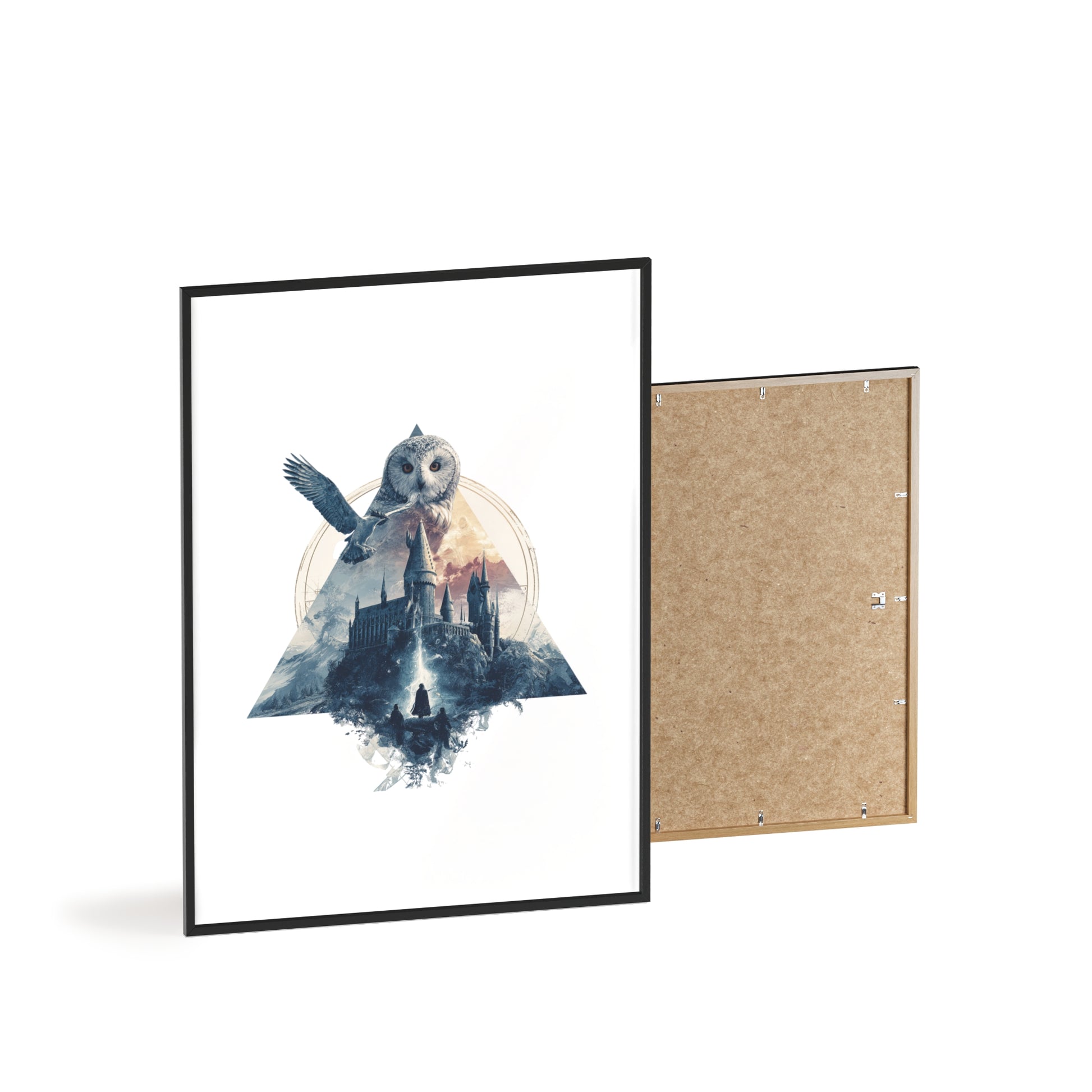 Dieses beeindruckende Poster ist eine Hommage an die magische Welt von Harry Potter. Das Design zeigt ein imposantes Schloss auf einem Felsen, umgeben von mystischem Licht, einer schwebenden Eule und drei Gestalten, die sich einer magischen Kraft stellen – eine Szene, die sofort an die Abenteuer in Hogwarts erinnert.
