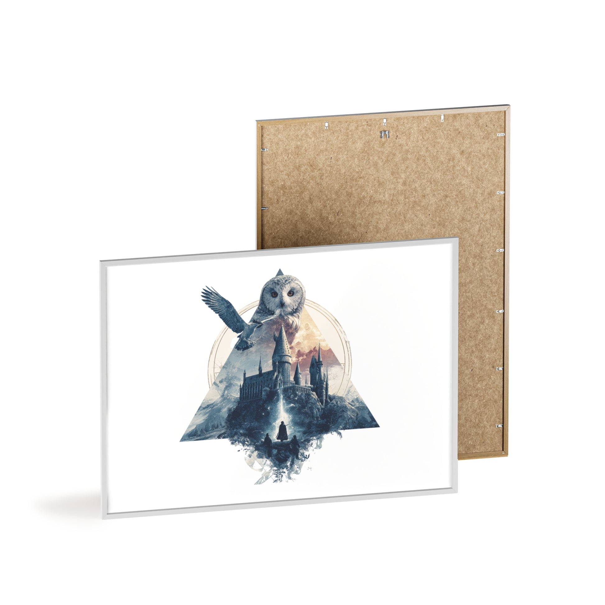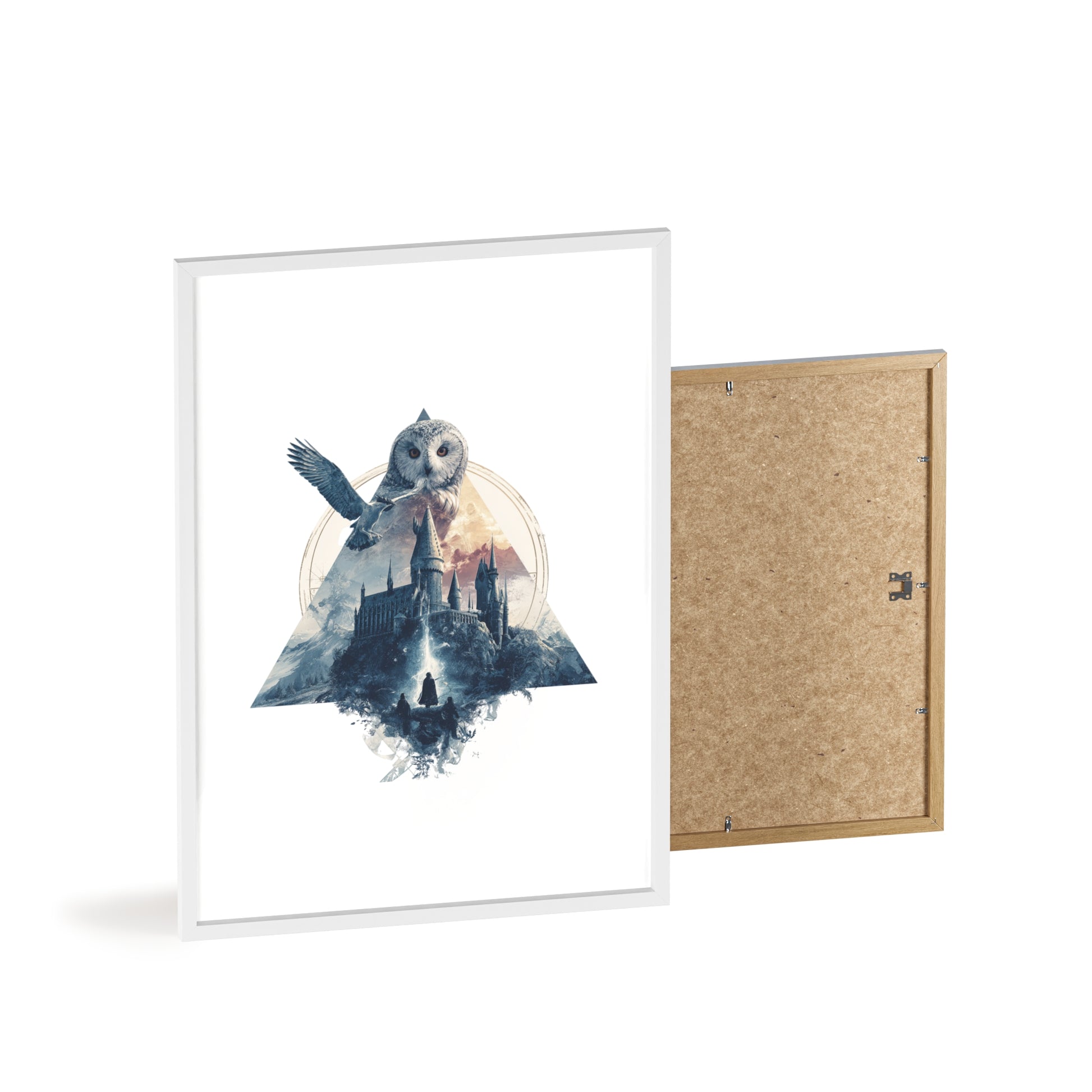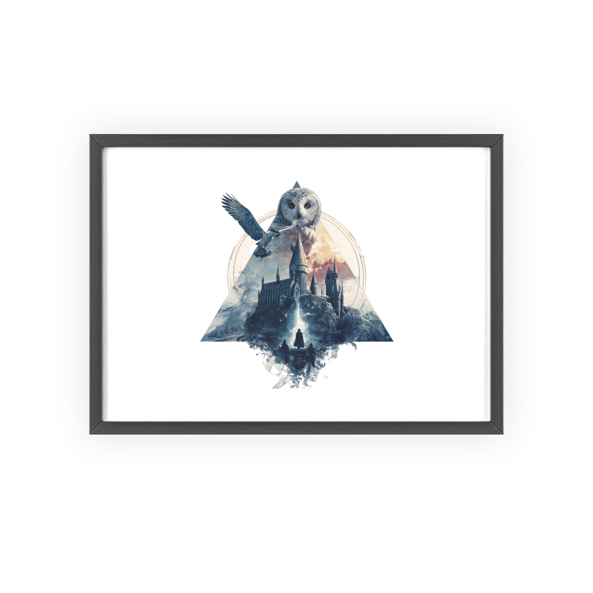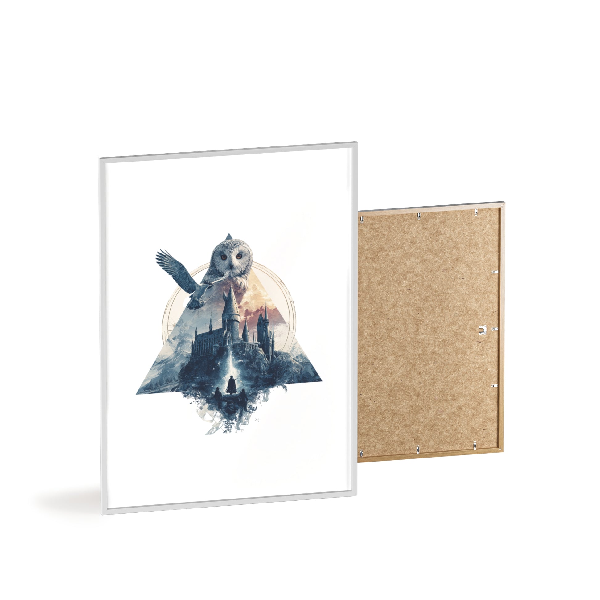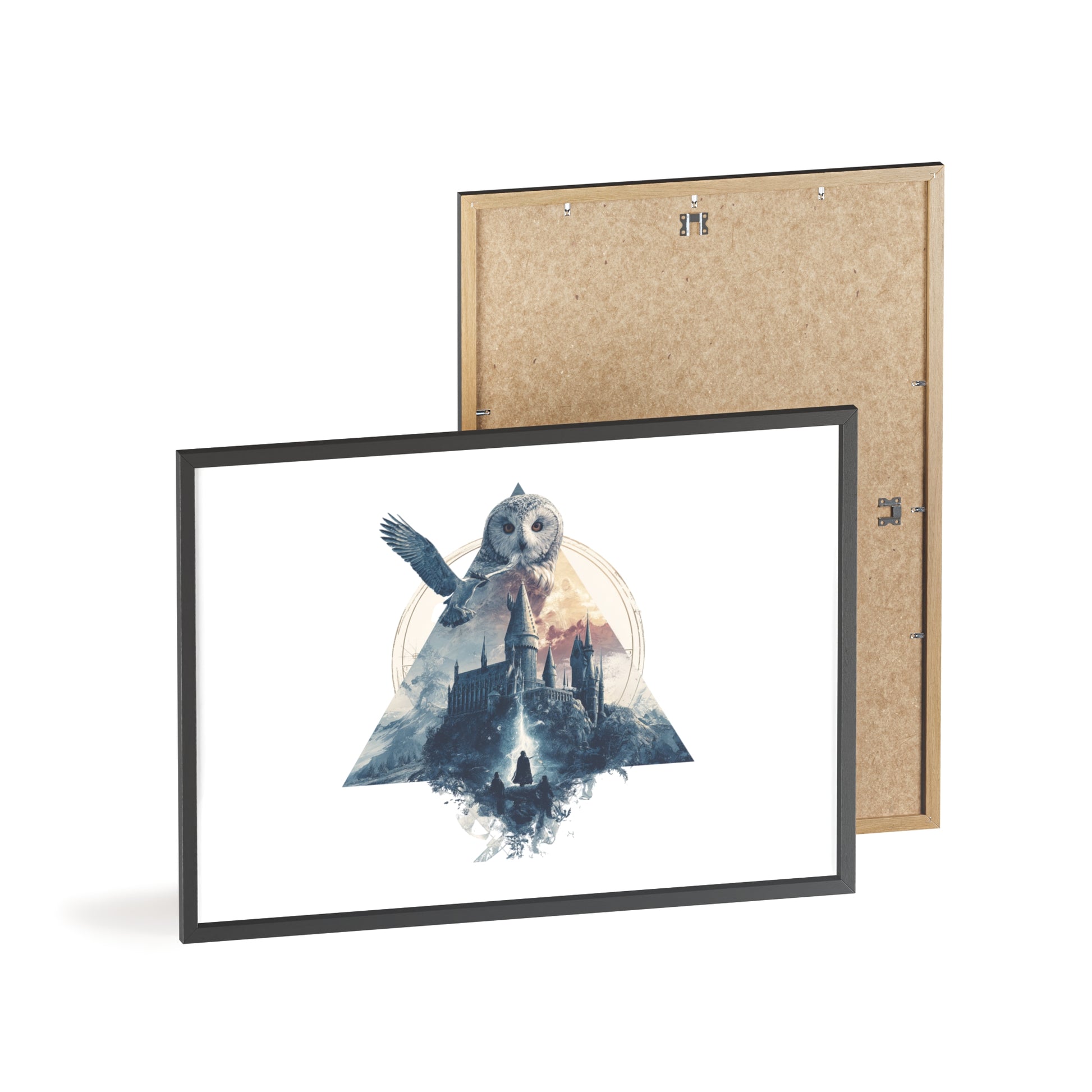 Dieses beeindruckende Poster ist eine Hommage an die magische Welt von Harry Potter. Das Design zeigt ein imposantes Schloss auf einem Felsen, umgeben von mystischem Licht, einer schwebenden Eule und drei Gestalten, die sich einer magischen Kraft stellen – eine Szene, die sofort an die Abenteuer in Hogwarts erinnert.