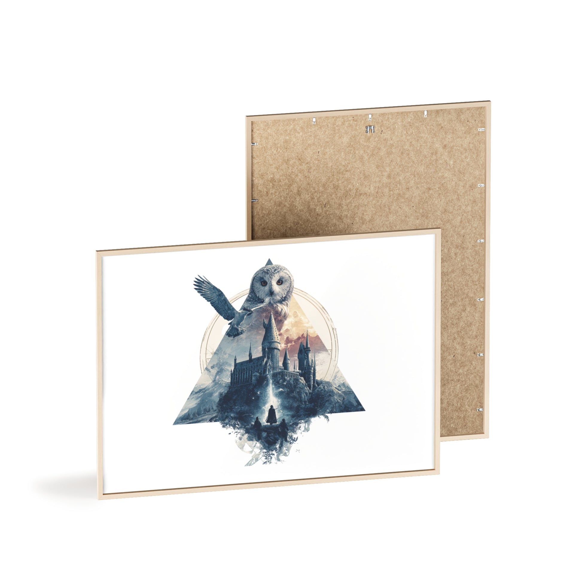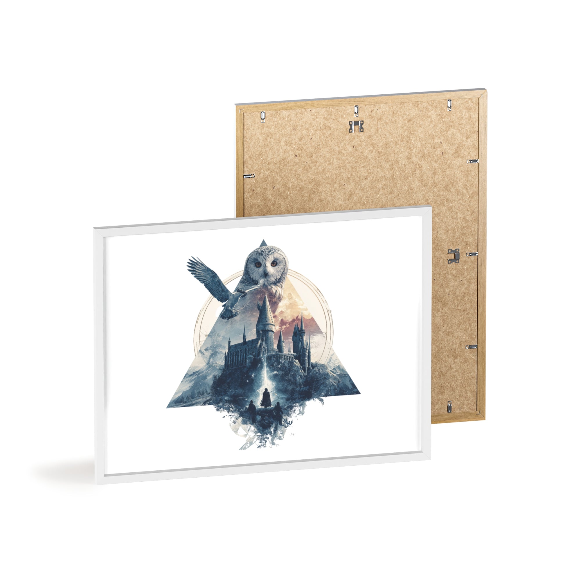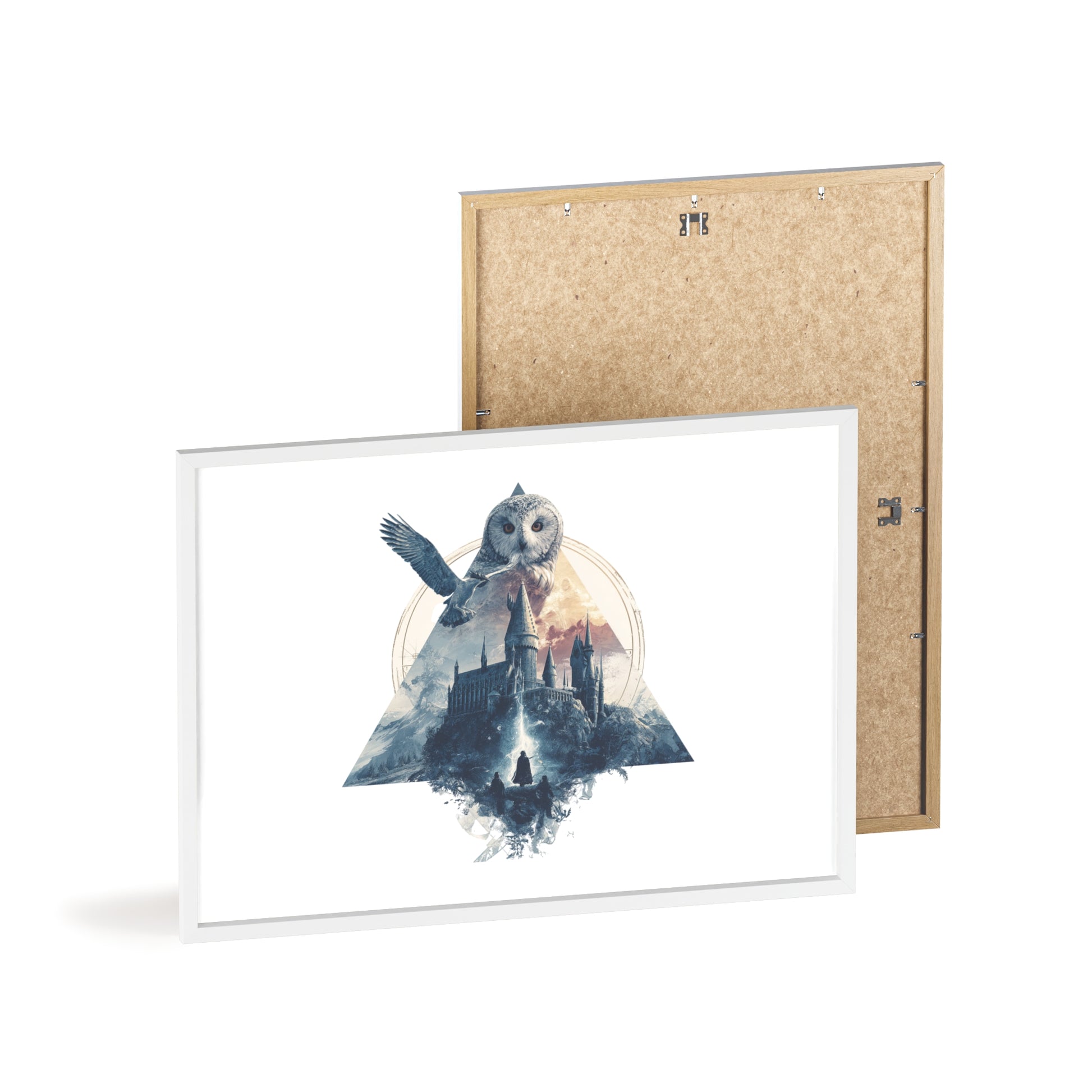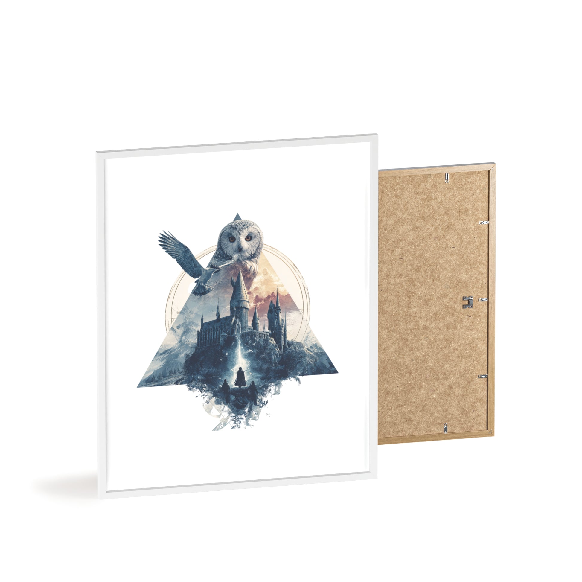 Dieses beeindruckende Poster ist eine Hommage an die magische Welt von Harry Potter. Das Design zeigt ein imposantes Schloss auf einem Felsen, umgeben von mystischem Licht, einer schwebenden Eule und drei Gestalten, die sich einer magischen Kraft stellen – eine Szene, die sofort an die Abenteuer in Hogwarts erinnert.