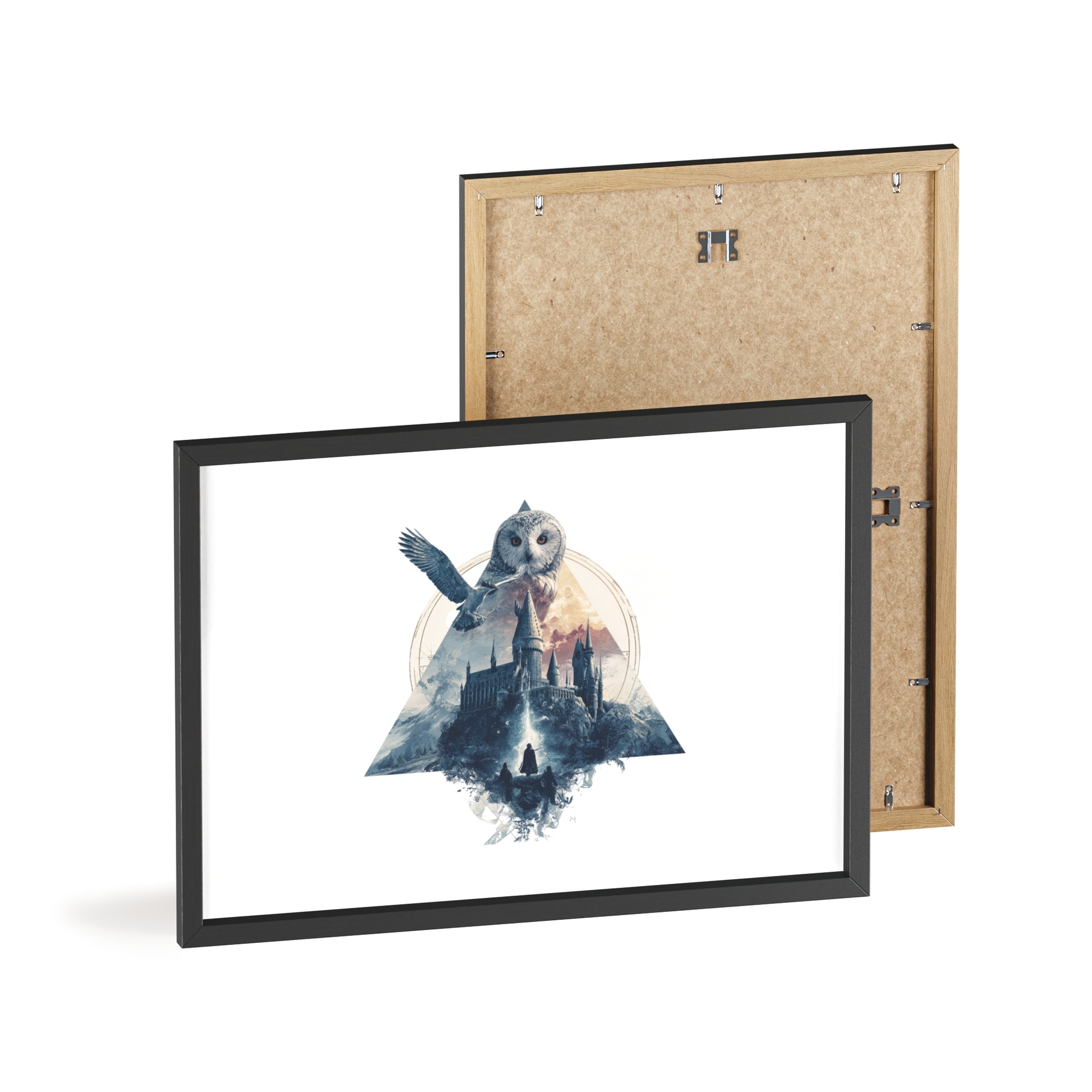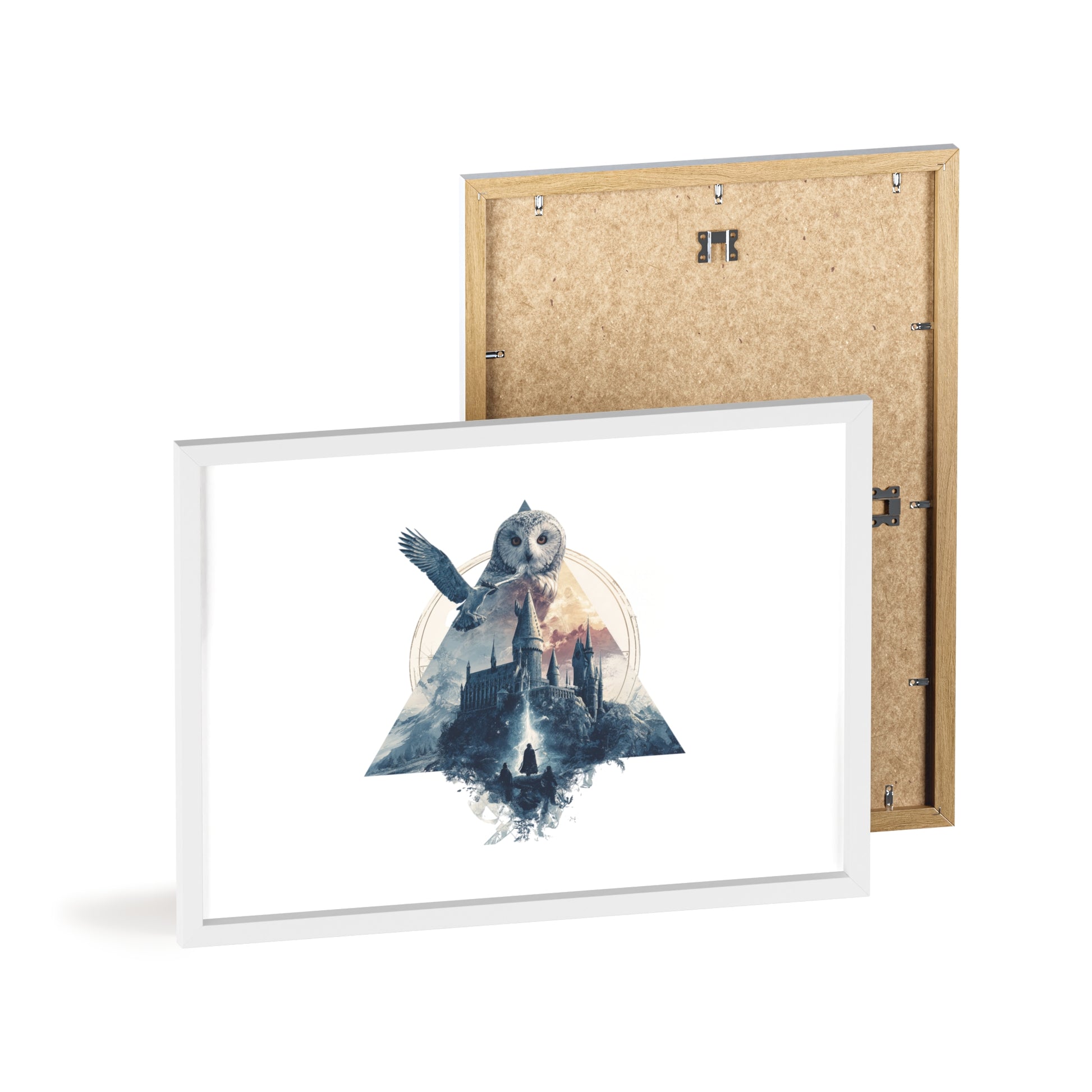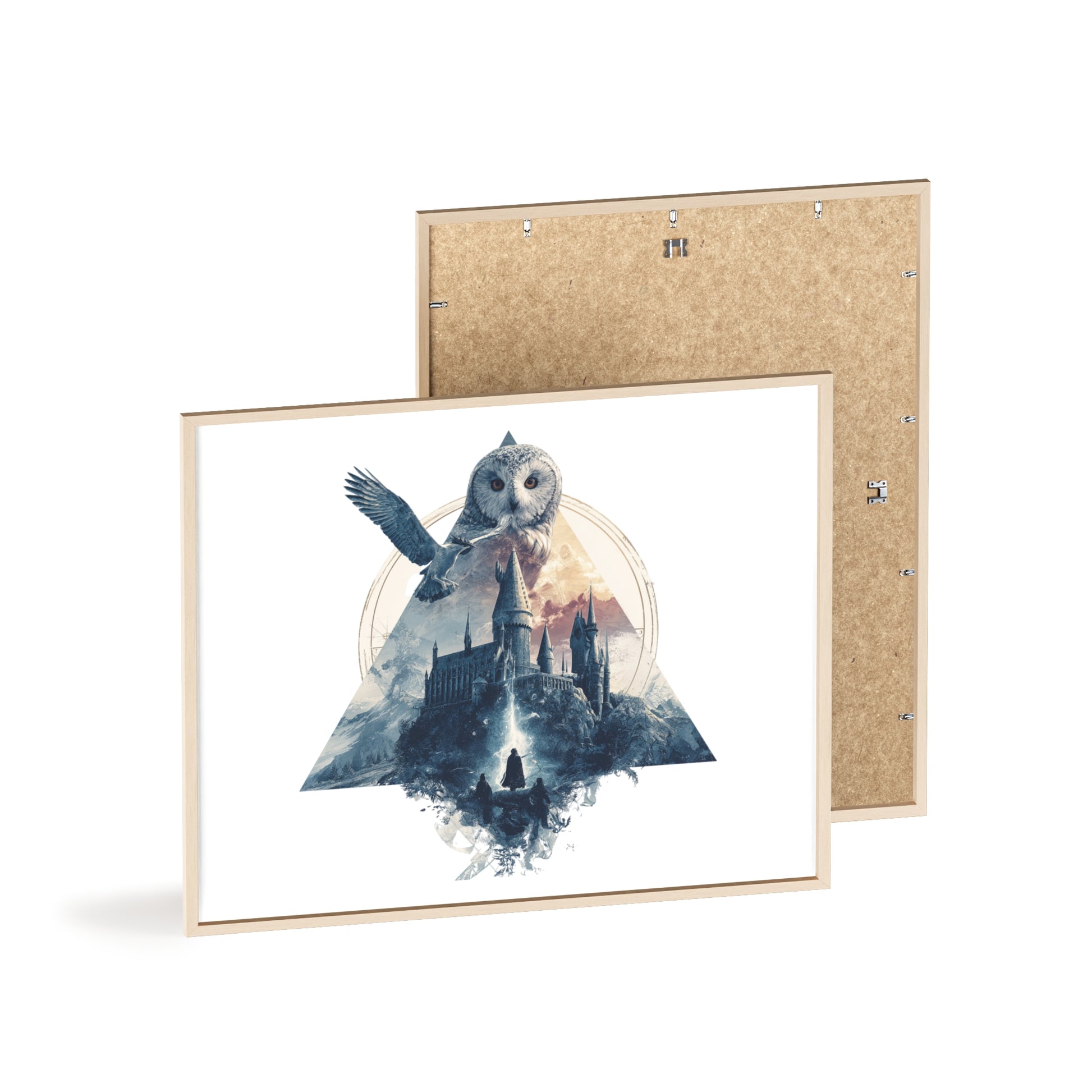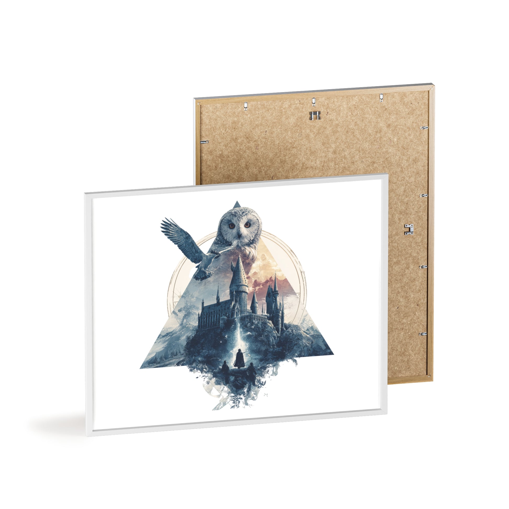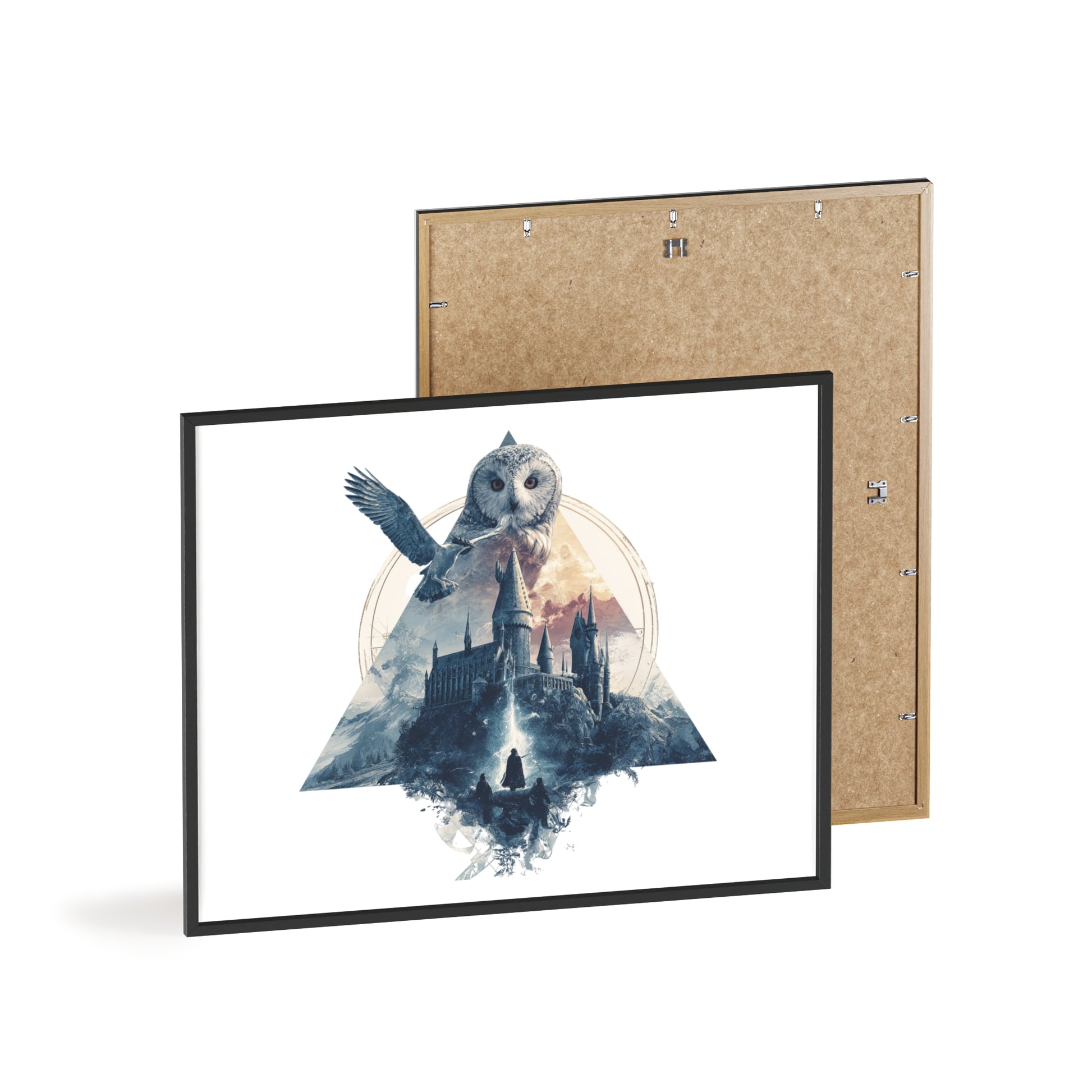 Dieses beeindruckende Poster ist eine Hommage an die magische Welt von Harry Potter. Das Design zeigt ein imposantes Schloss auf einem Felsen, umgeben von mystischem Licht, einer schwebenden Eule und drei Gestalten, die sich einer magischen Kraft stellen – eine Szene, die sofort an die Abenteuer in Hogwarts erinnert.