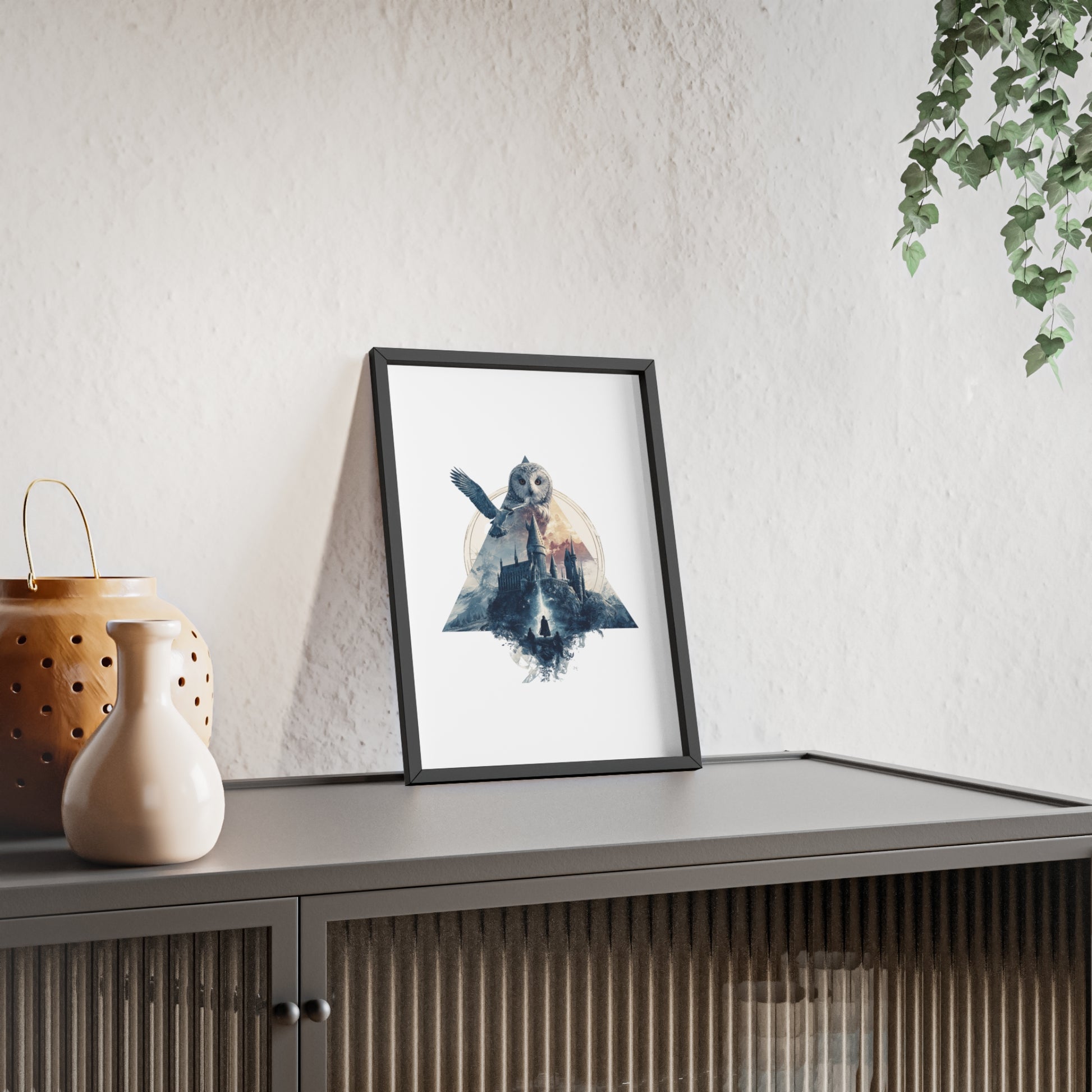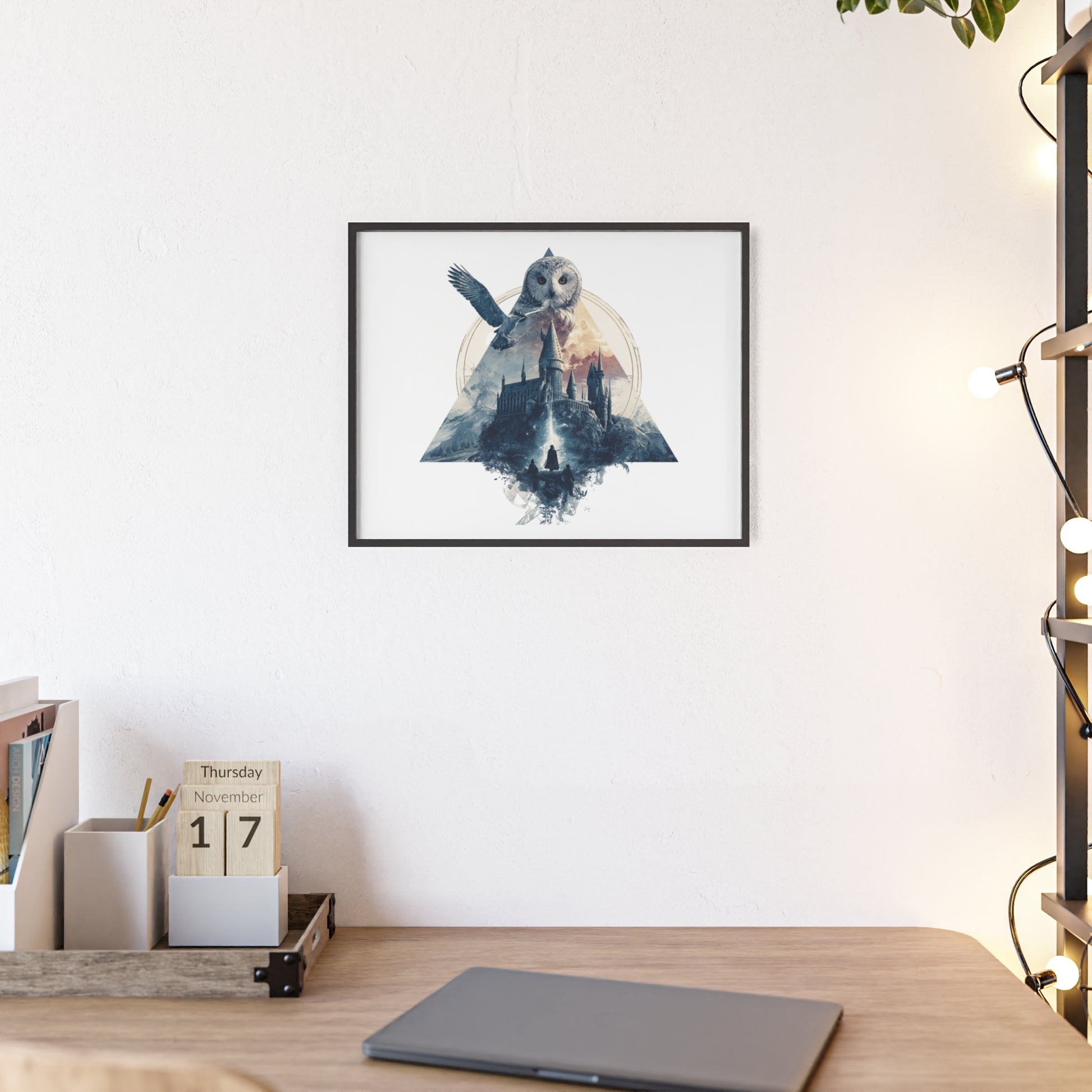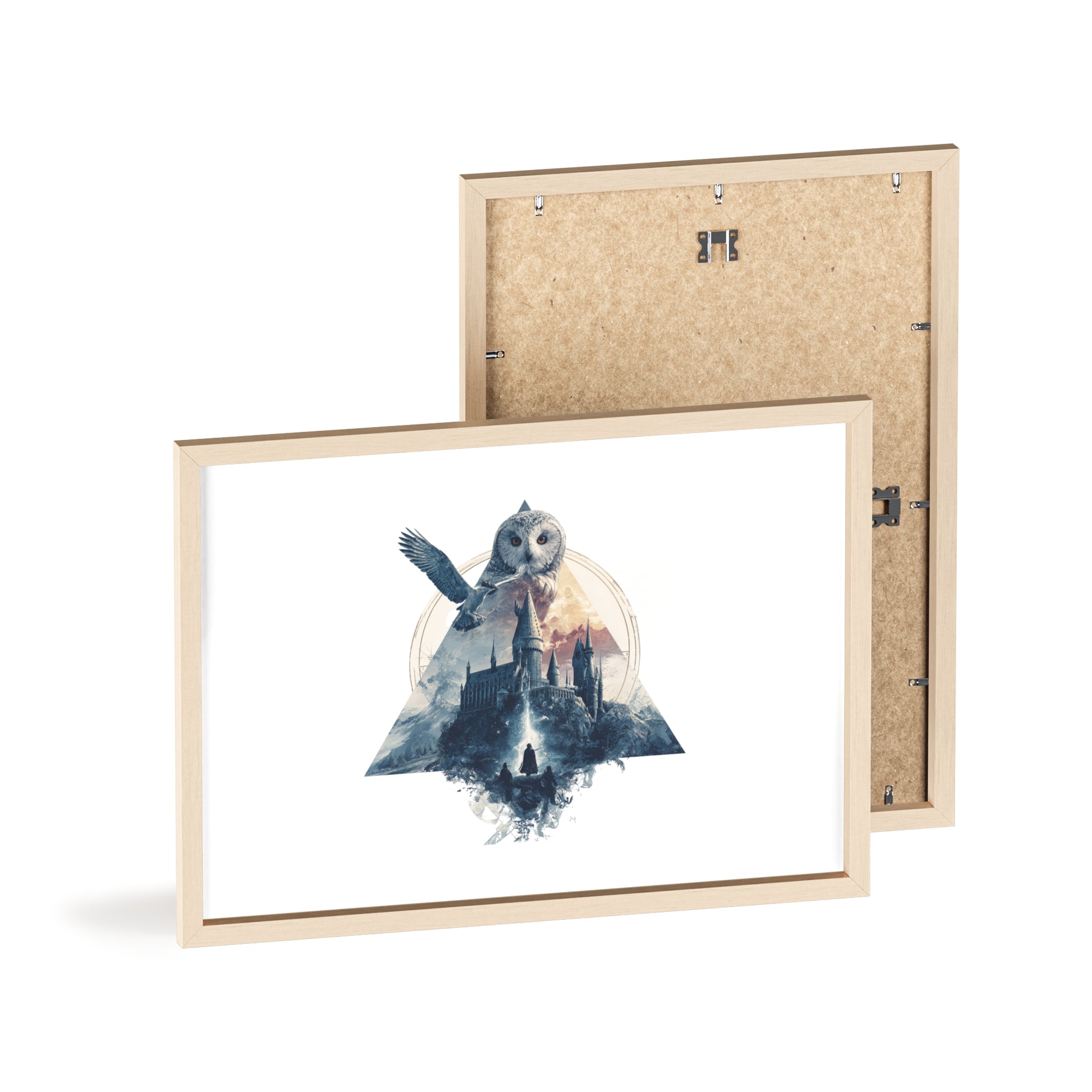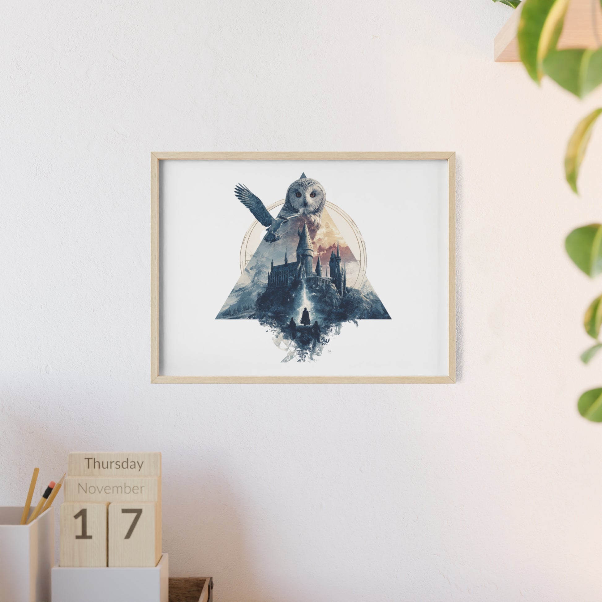 Dieses beeindruckende Poster ist eine Hommage an die magische Welt von Harry Potter. Das Design zeigt ein imposantes Schloss auf einem Felsen, umgeben von mystischem Licht, einer schwebenden Eule und drei Gestalten, die sich einer magischen Kraft stellen – eine Szene, die sofort an die Abenteuer in Hogwarts erinnert.