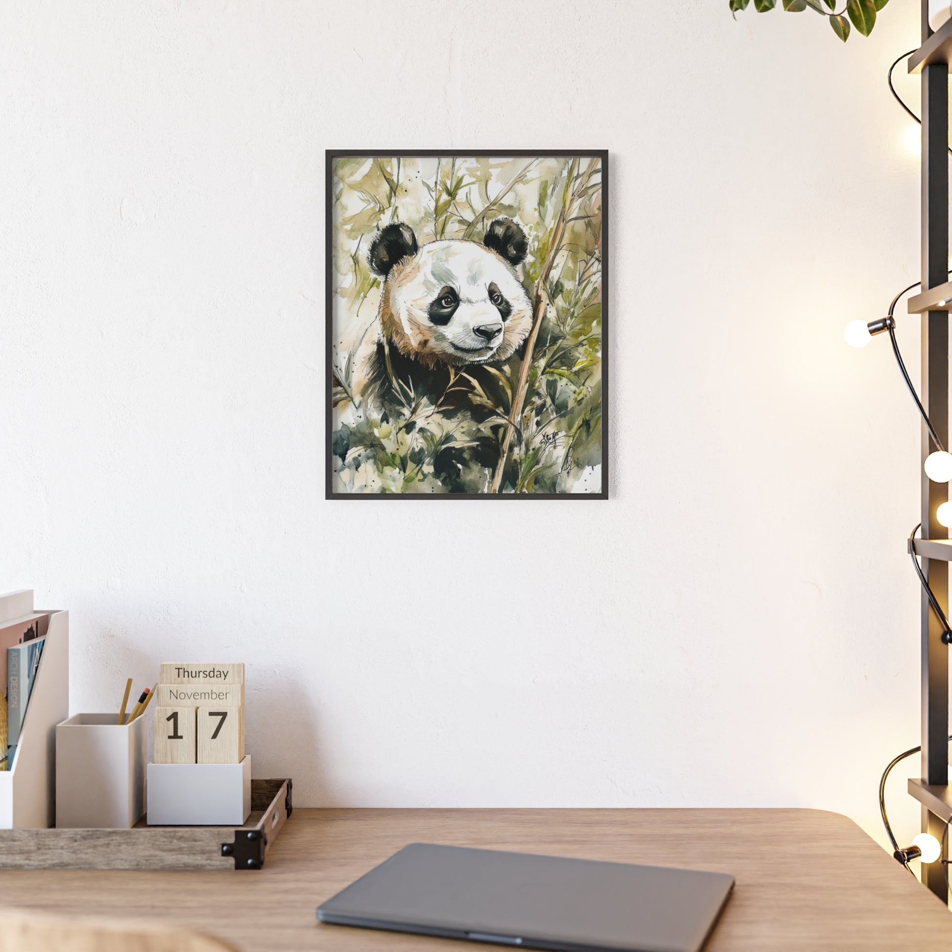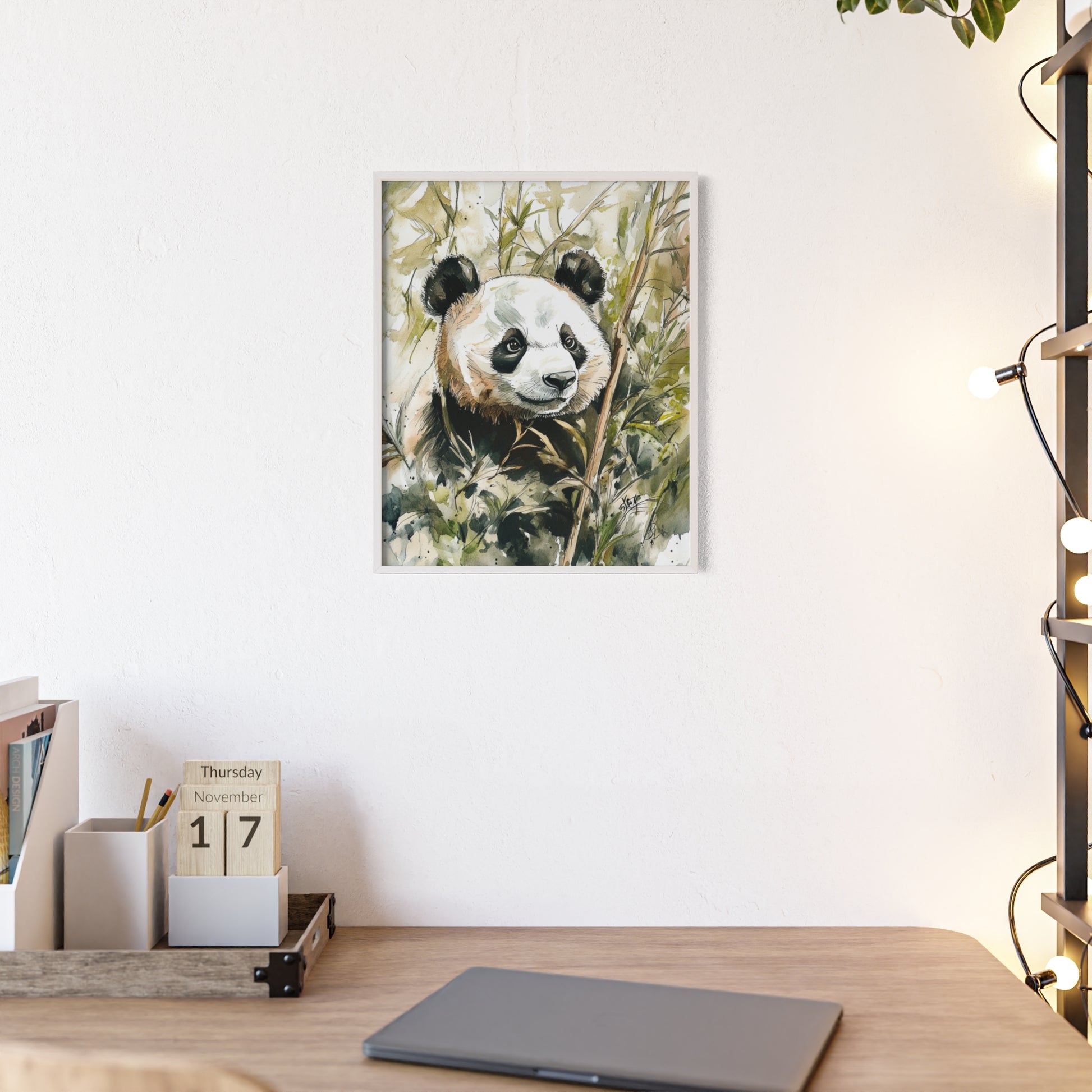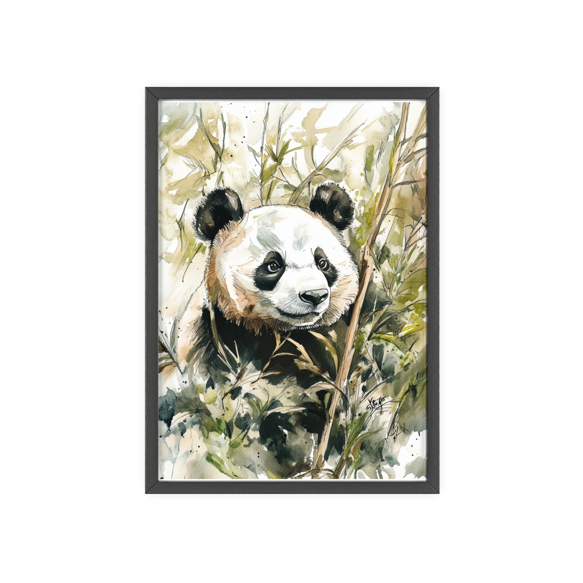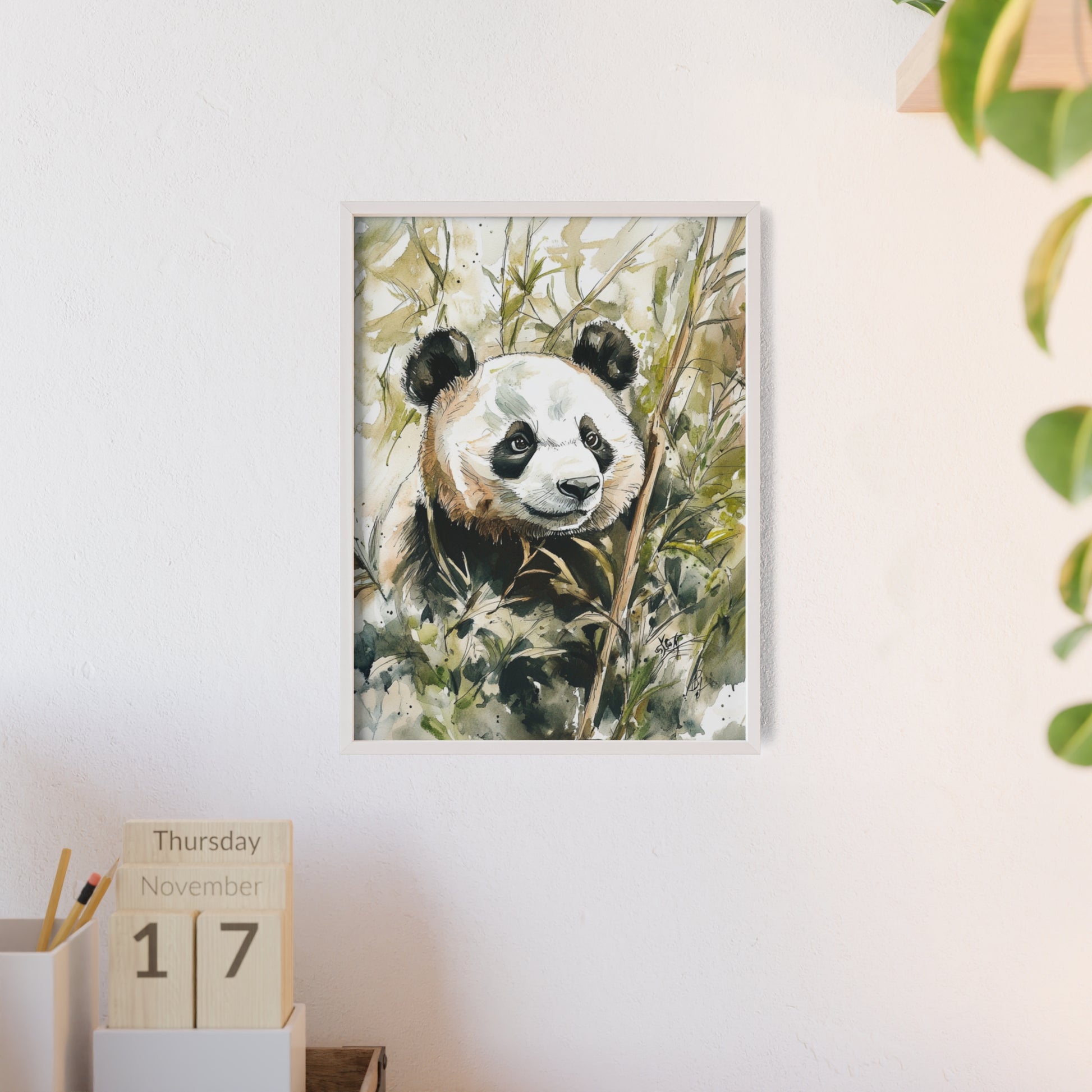 Dieses liebevoll gestaltete Poster zeigt einen friedlichen Panda inmitten von Bambus, gemalt im sanften Wasserfarbenstil. Die weichen Farbverläufe in Grün- und Beigetönen verleihen dem Motiv Ruhe und Natürlichkeit – ein Kunstwerk, das Herz und Seele gleichermaßen berührt.
