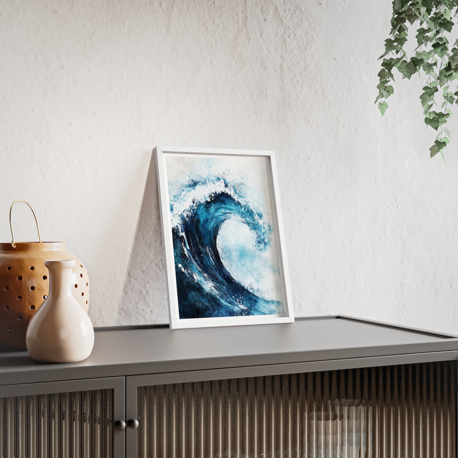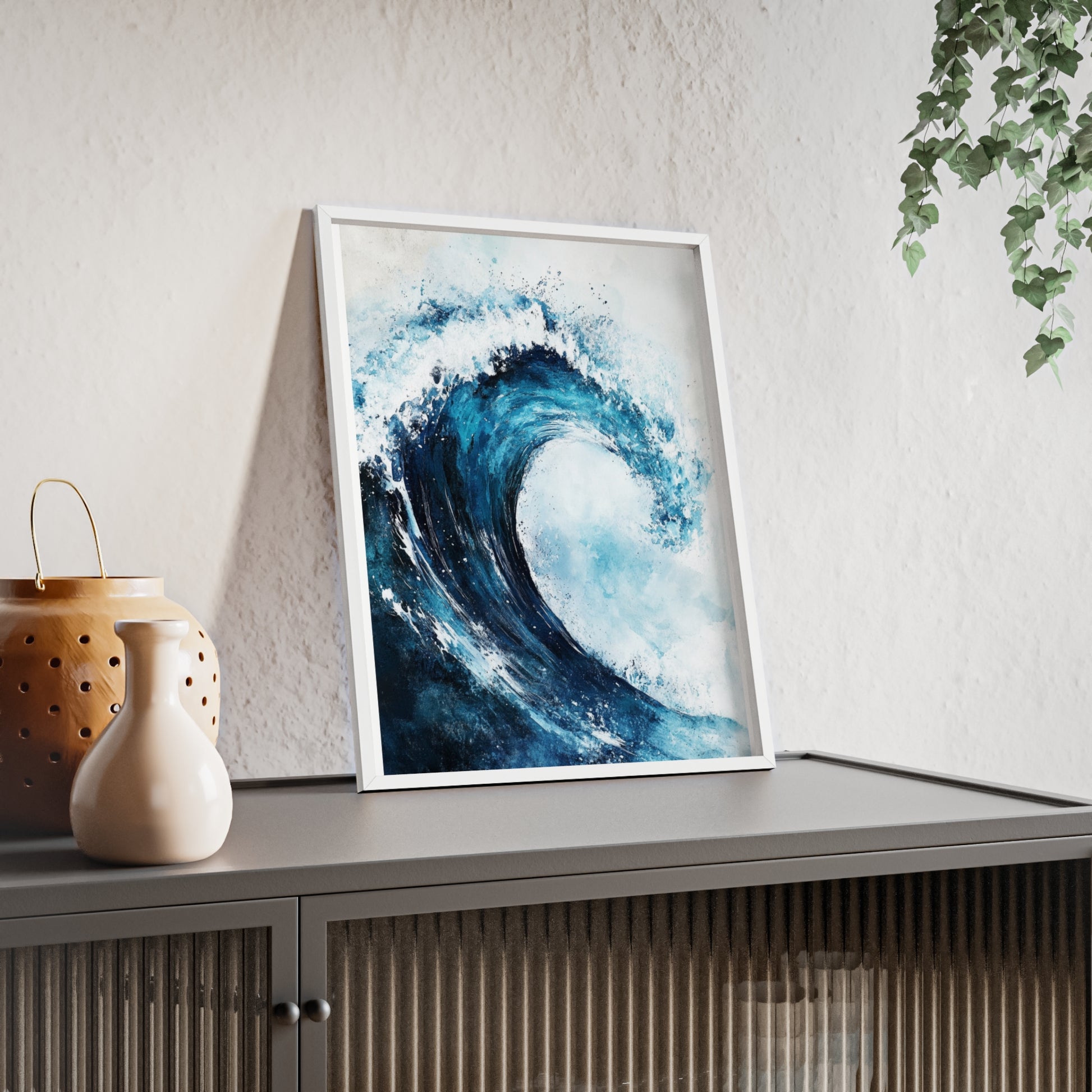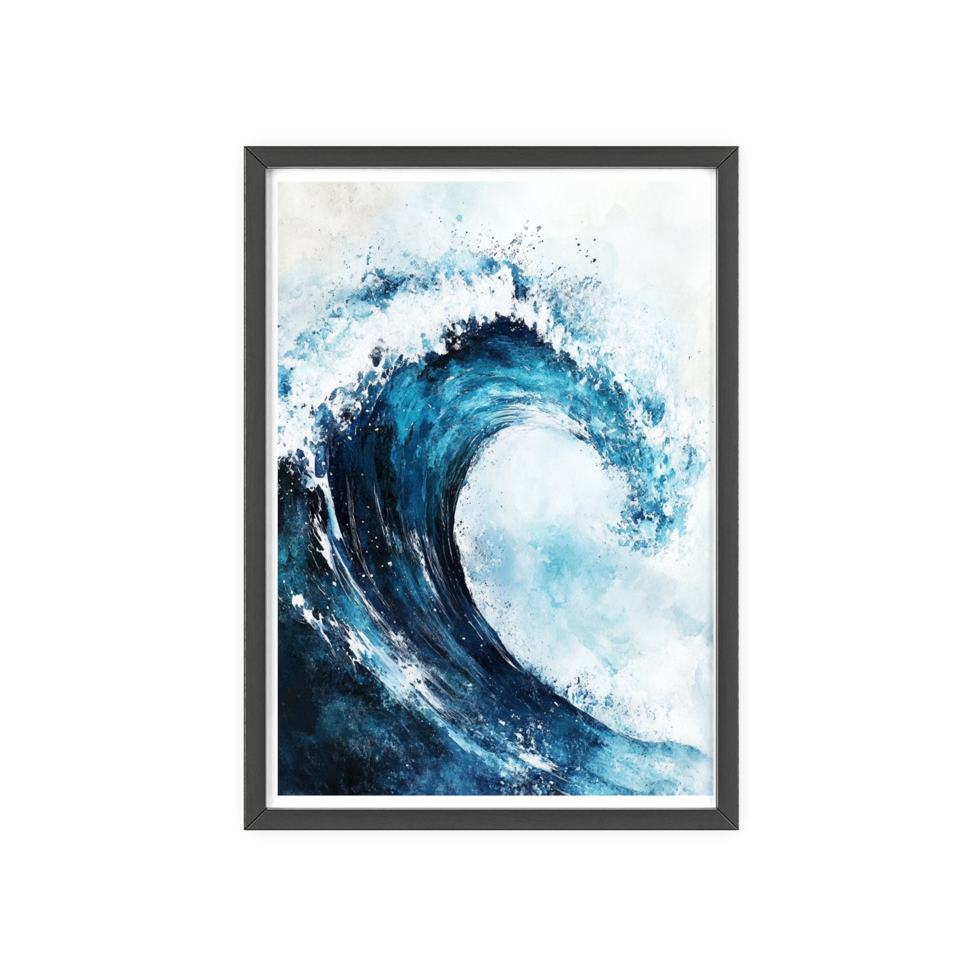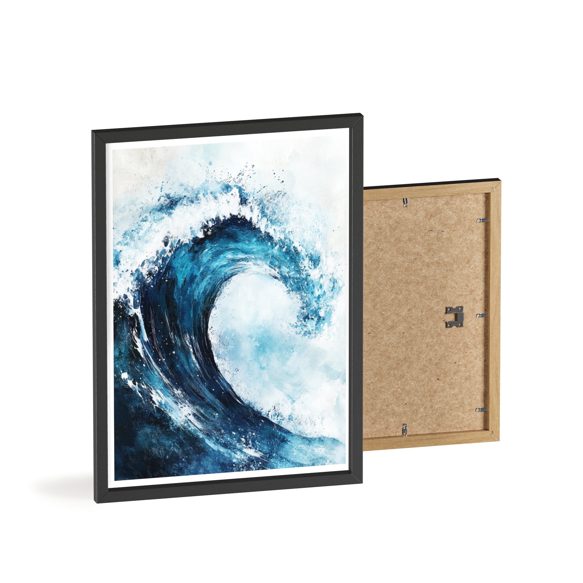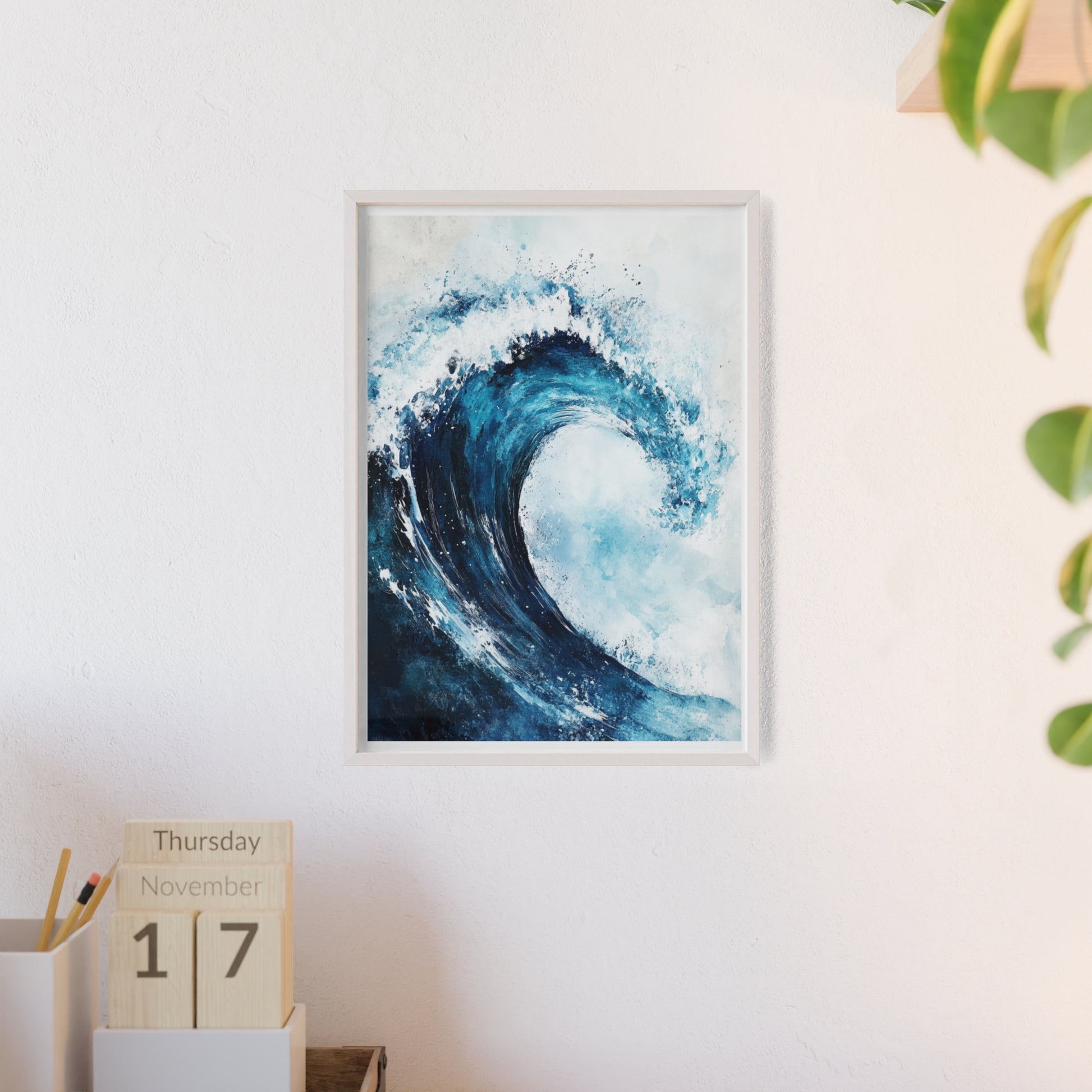 Dieses beeindruckende Poster fängt die ungezähmte Energie des Ozeans ein. Die majestätische Welle, gemalt in leuchtenden Blau- und Weißtönen, vermittelt Dynamik, Bewegung und Stärke – ein Sinnbild für Freiheit und die Kraft der Natur.
