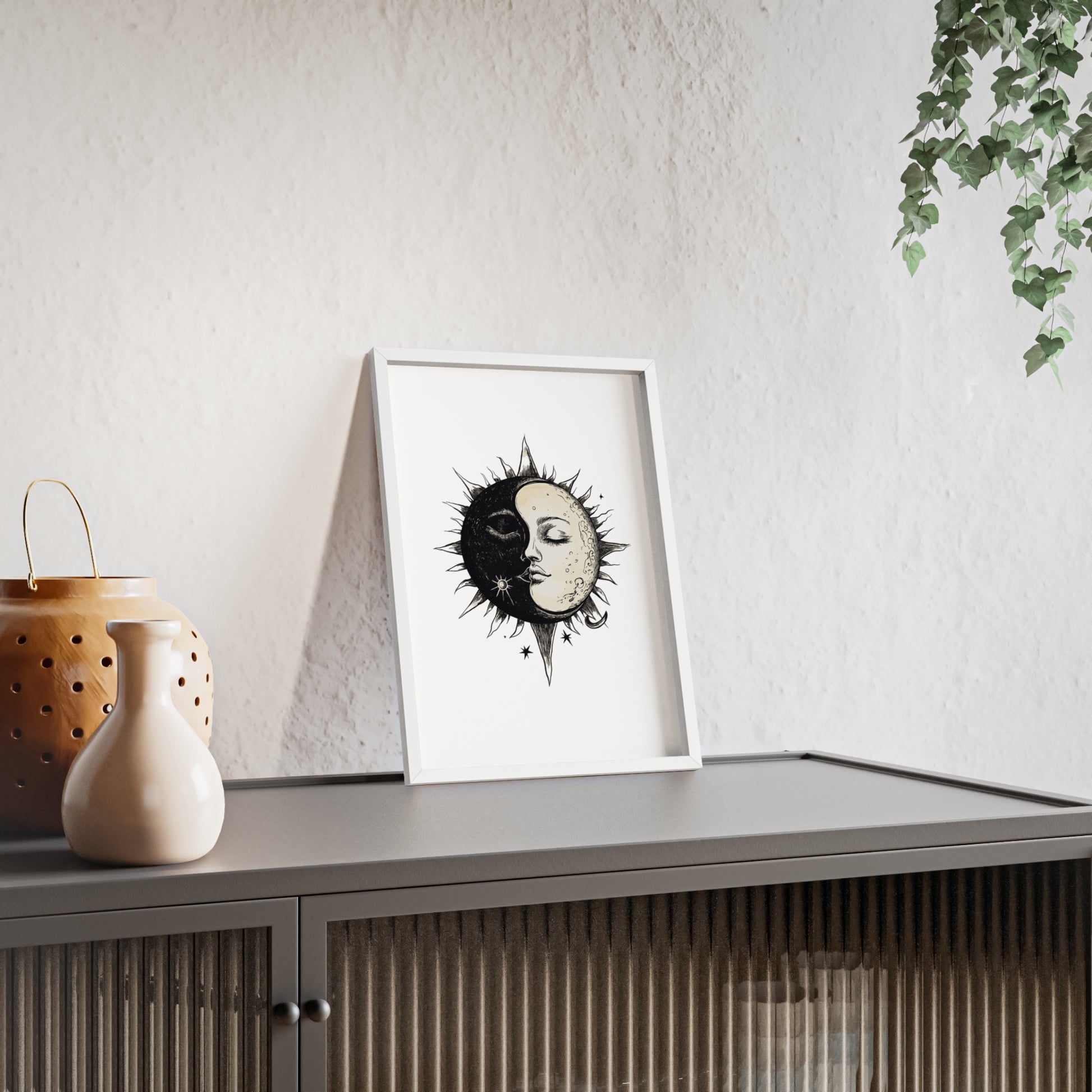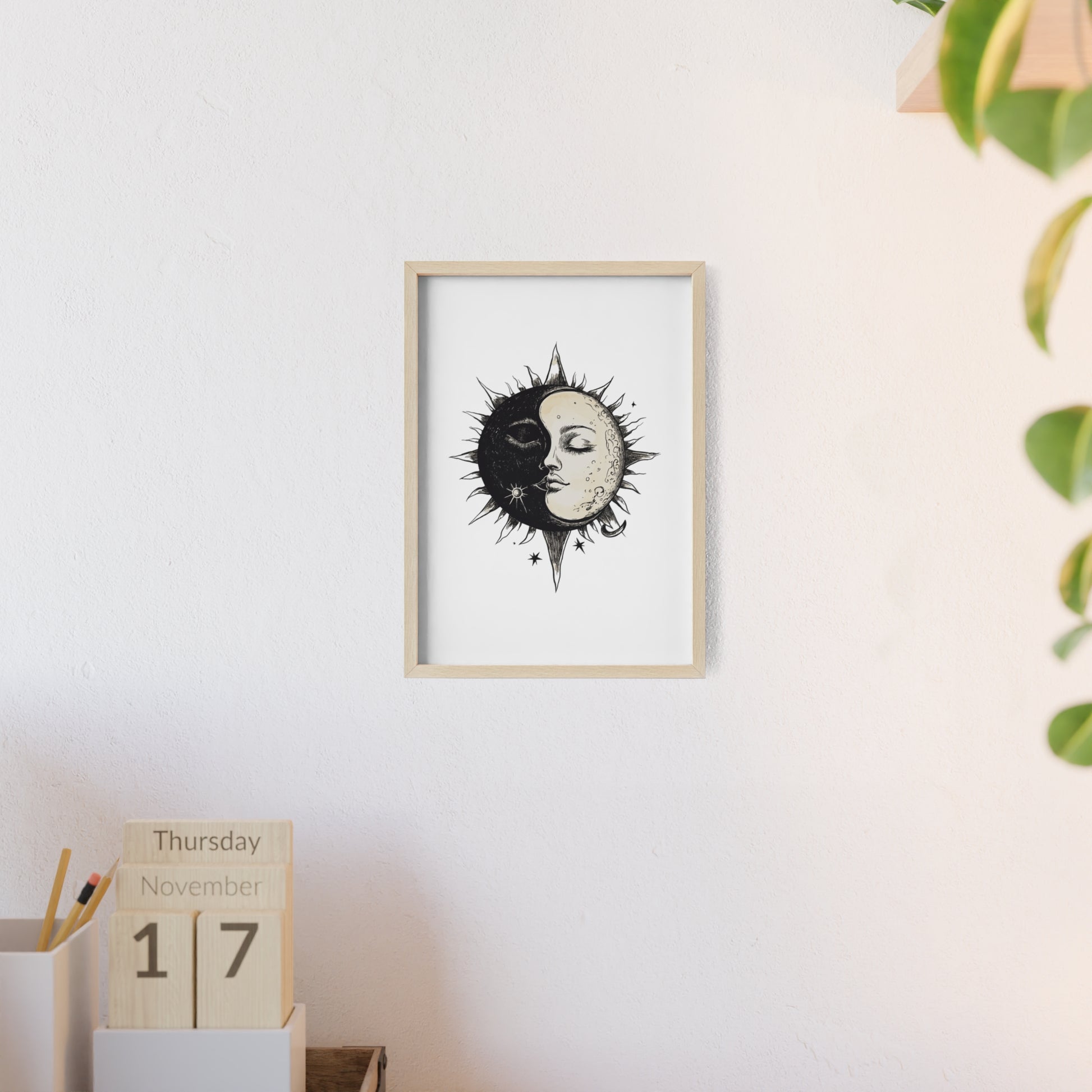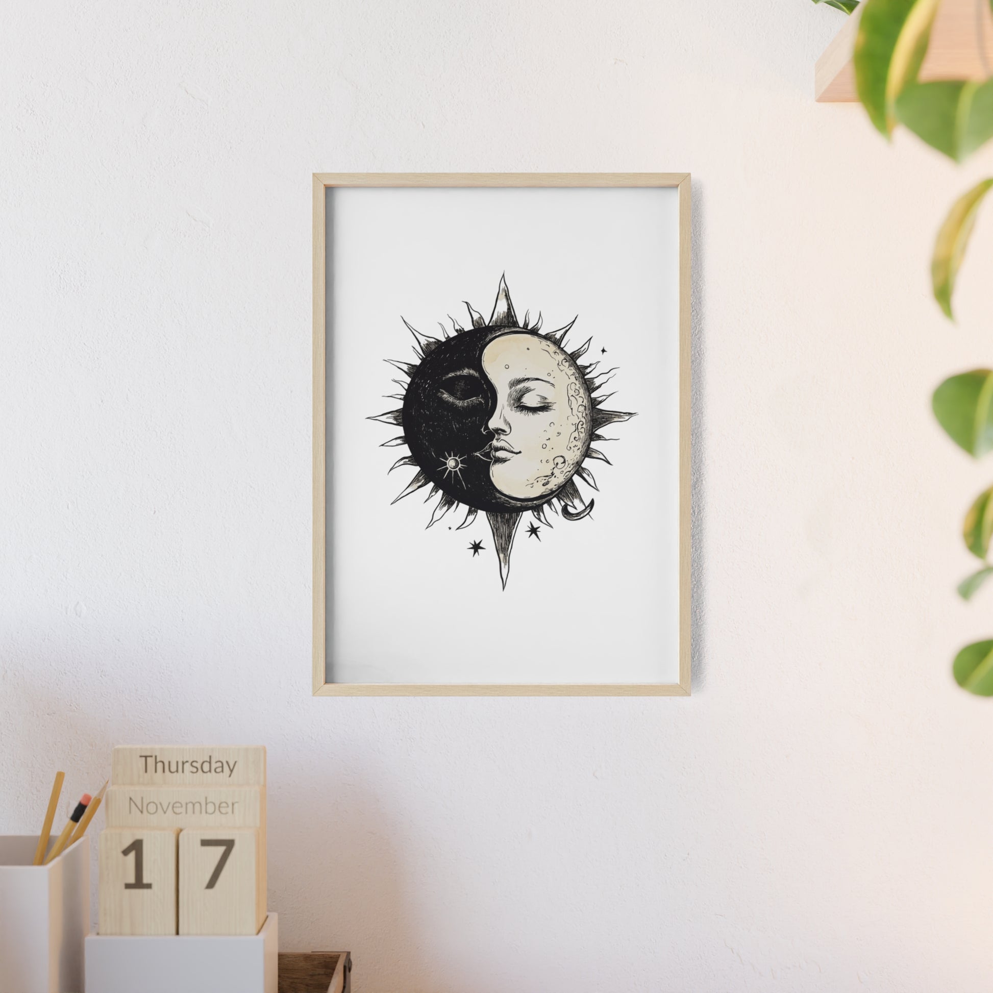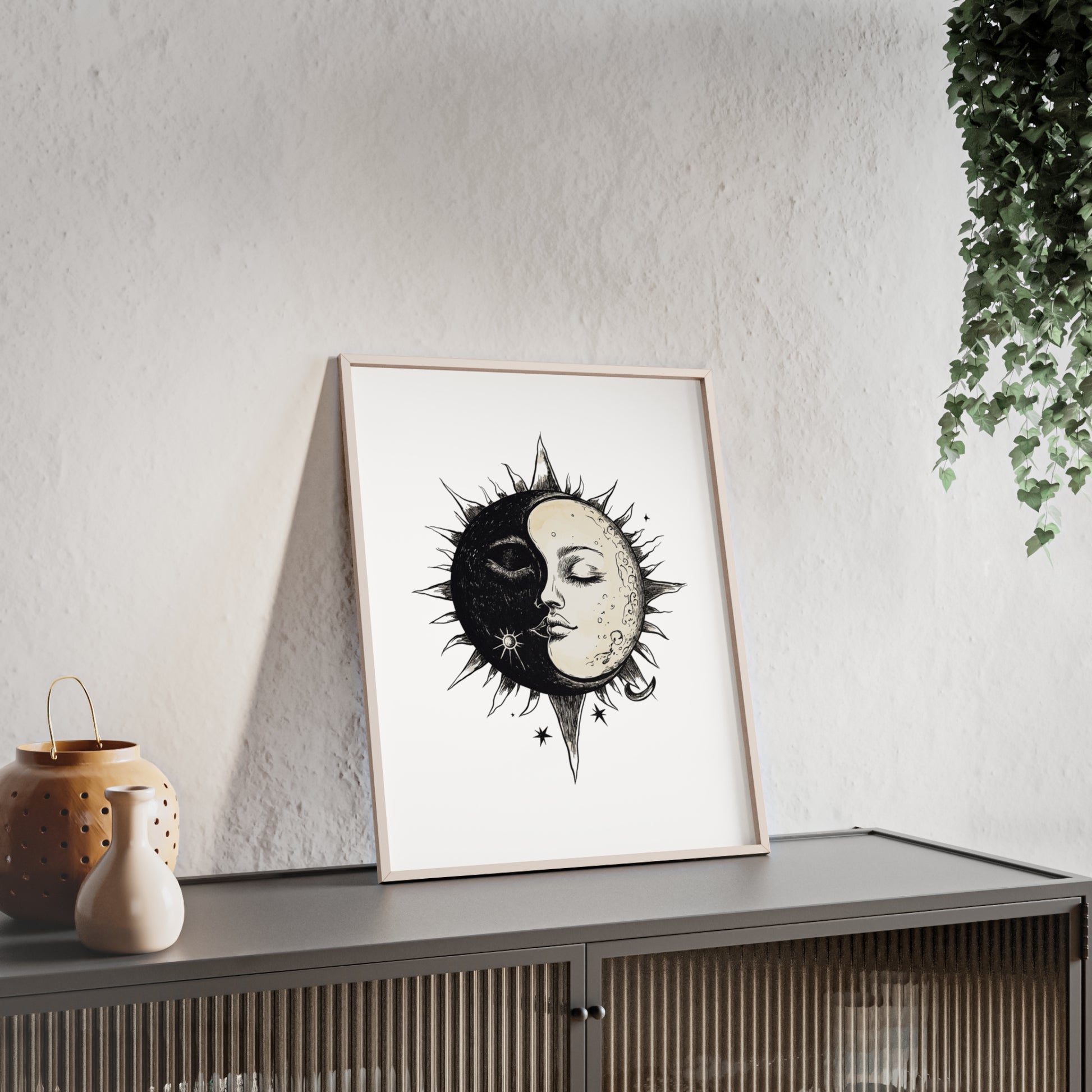 Sonne und Mond symbolisieren Gegensätze, die einander ergänzen – Stärke und Sanftheit, Licht und Schatten, Körper und Seele. Dieses Sonne-und-Mond-Poster erinnert daran, im Gleichgewicht zu bleiben und das Leben in seiner Ganzheit zu umarmen.